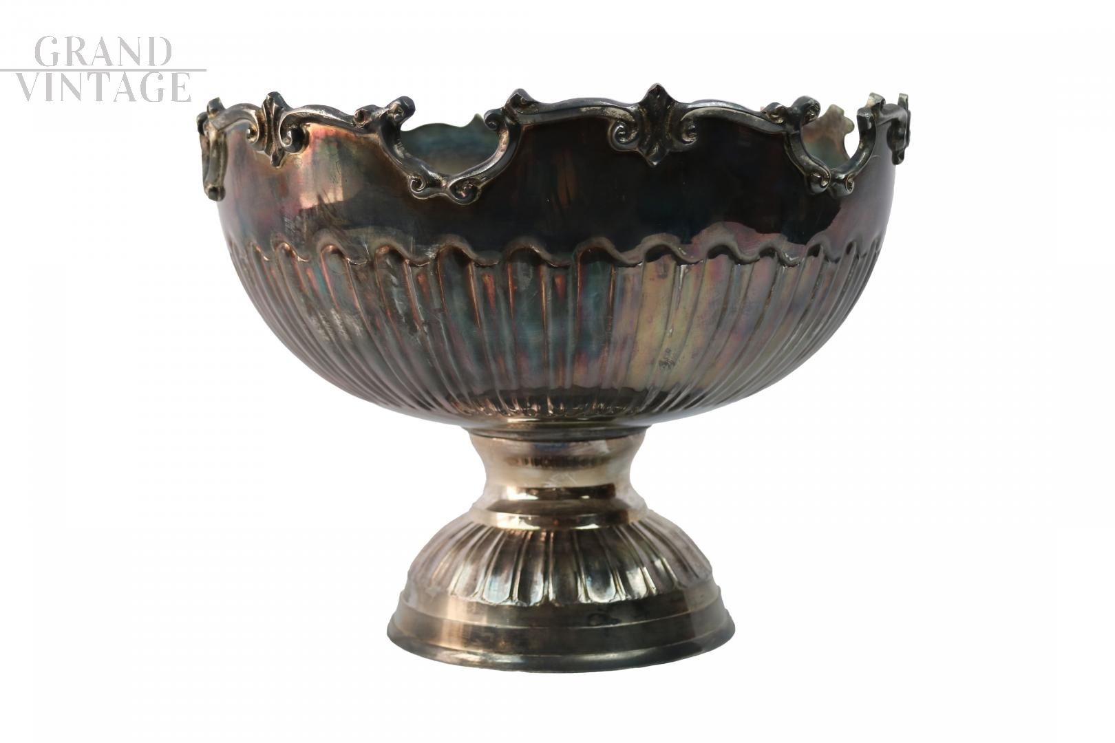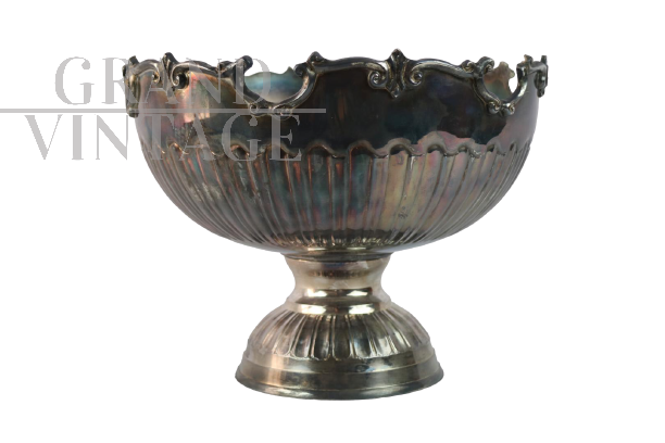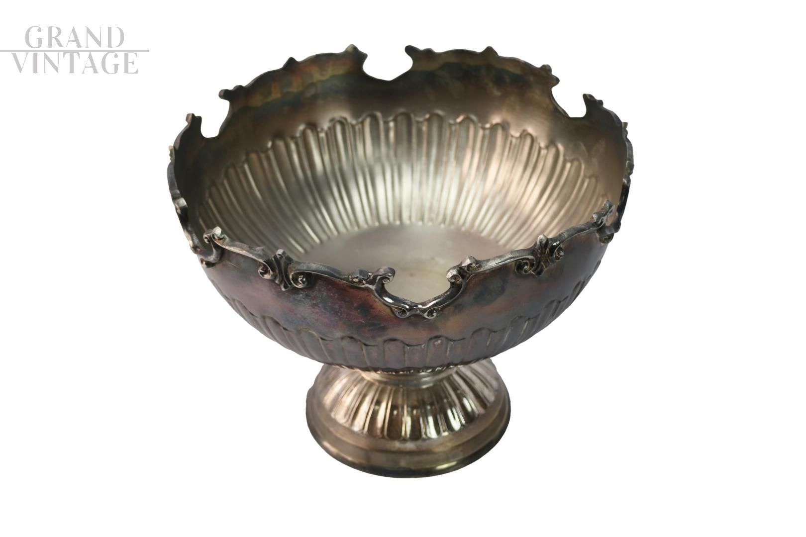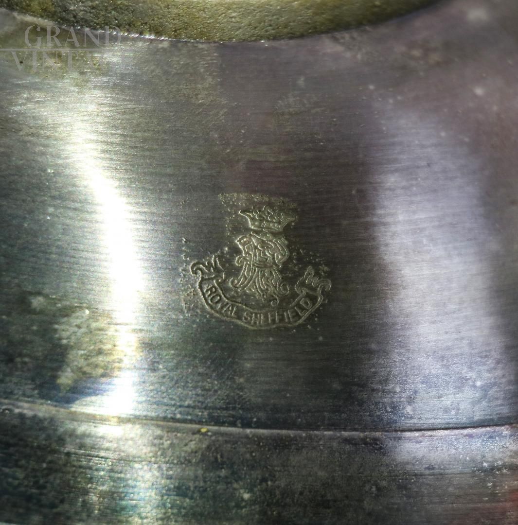 Centrotavola in Royal Sheffield rotondo, smerlato al bordo e cesellato, realizzato in placcatura d’argento dalla Royal Sheffield come da marchio sul fondo, in buone condizioni.