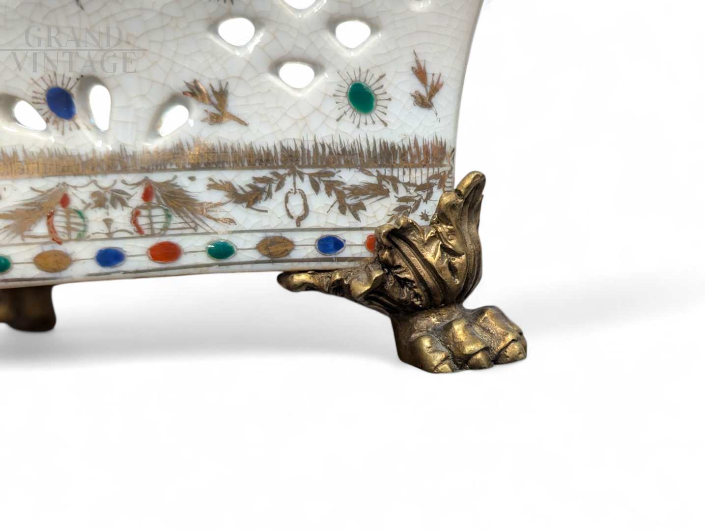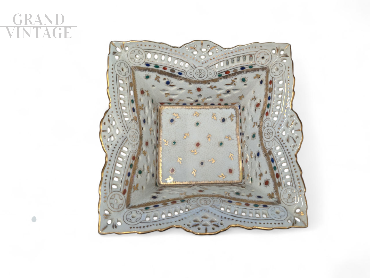 Elegante centrotavola in porcellana smaltata, realizzato dalla celebre manifattura United Wilson (marchio visibile sul fondo), attiva a Hong Kong nel XIX e XX secolo e nota per la produzione di oggetti di pregio in stile orientale destinati al mercato europeo. Questa raffinata creazione presenta una forma svasata quadrangolare dai bordi ondulati, decorata con smalti policromi e dorature, in un tripudio di motivi floreali e geometrici tipici dello stile orientale ottocentesco. L’interno e l’esterno della vasca sono finemente lavorati, con trafori ornamentali che conferiscono leggerezza e pregio all’opera. dimensioni 10 x 20 x 20 cm (altezza, larghezza, profondità)