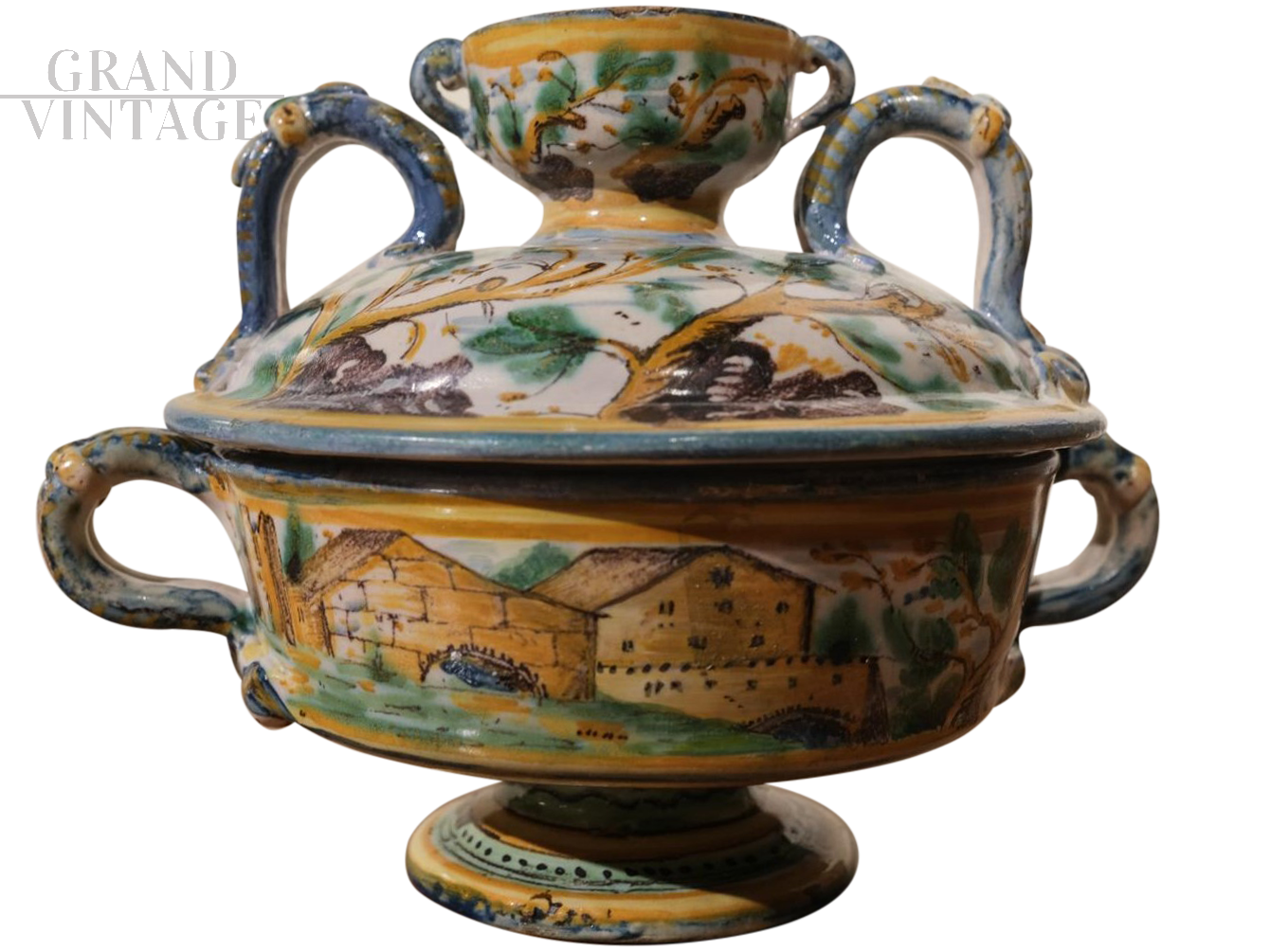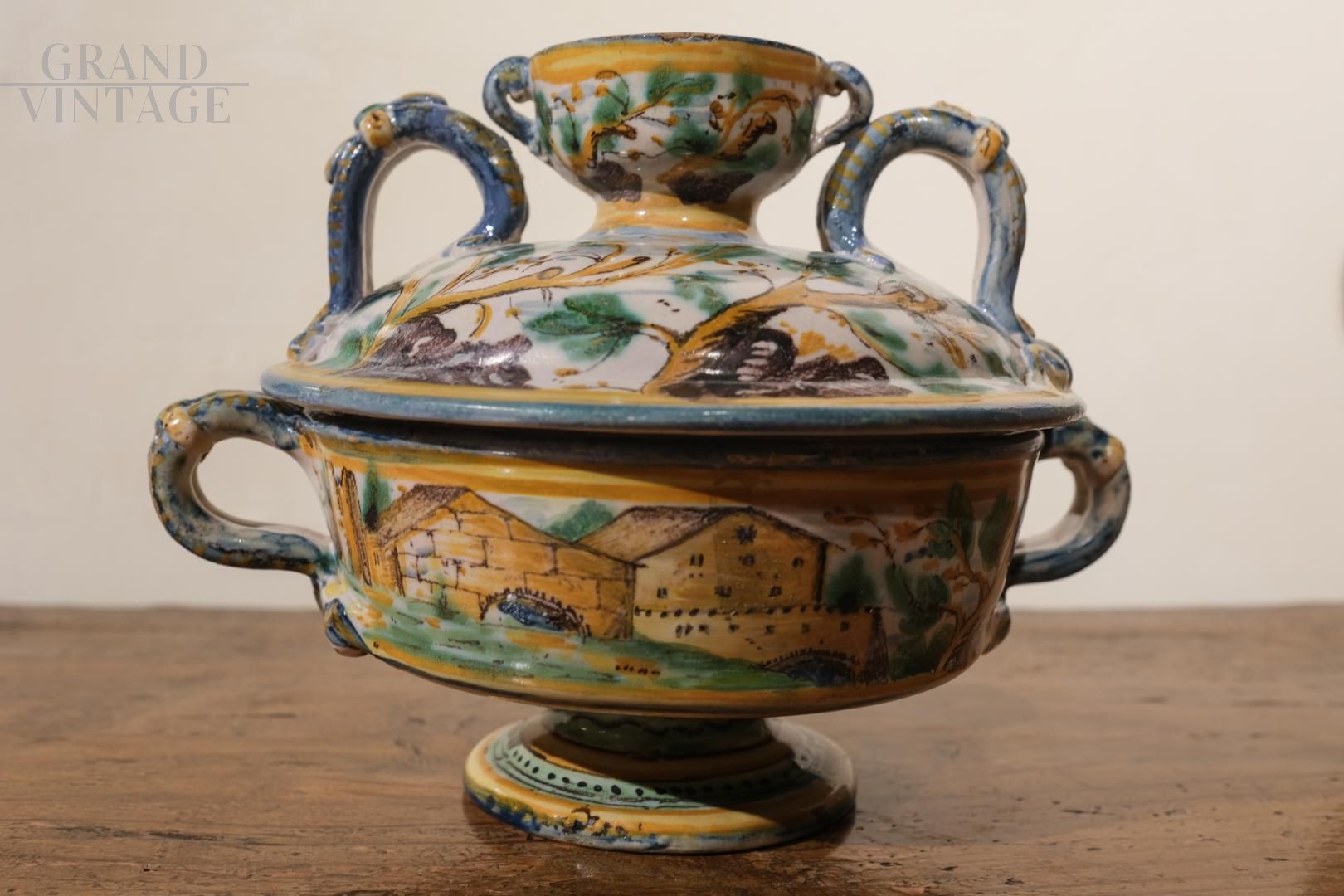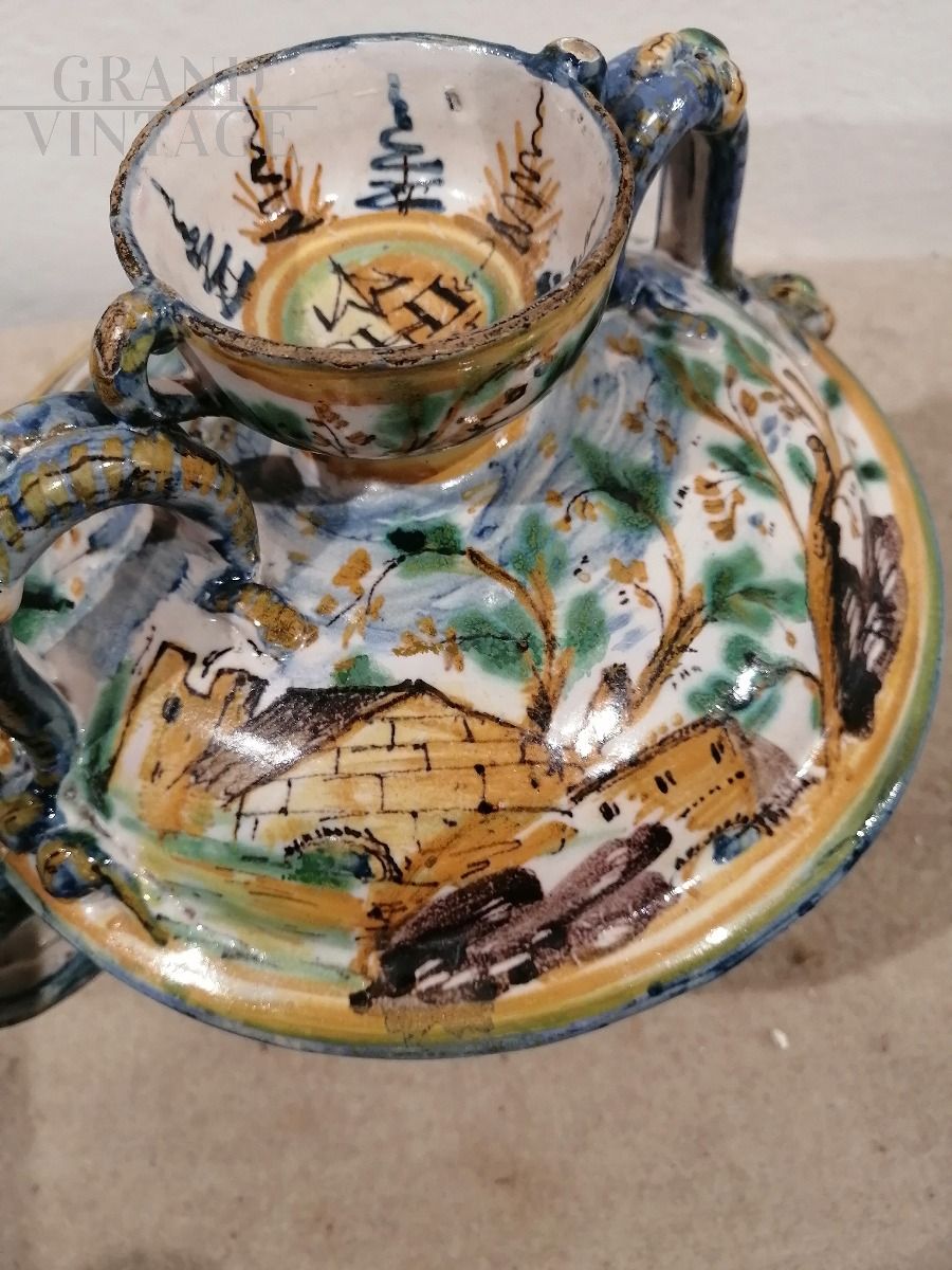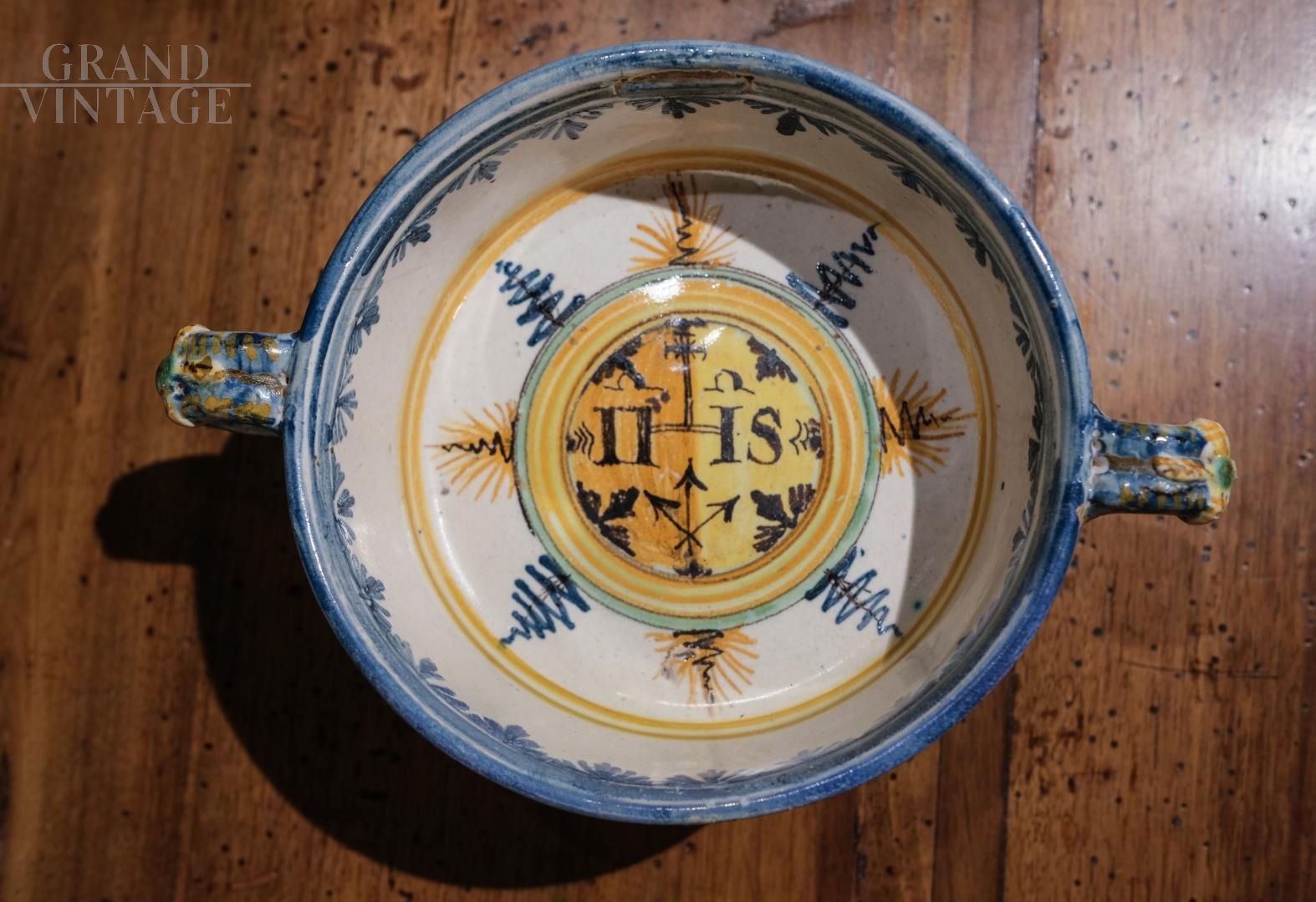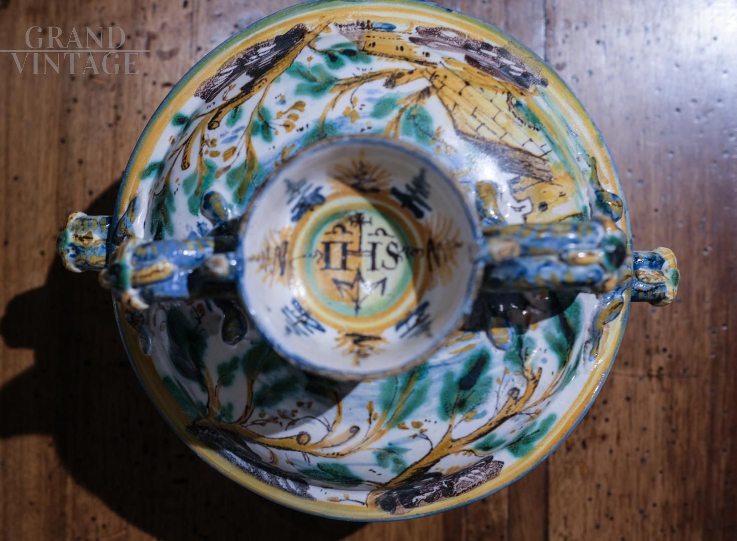 Rarissima ceramica delle Marche, XVII secolo, con simbolo IHS - Tazza da brodo con coperchio portauovo impagliata.