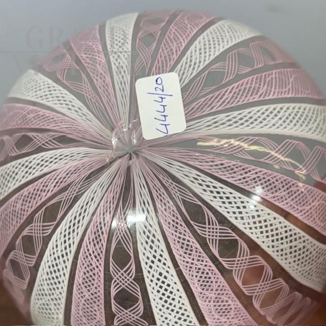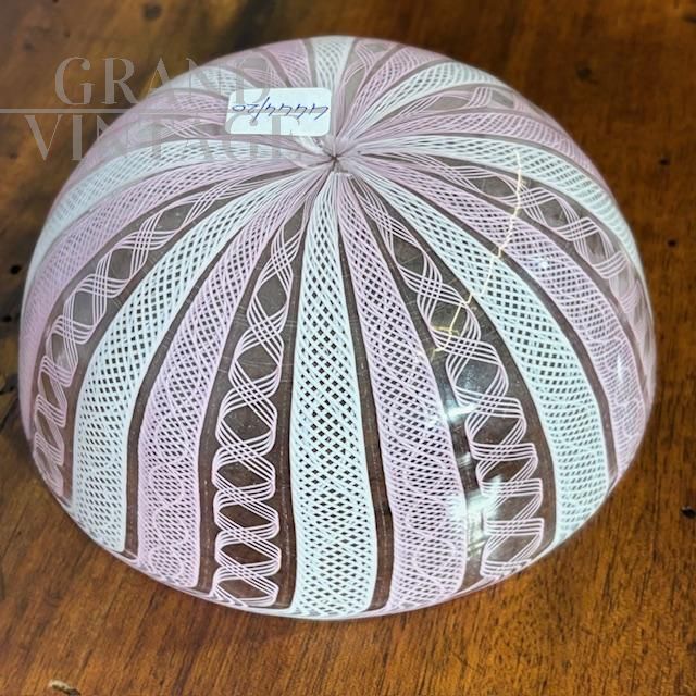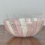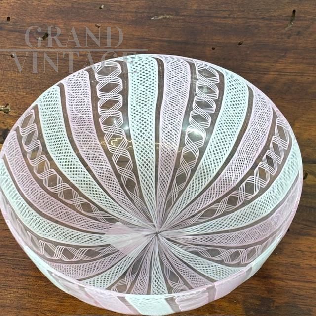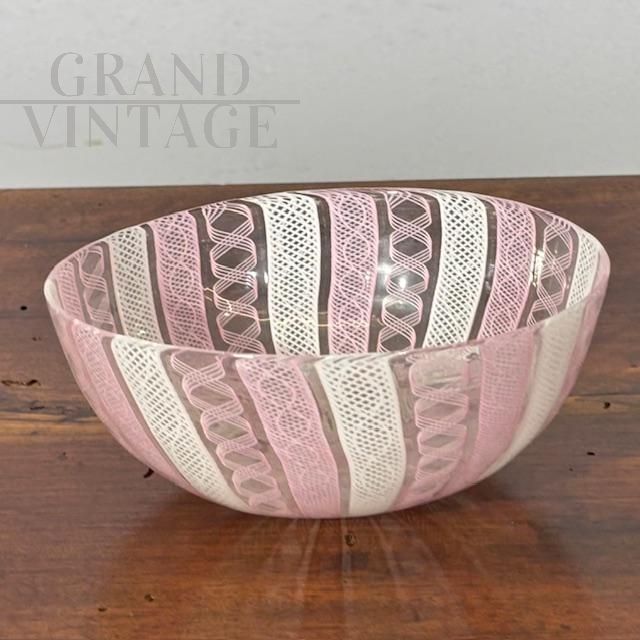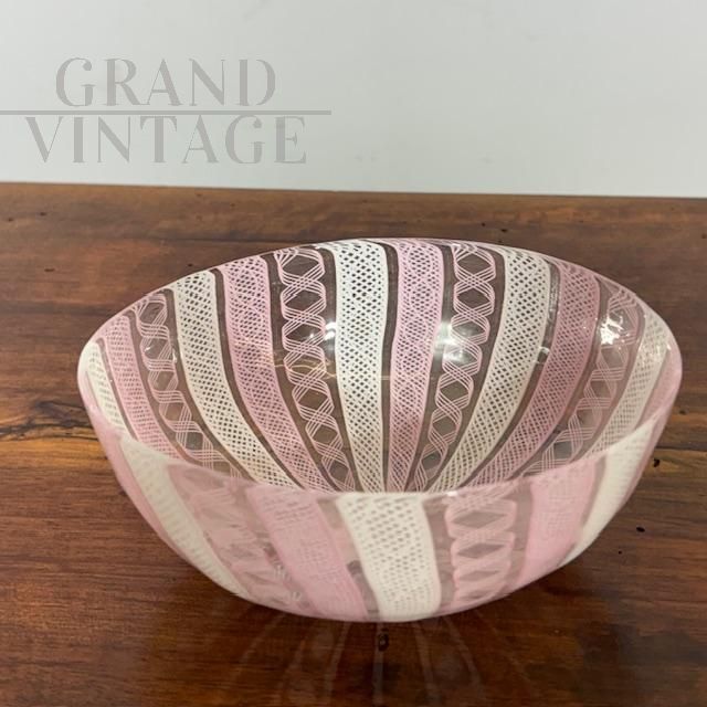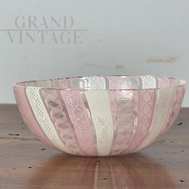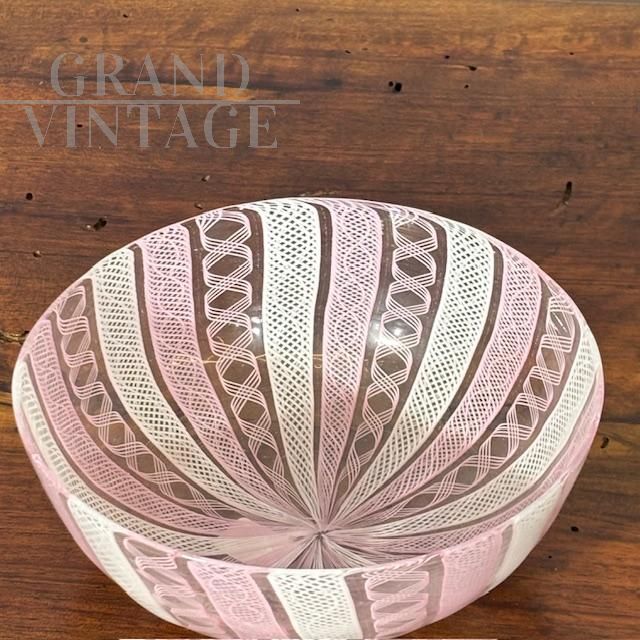 Antica ciotola centrotavola di Salviati in vetro di Murano artistico zanfirico con una fine lavorazione a filigrana intrecciata nei colori rosa e bianco, realizzata alla fine dell'800. Un importante oggetto da collezione, in perfetto stato.