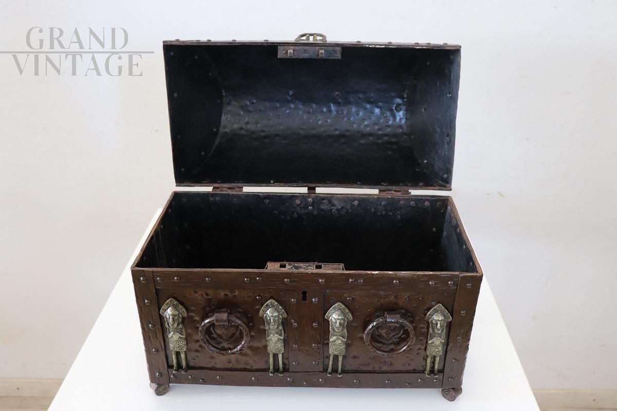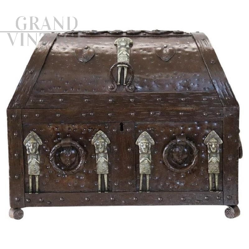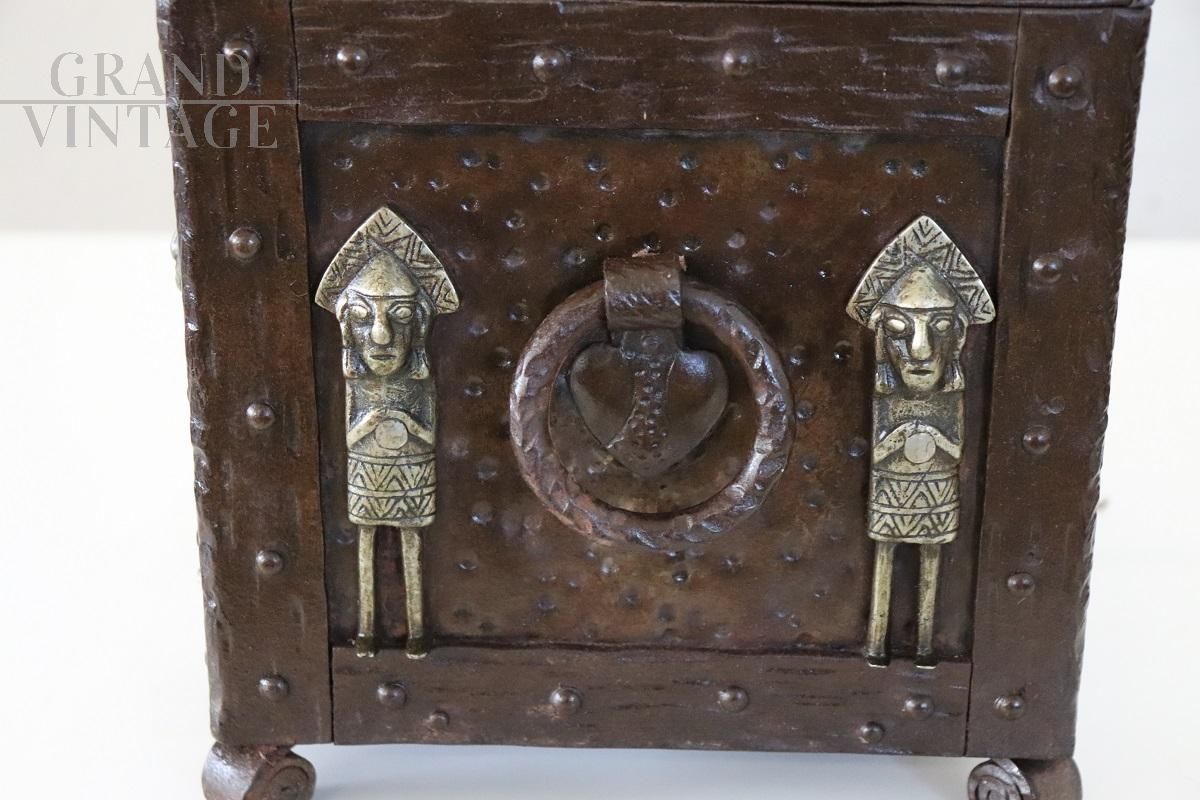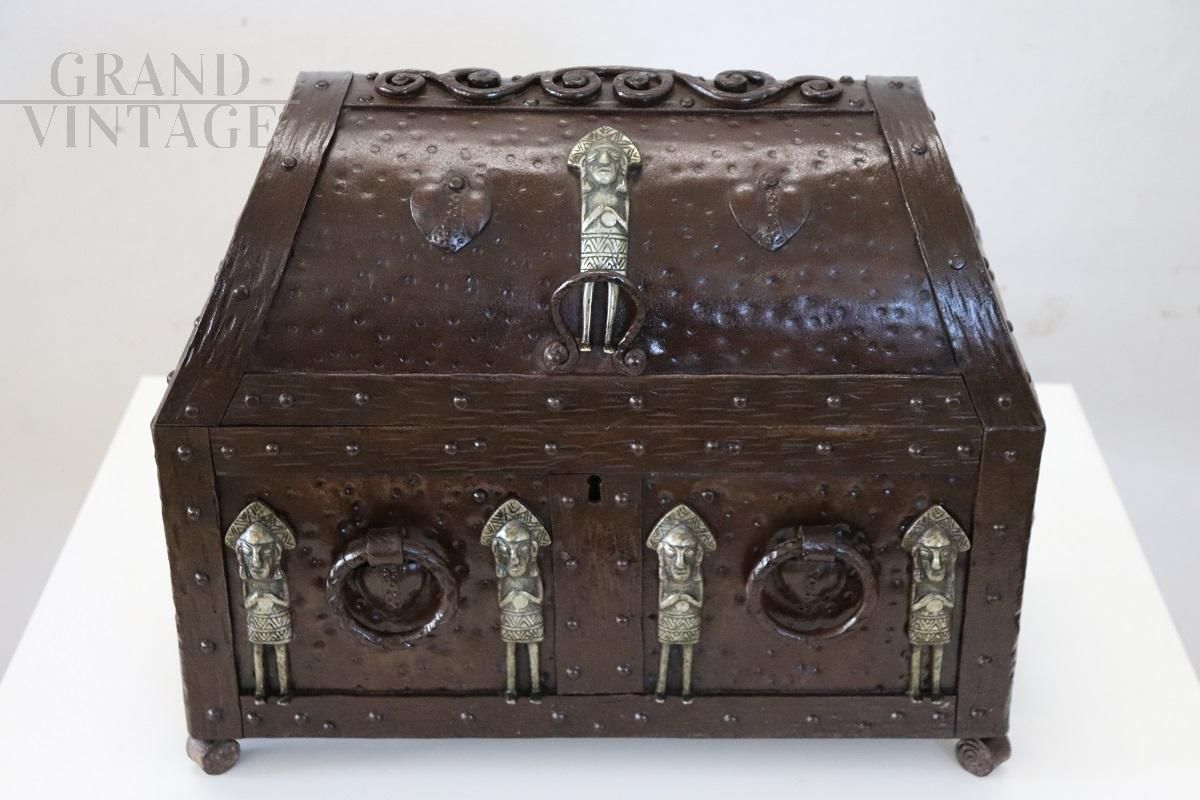 Bellissima e rara piccola scatola portagioie databile all'inizio del XX secolo; realizzata interamente in ferro con decorazioni in ottone, questo portagioie ha caratteristiche di ispirazione gotica. Un oggetto decorativo unico con un fantastico fascino antico. Si può scegliere di utilizzarlo in vari modi, per contenere documenti, piccoli oggetti o gioielli. Esposto su un comò o una credenza antica, catturerà sicuramente l'attenzione e la curiosità di tutti i vostri ospiti. Si noti che la serratura è presente ma manca la chiave. Nel caso desideraste ripristinare la serratura è possibile trovare una chiave compatibile, che ovviamente non sarà quella originale.Ottime condizioni. prezzo trattabile.