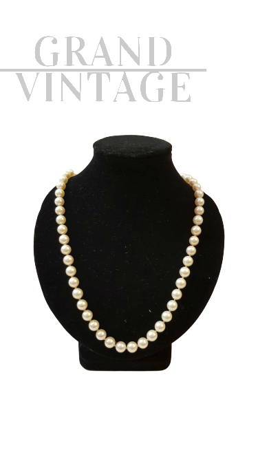 Collier vintage in perle di coltura diametro variabile da 7,4 a 7,8 mm, con montatura in oro grigio 18 K e piccoli diamanti.