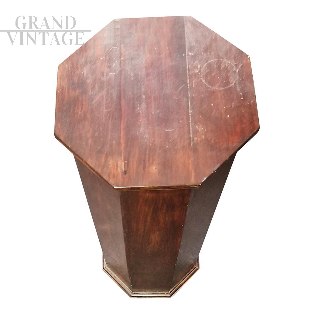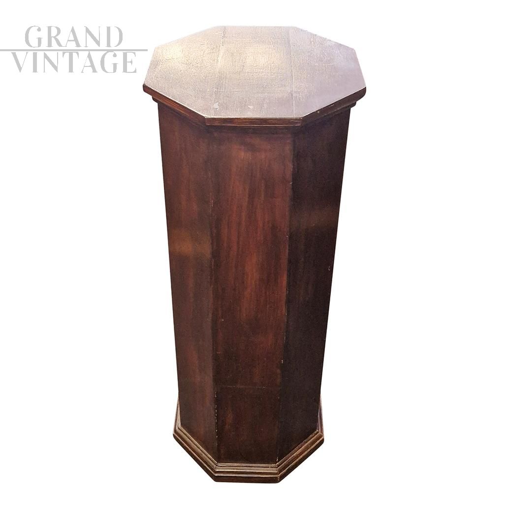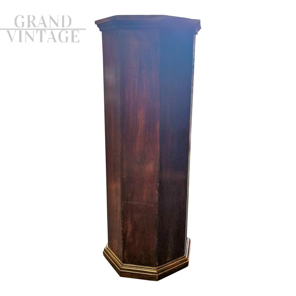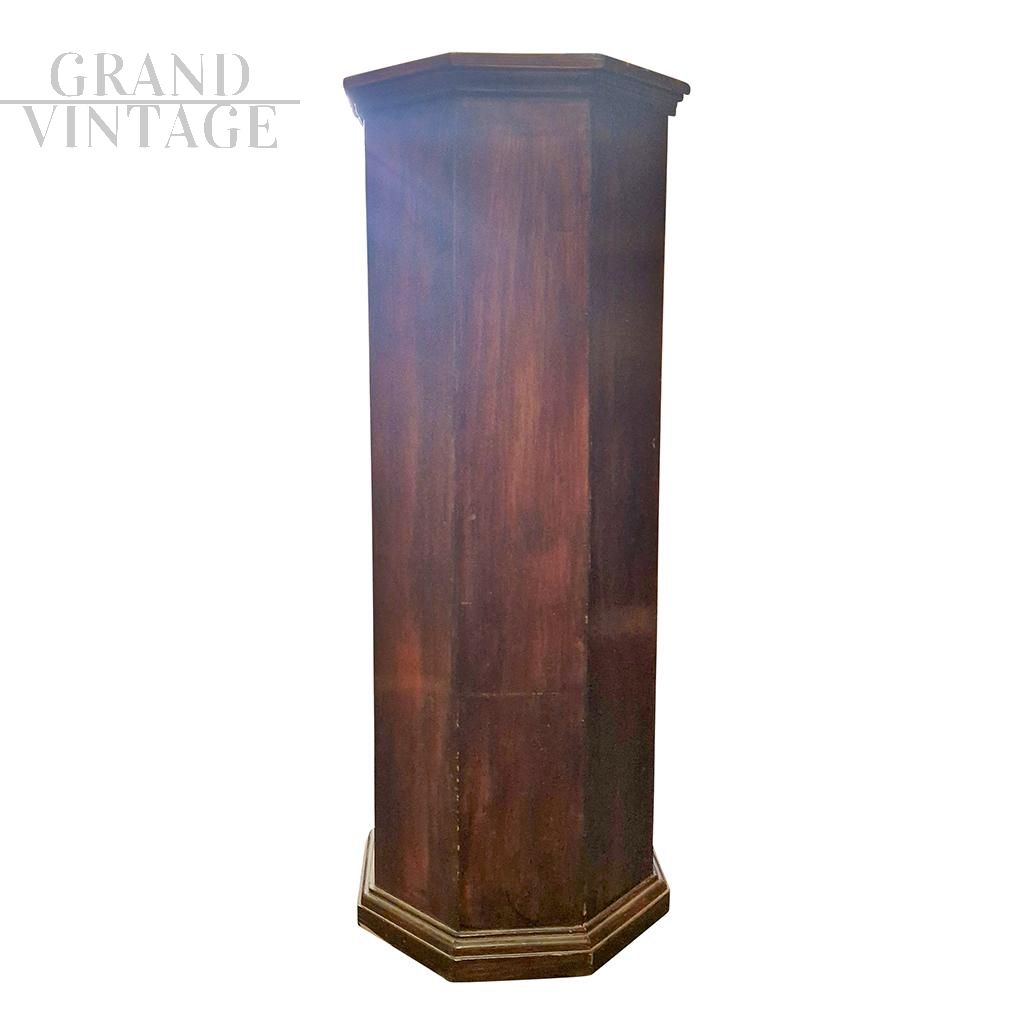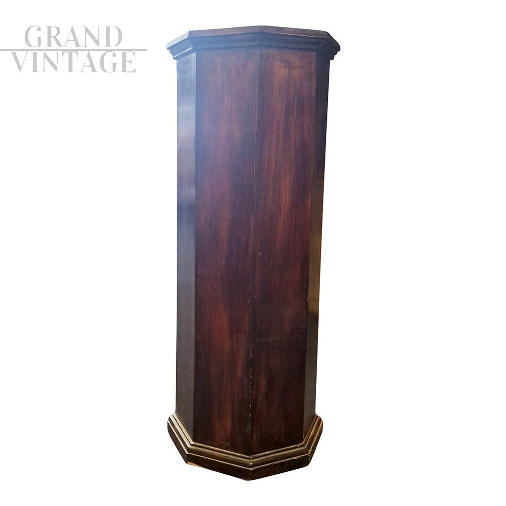 Colonna ottagonale antica realizzata in legno di noce e radica di noce antichi di riciclo lastronati con spessore 3 mm su legno di abete massello, XIX secolo.