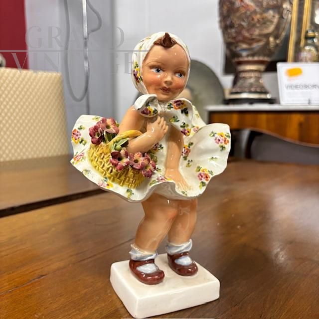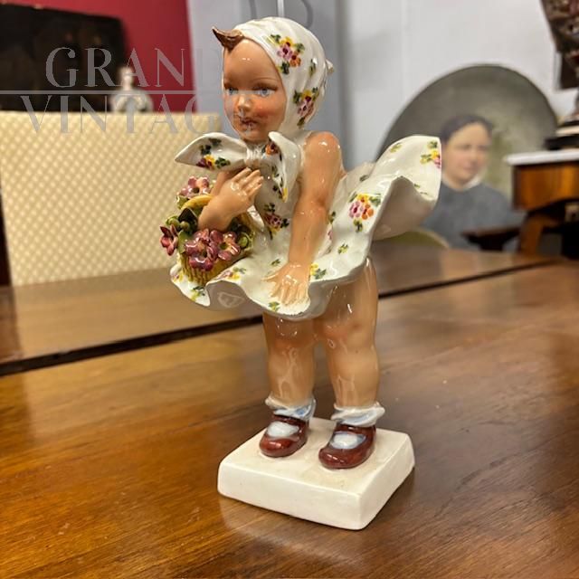 Scultura in ceramica dal titolo Colpo di Vento realizzata da Carlo Mollica, raffigurante una bambina con la gonnellina sollevata da una folata di vento, Italia anni '40, in perfetto stato.