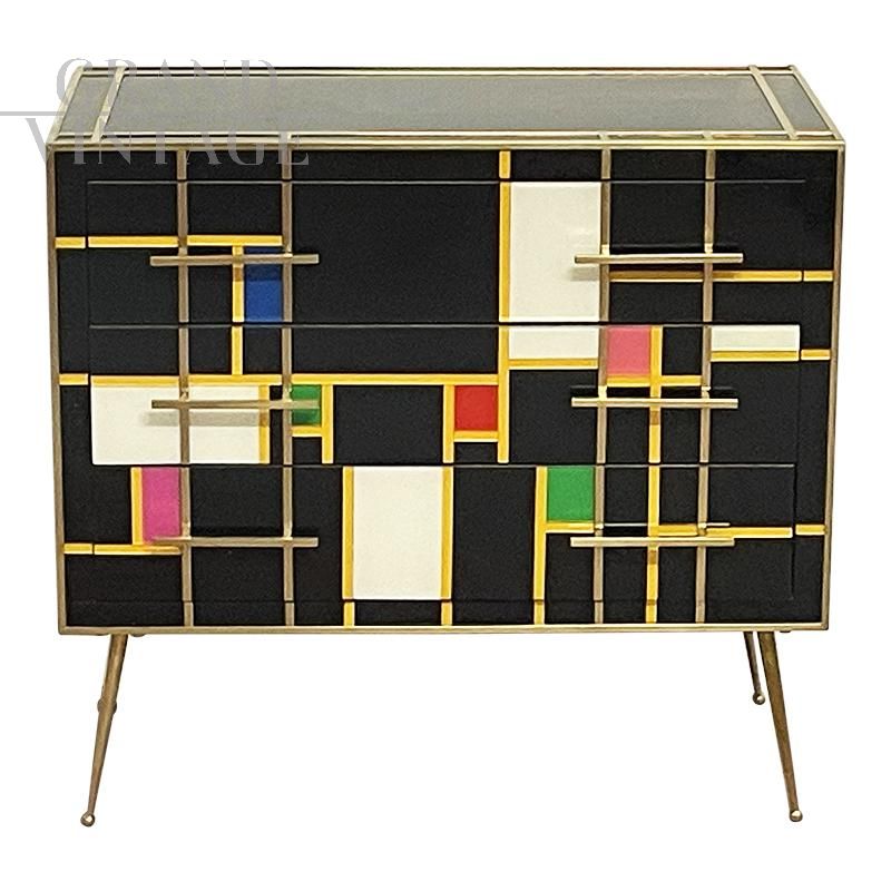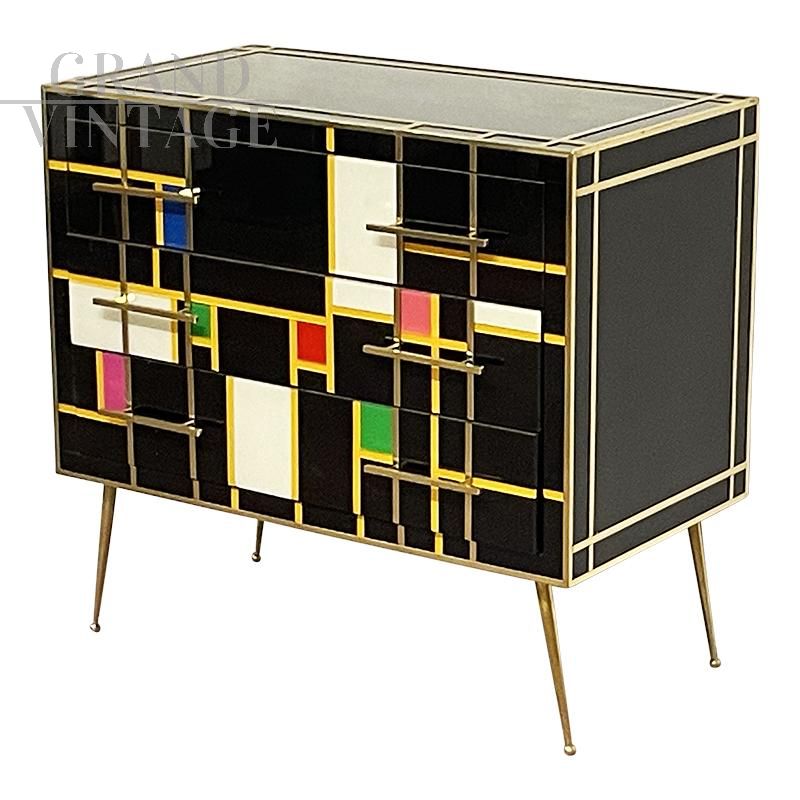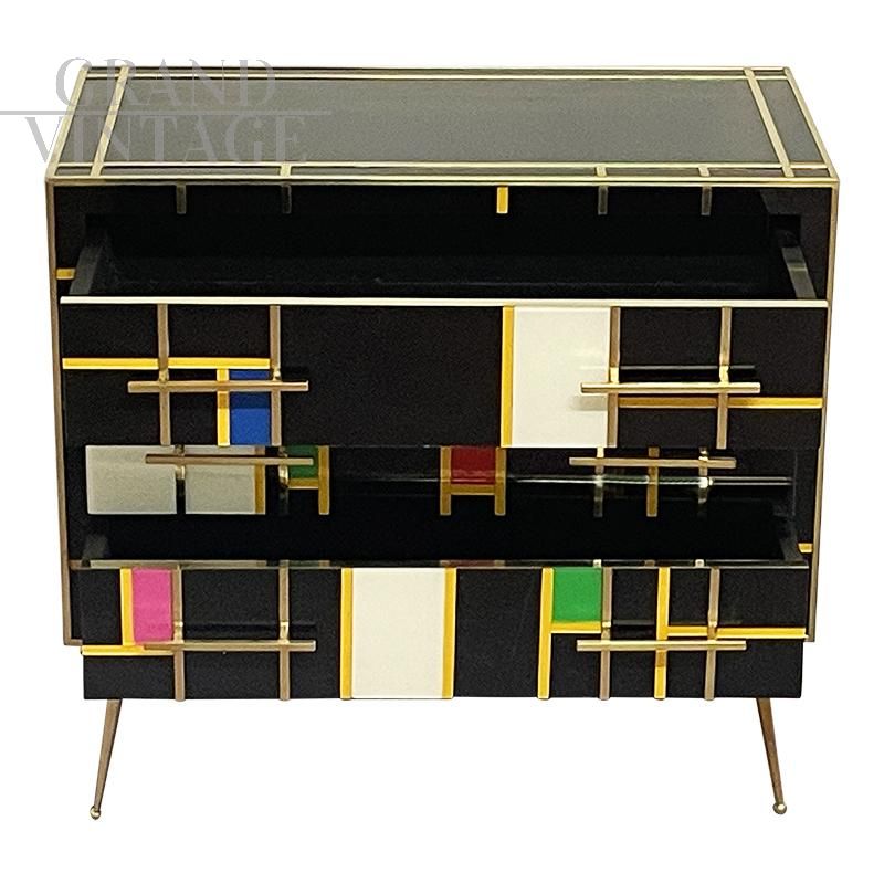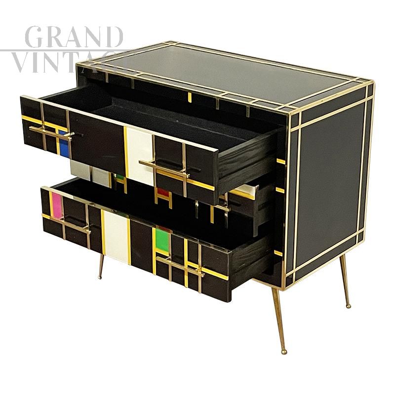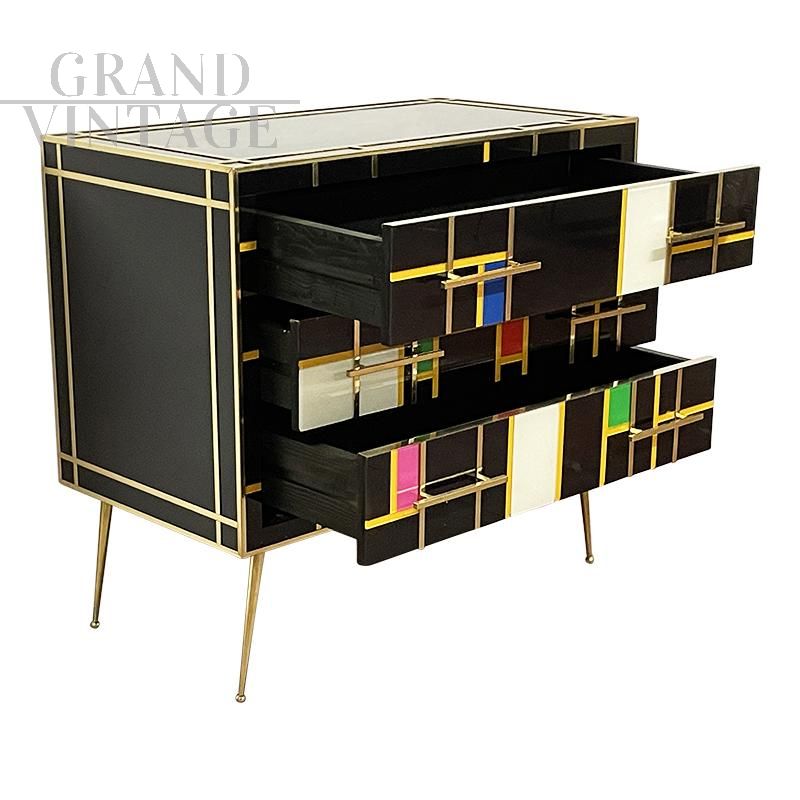 Comò a tre cassetti interamente realizzato a mano, con struttura in legno e ricoperto in vetro nero e colorato, con profili, maniglie e piedi in ottone dorato.