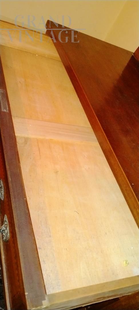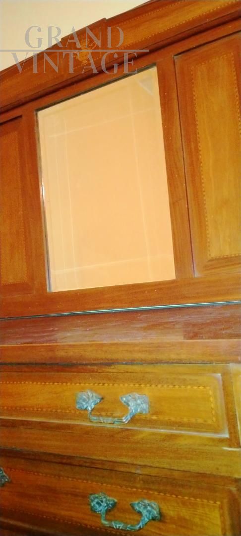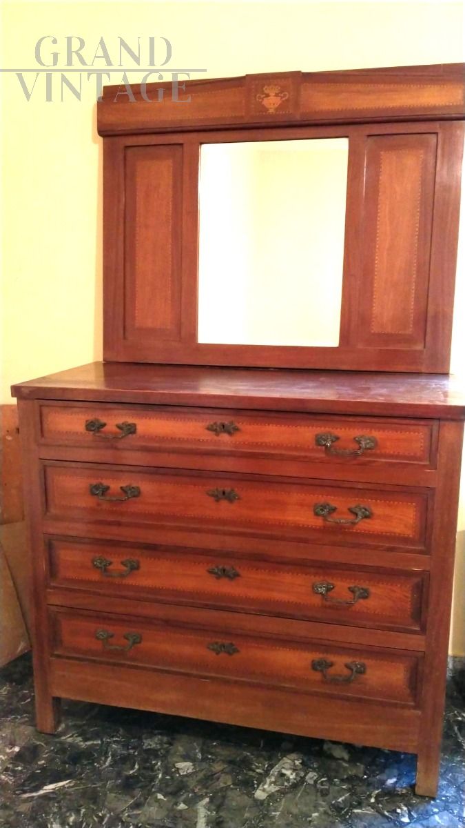 Cassettone comò anni '40 con specchiera, intarsiato sui cassetti e sulla cornice dello specchio.