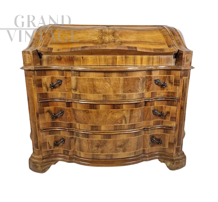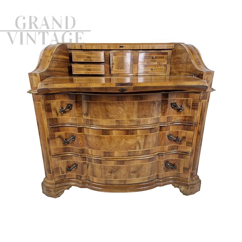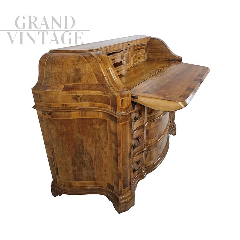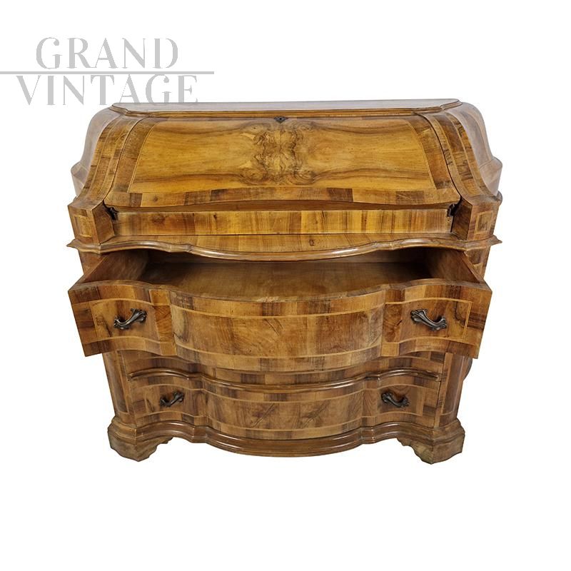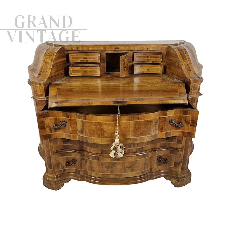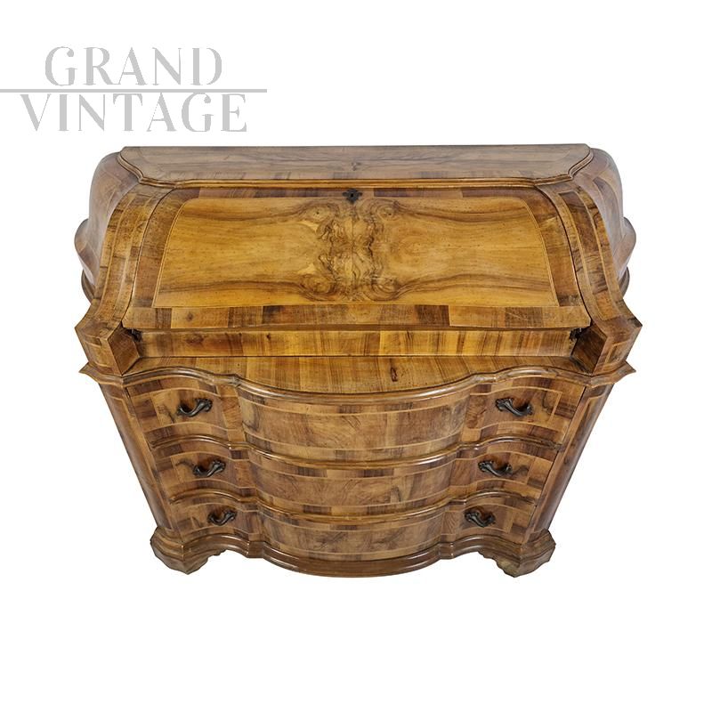 Comò a ribalta antico veronese originale di fine ‘800, dalle linee mosse su tutte le superfici a vista, in pregiata radica di noce. Nella parte inferiore si trovano tre cassettoni, mentre nella parte superiore la calatoia frontale cela al suo interno un piano scrittura, quattro cassettini e un piccolo vano centrale chiuso da un'antina. Ferramenta originale in bronzo.