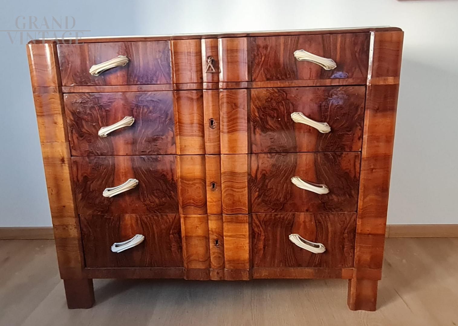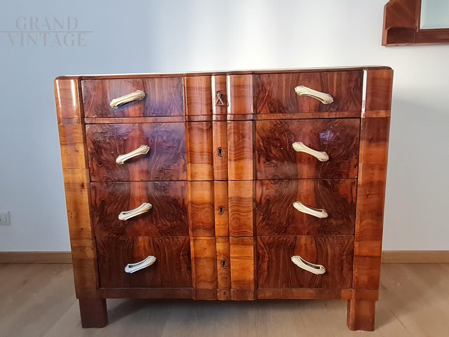 Elegante e particolare comò Art Déco anni '40 in radica di noce, costituito da 4 cassetti con maniglie in bachelite, in ottimo stato.