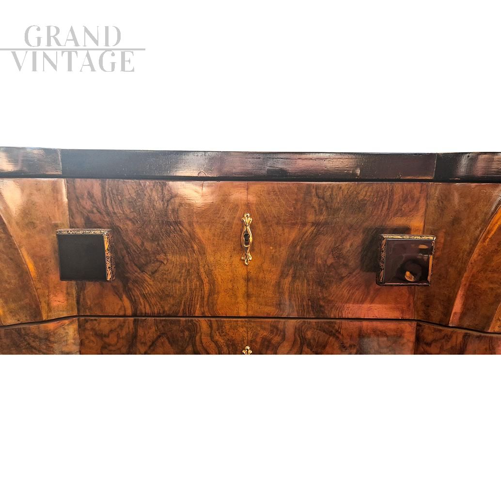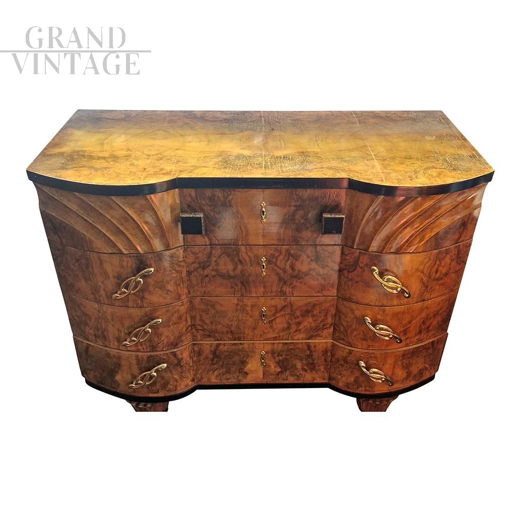 Comò originale Art Déco italiano anni '30 - '40 impiallacciato in radica di noce, con frontale mosso e quattro cassetti. Piedi intagliati e bordature nere lucide. Piano impiallacciato in piuma di noce. Maniglie in ottone dorato a forma di chiave di sol e pomoli quadrati neri.