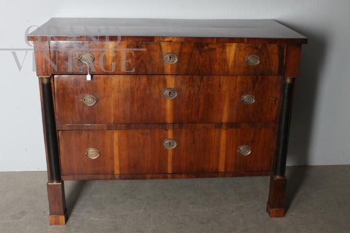 Antico comò cassettone Impero bolognese dei primi dell'800, realizzato in noce massello con cassetti impiallacciati in noce, ai lati sono presenti due mezze colonne ebanizzate nere con bronzi. Serrature e ferramenta sono coeve, come ogni sua parte. Restaurato mantenendo la sua patina, con finitura a cera d’api . Il mobile è composto da due cassetti e ½ ed è pronto da inserire nella stanza.