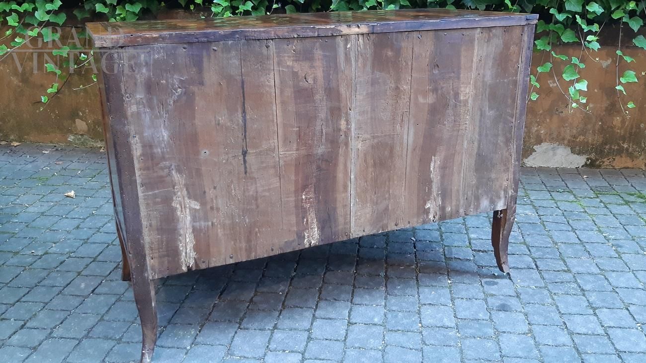 Raffinato comò cassettone antico del pieno '700 di epoca Luigi XVI di origini lombarde, completamente lastronato con differenti essenze di noce. E' ricco nel disegno strutturale, per via dei piedi a sciabola e dei "due cassetti più uno", e nel raffinato rivestimento, con quattro generi di filettature distinte in legni di ebano, ciliegio, acero e legno di rose. Mobile integro e consigliato dall'antiquario.