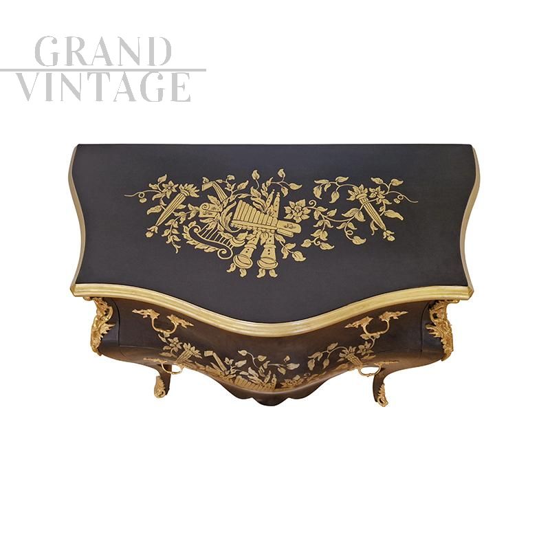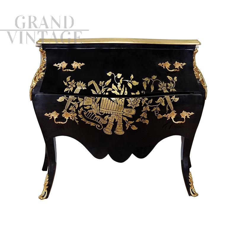 Comò in stile barocco antico dalla splendida forma mossa davanti e nei fianchi, dotato di 2 cassetti, realizzato in legno laccato nero decorato con motivi floreali e musicali dorati, arricchito con decorazioni in bronzo dorato, maniglie dorate e contorno del piano sagomato dorato.