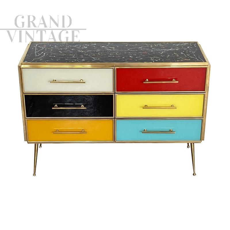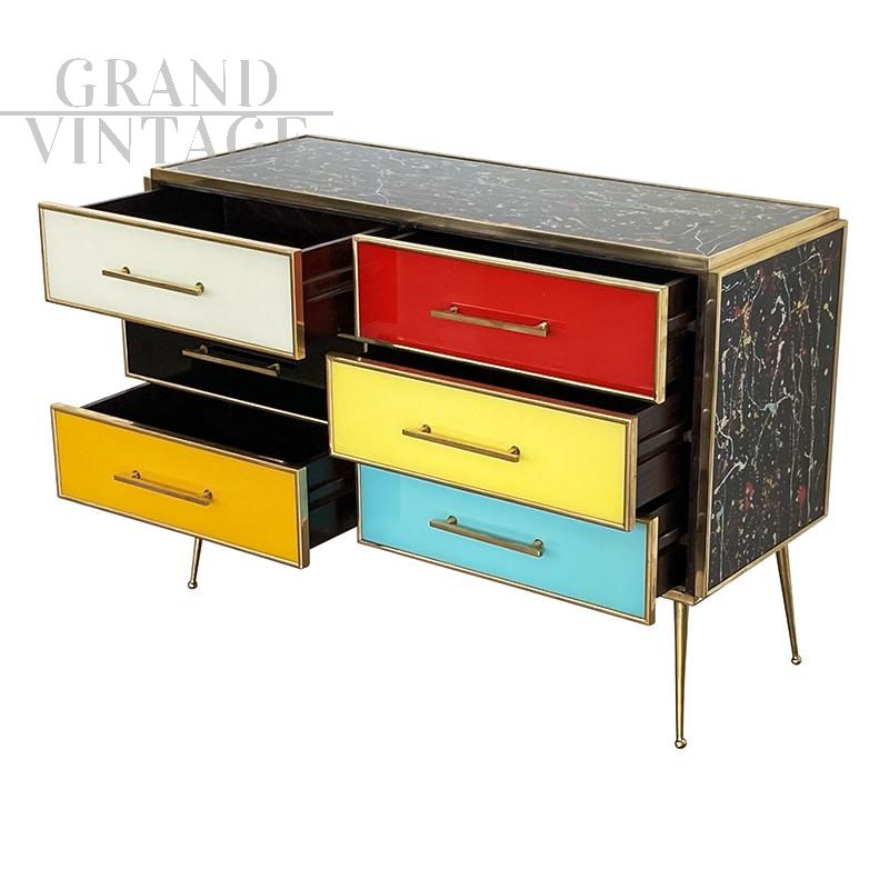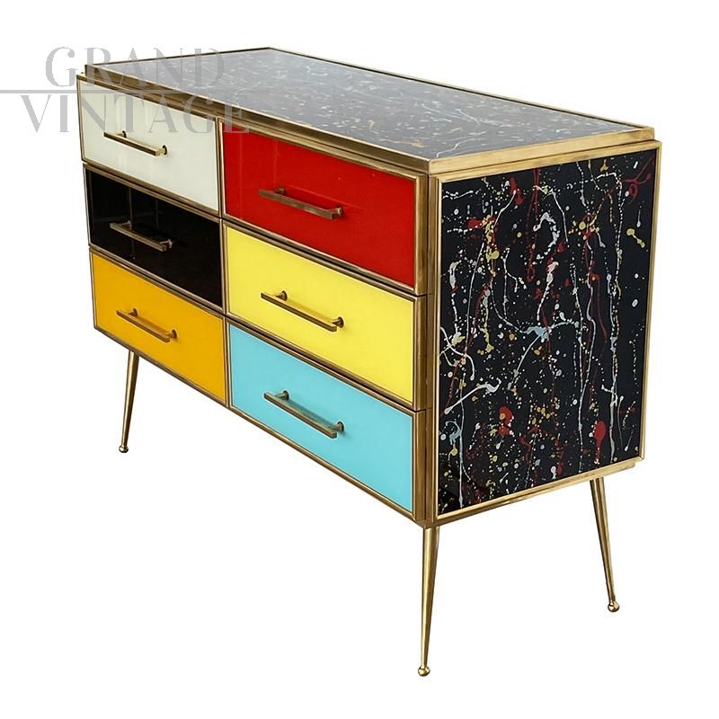 Comò in stile vintage a 6 cassetti interamente realizzato a mano, con struttura in legno ricoperta in vetro nero decorato a schizzi colorati in stile Pollock, e in vetro multicolore sui cassetti, caratteristico degli anni ’50; profili e piedi in ottone dorato.