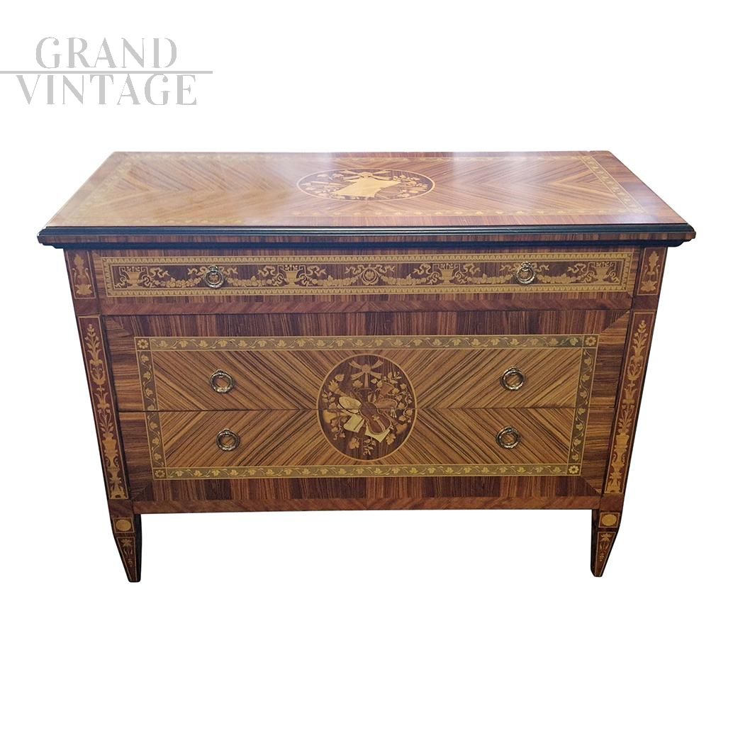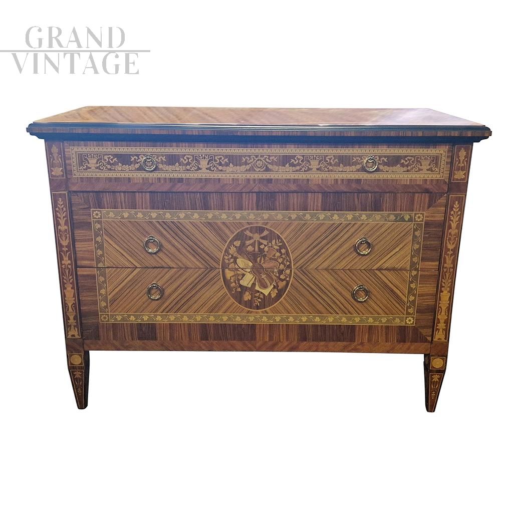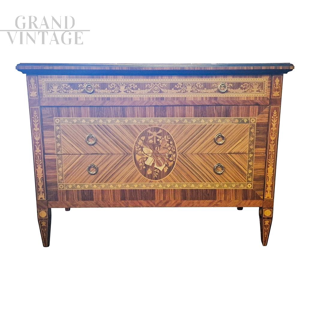 Comò lombardo in stile antico Luigi XVI con intarsi musicali