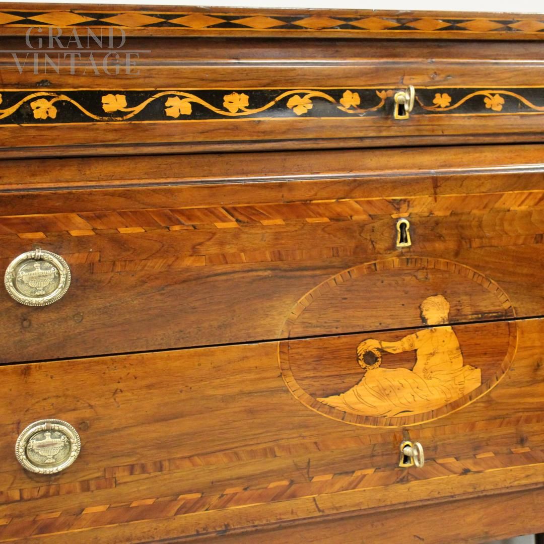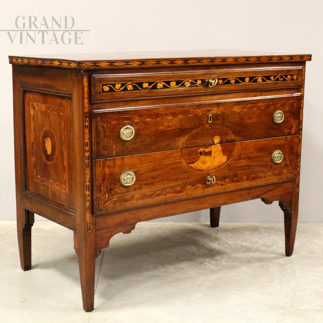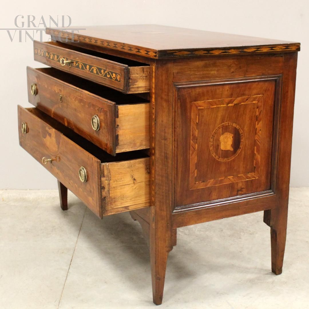 Comò Luigi XVI lombardo in noce intarsiato, Italia '700