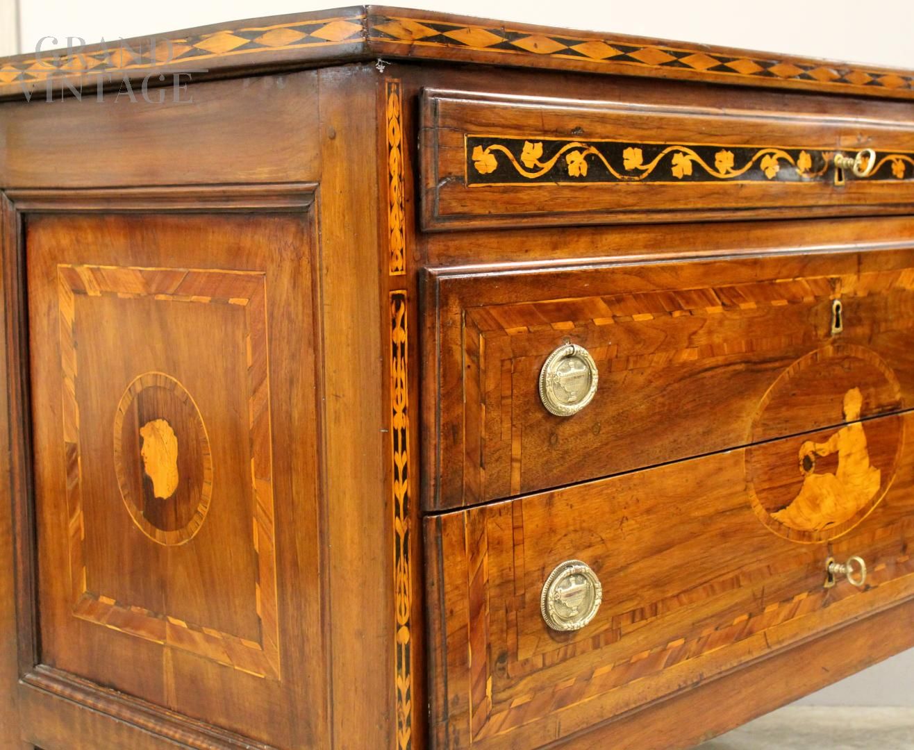 Cassettone comò antico lombardo di epoca Luigi XVI a tre cassetti realizzato in noce massello elegantemente intarsiato e filettato in vari legni pregiati, Italia - Lombardia 1700, restaurato.