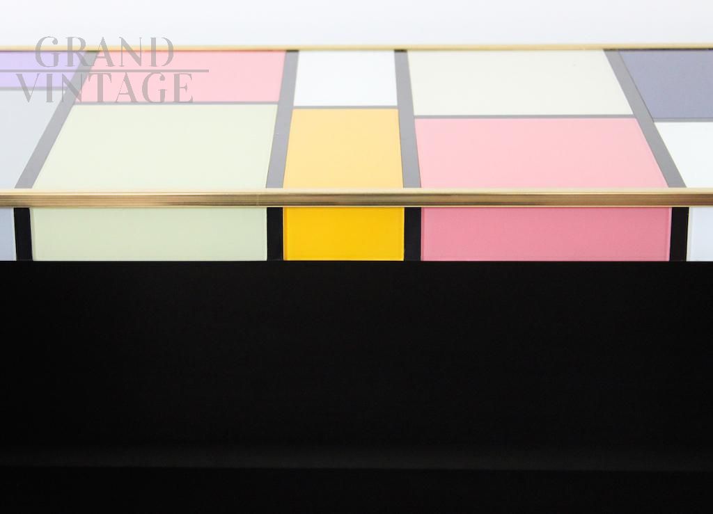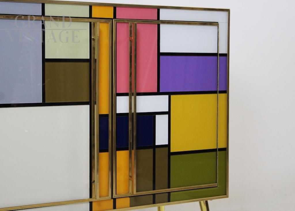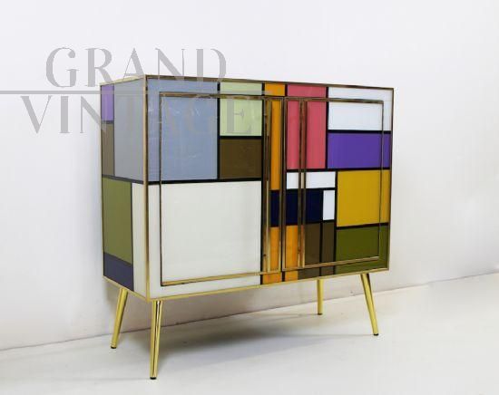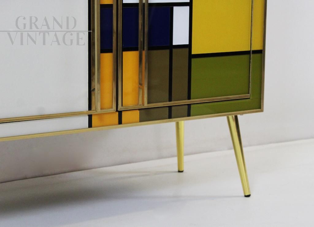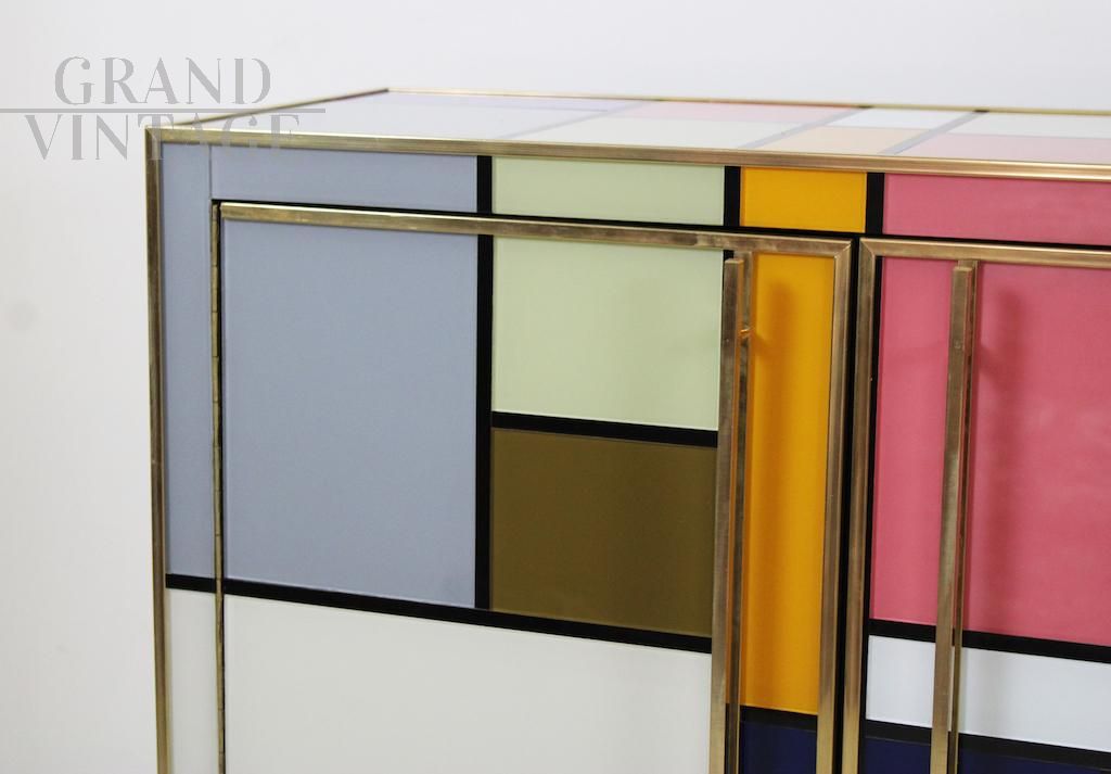 Particolare comò vintage anni '70 in stile Mondrian interamente in vetro colorato e ottone, interni in mogano. Provenienza: Italia anni '70.