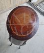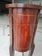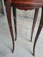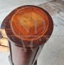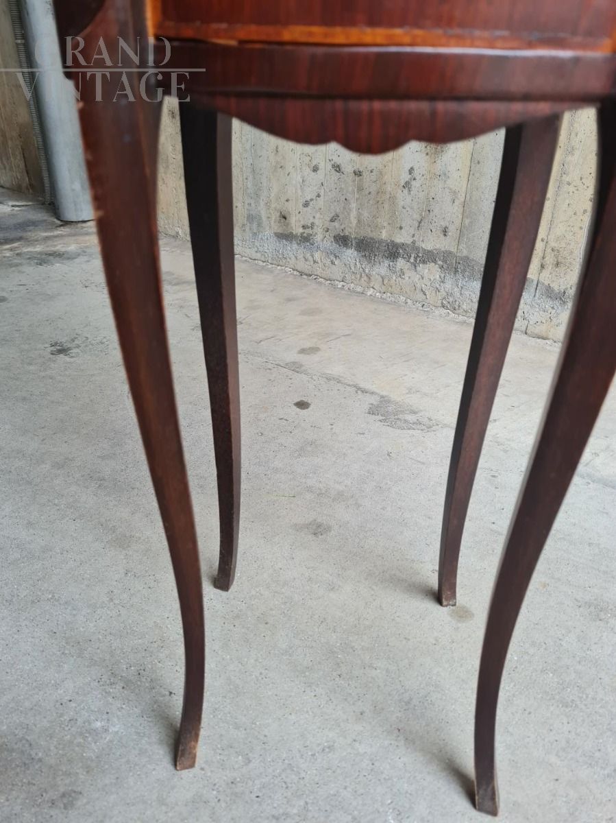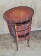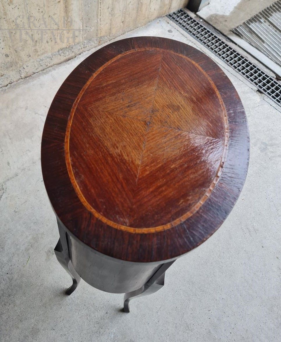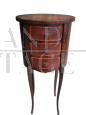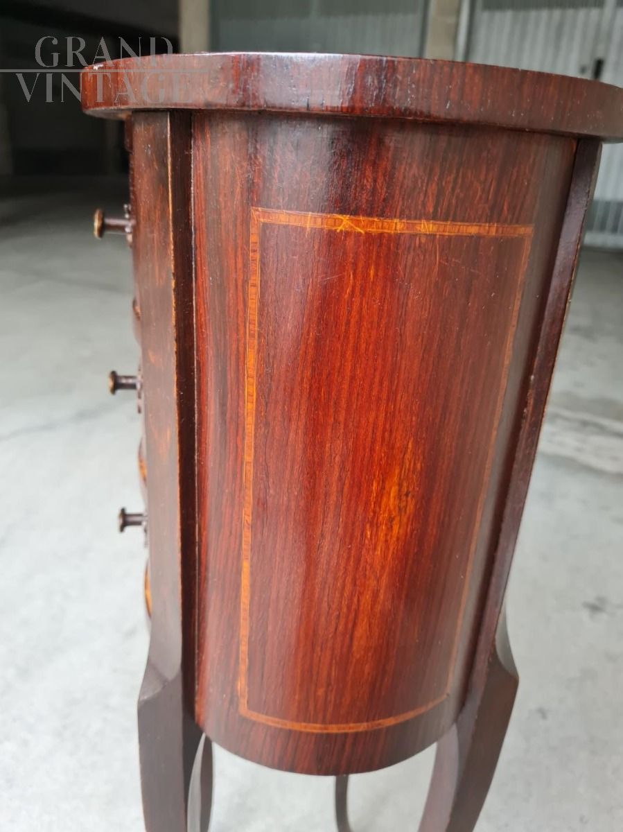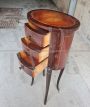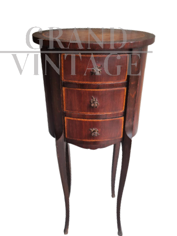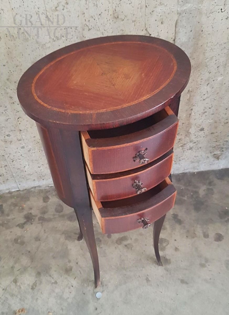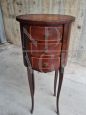 Piccolo comodino vintage ovale in legno con 3 cassetti, intarsi in bois de rose e gambe mosse tipiche dello stile Barocchetto, Italia del '900. Da restaurare.