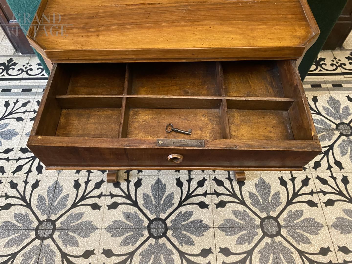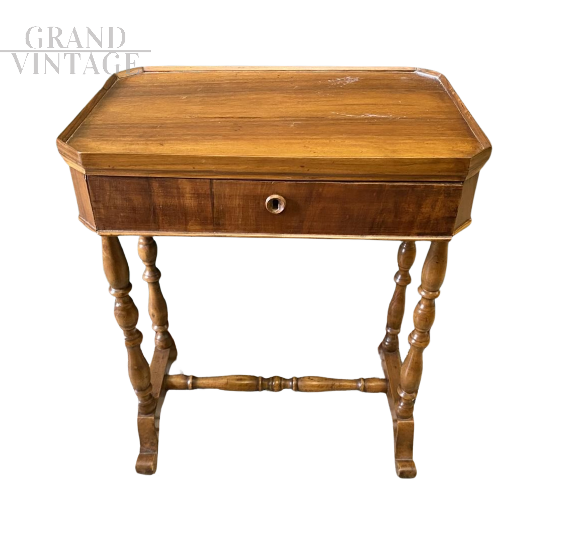 Comodino tavolino antico di epoca Luigi Filippo con cassetto centrale diviso in scompartimenti, dotato di chiave originale. Il tavolino è tutto in legno massello di noce e piuma di noce, ed è intagliato a mano con belle gambe tornite. Provenienza Lombardia, epoca Luigi Filippo. In buone condizioni, necessita di un piccolo intervento di lucidatura, come da foto.