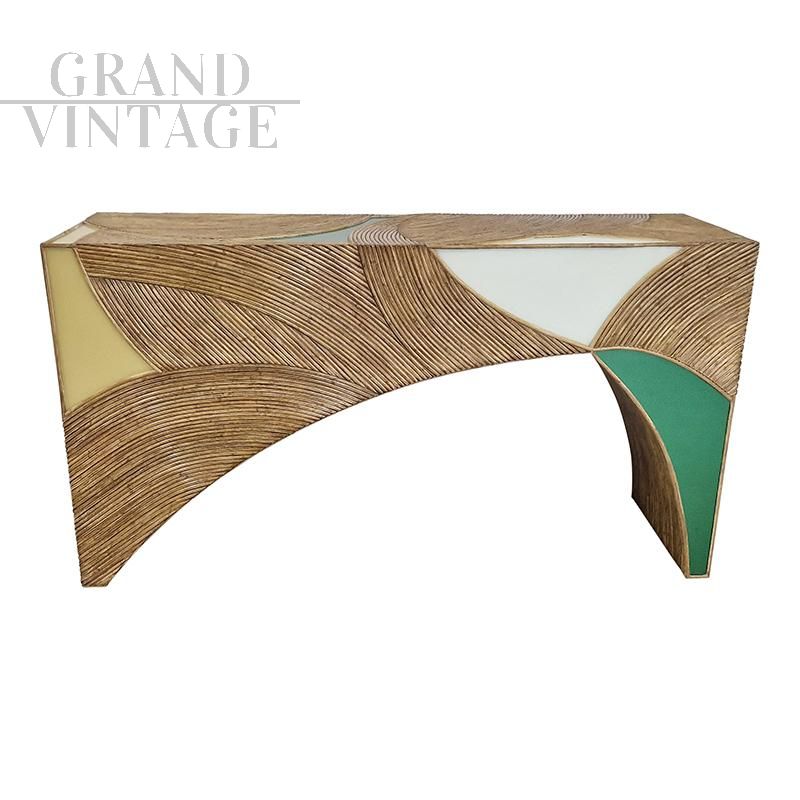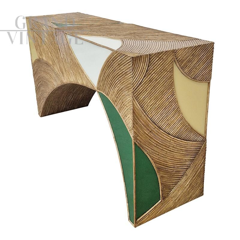 Consolle design interamente realizzata a mano, con struttura in legno rivestito in bambù e vetro bianco, giallo e verde. Può essere collocata sia come pezzo centrale che a parete.