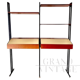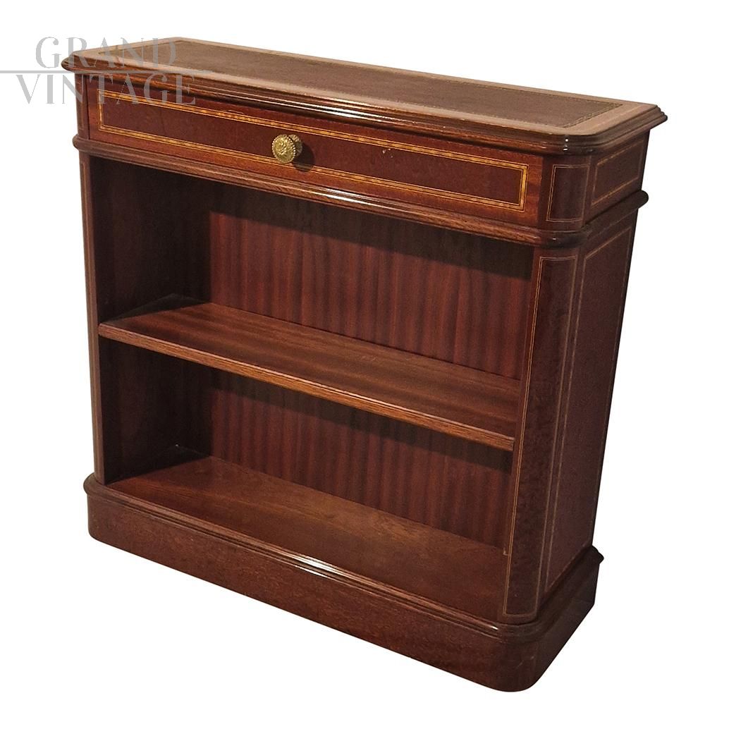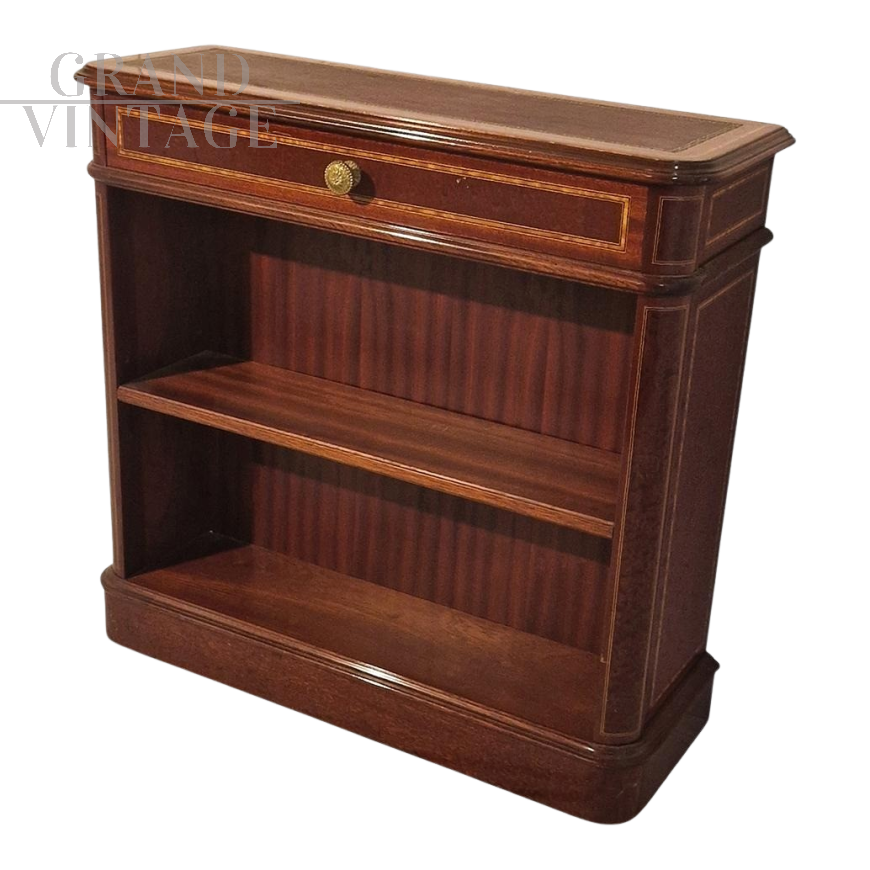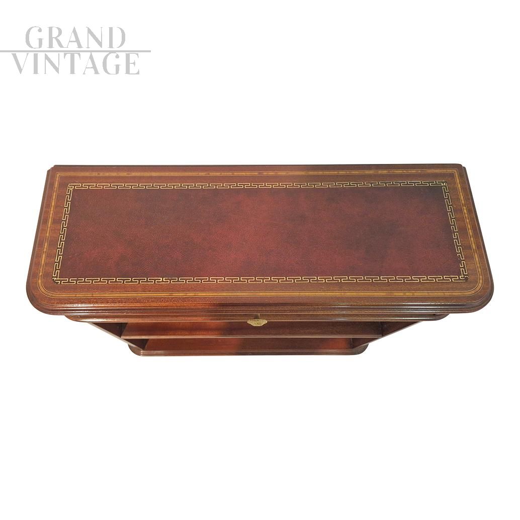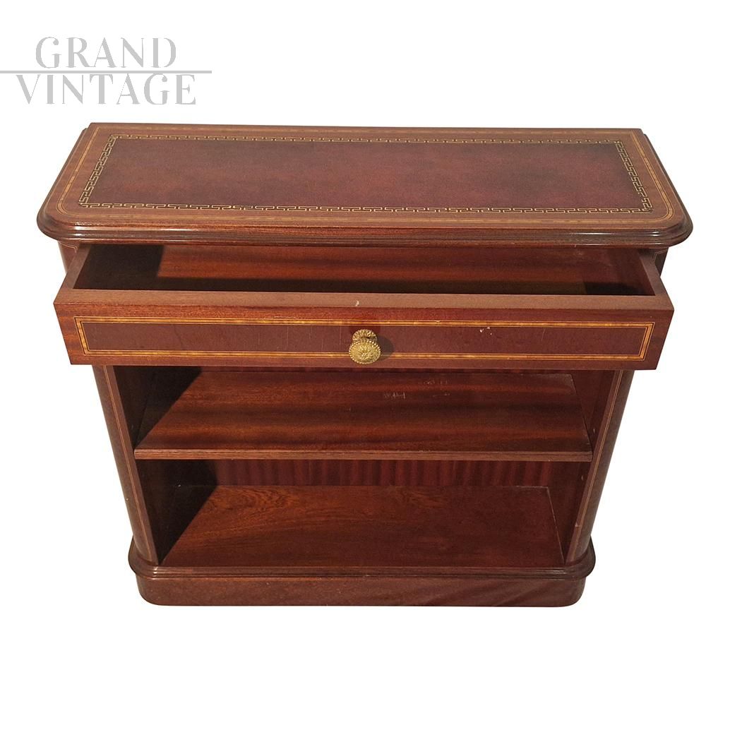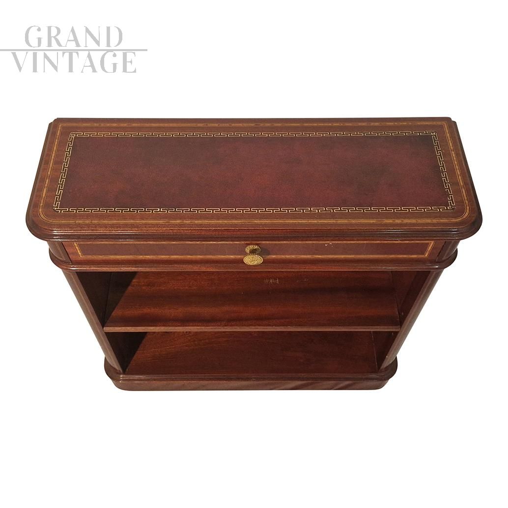 Piccola consolle étagère in mogano con cassetto frontale, ripiano removibile e piano in pelle rosso bordeaux, arricchita da intarsi in legno chiaro e completa di pomolo in ottone dorato.