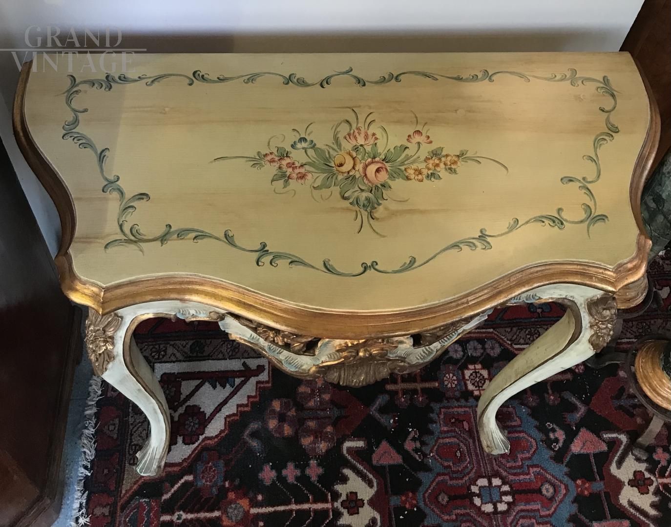 Stupenda console in stile barocco veneziano in legno intagliato a mano e interamente dipinto e decorato con motivi floreali e con foglia d'oro.