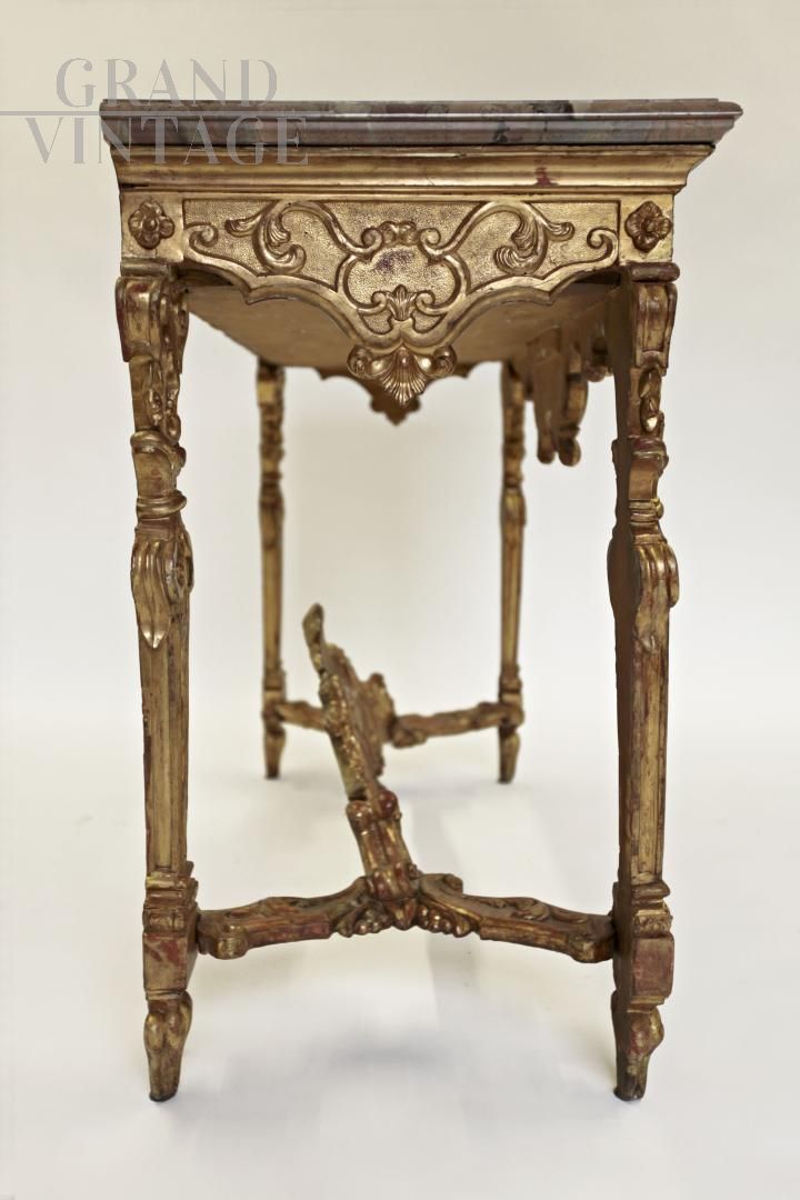 Console Luigi XIV in legno intagliato e dorato con piano in marmo