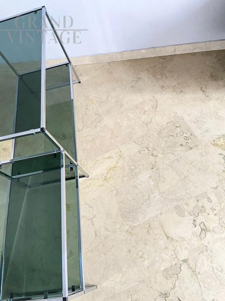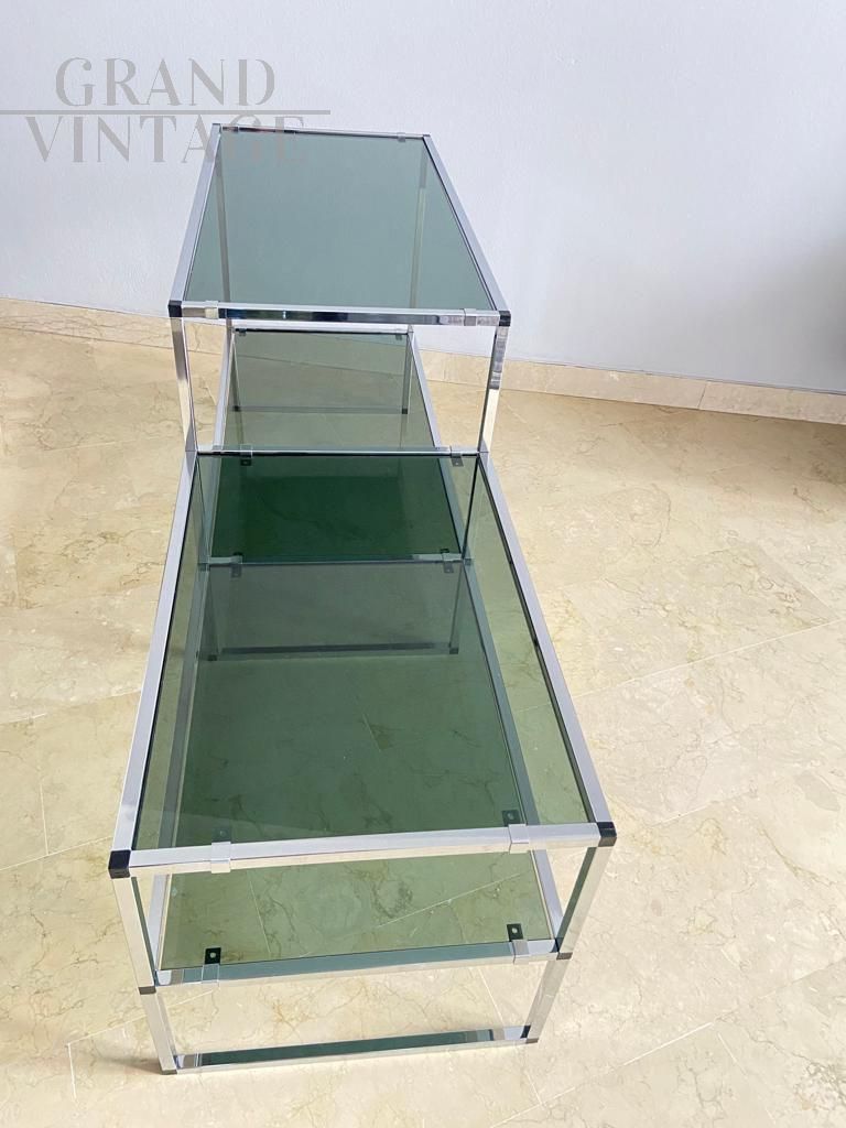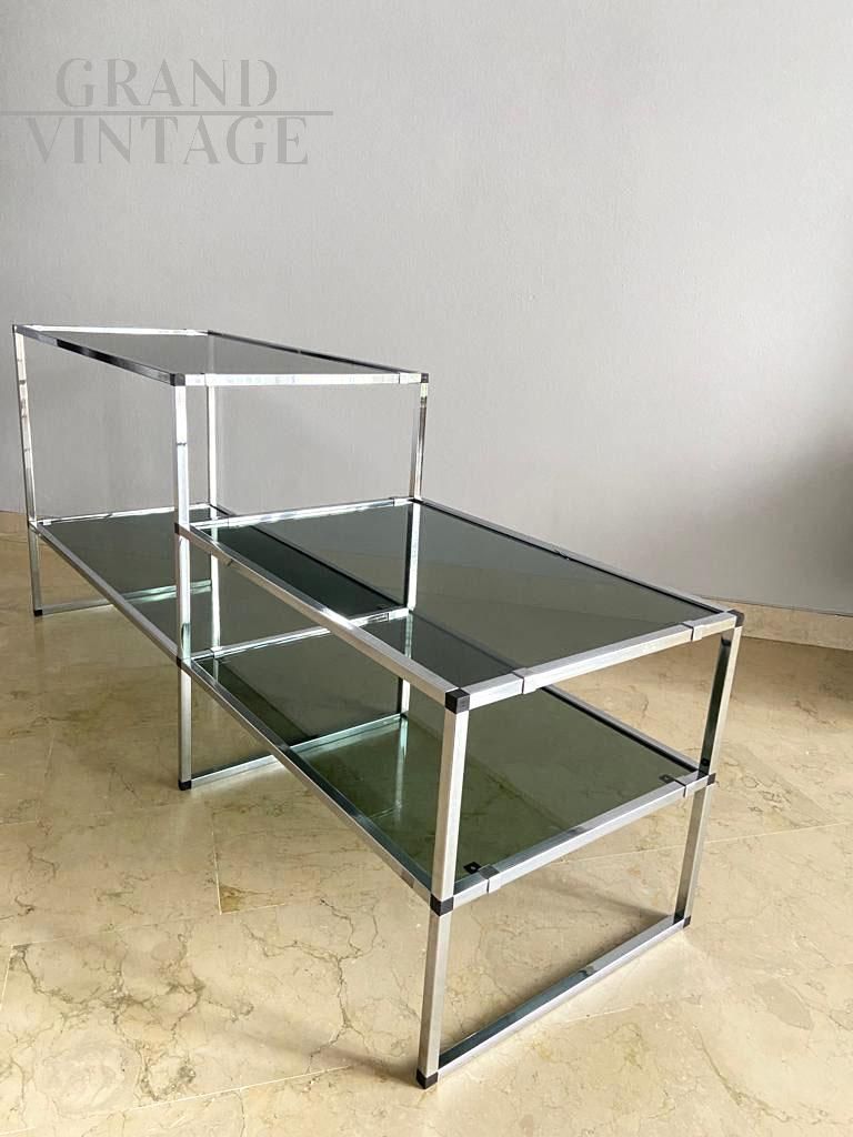 Tavolo console in metallo cromato con doppio piano in vetro fumé, Italia anni '70. Questo oggetto veniva venduto in un esclusivo negozio della città di Verona dove venivano esposti oggetti e mobili di grande valore artistico.