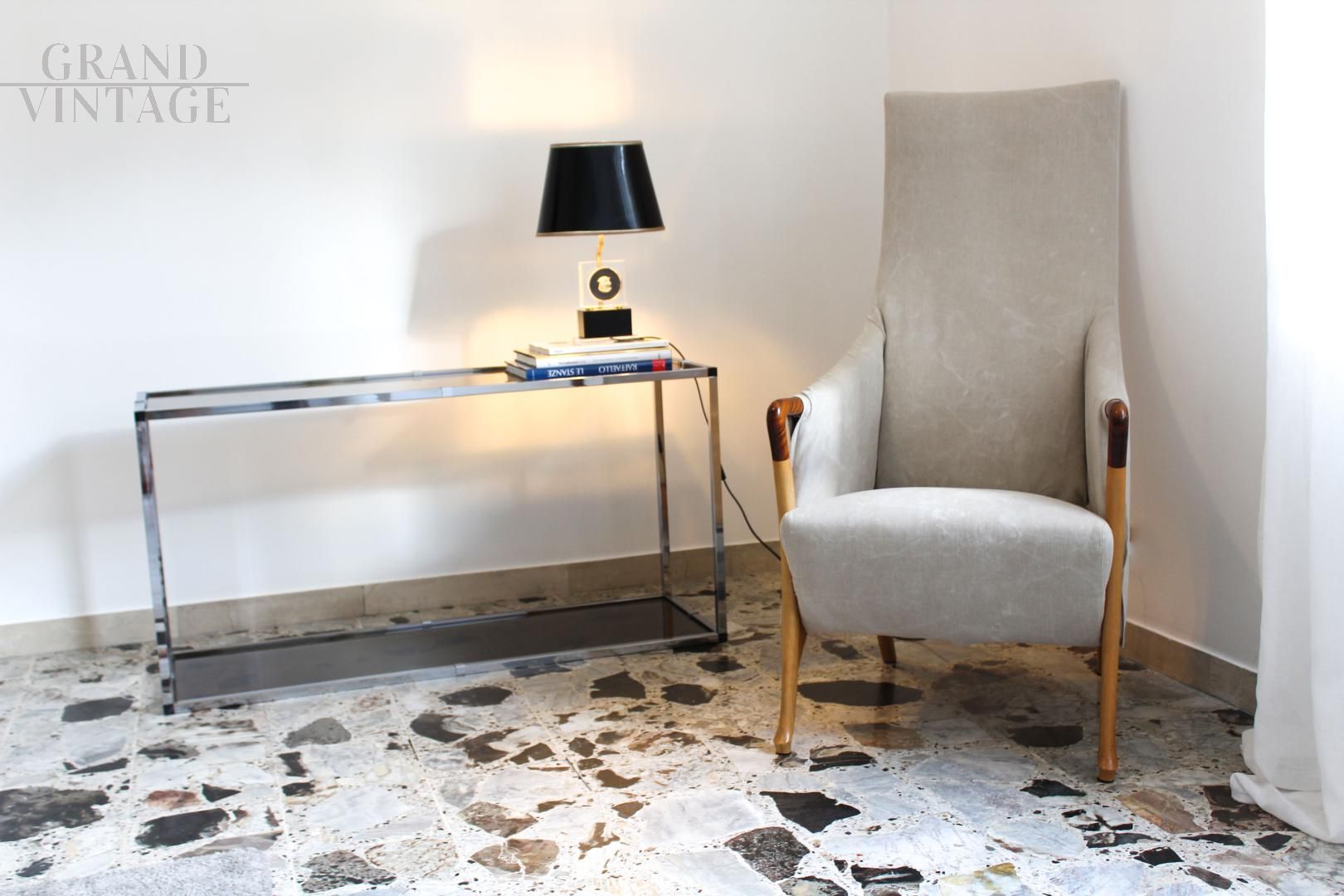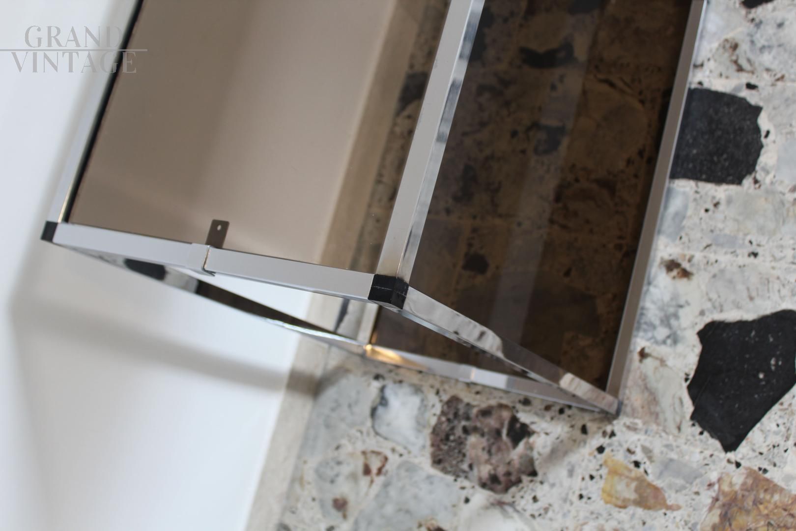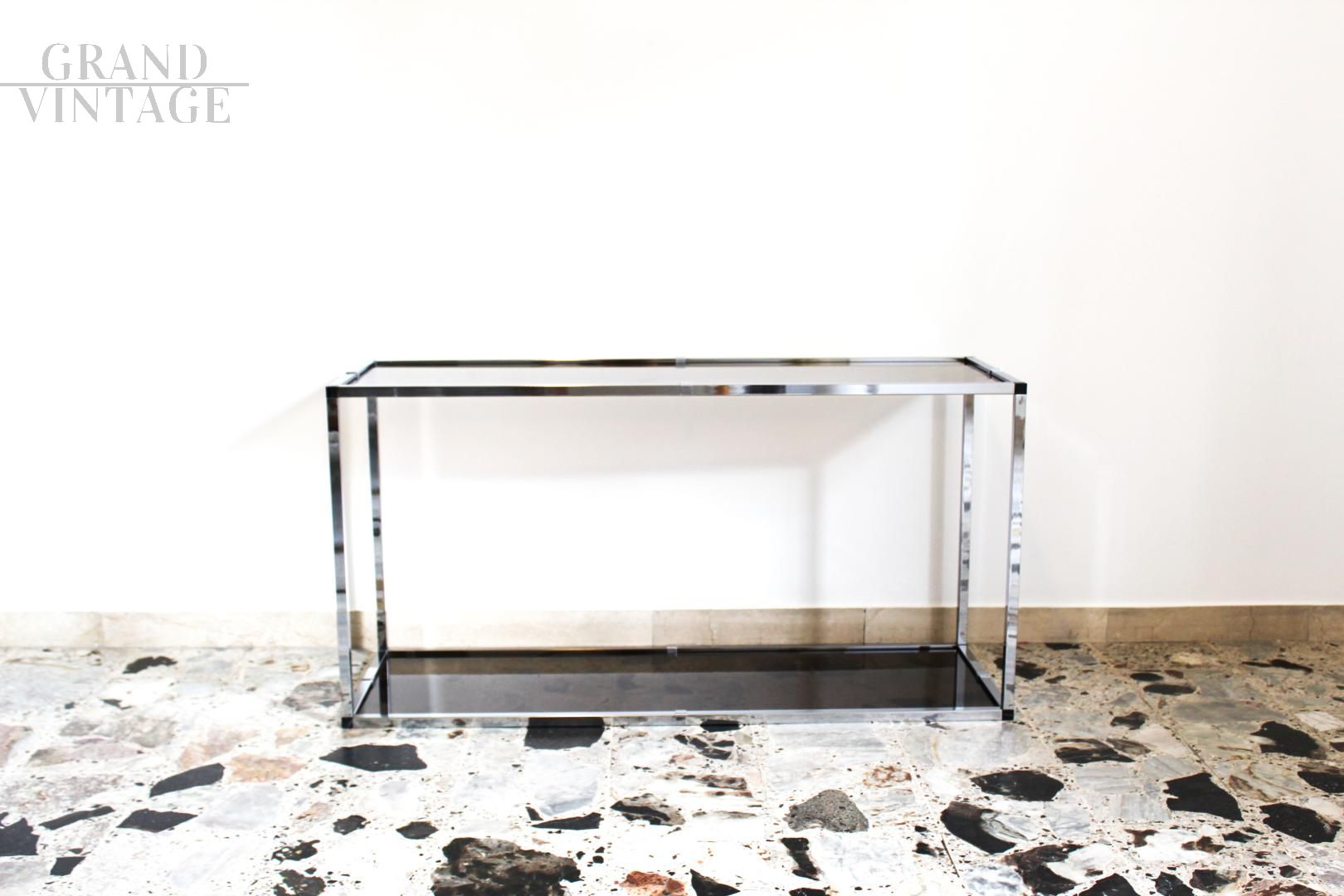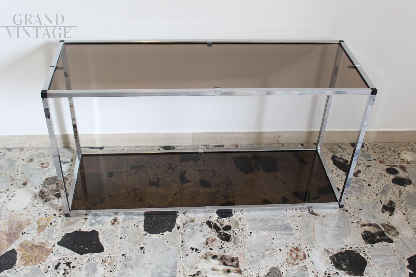 Console vintage in metallo cromato e due piani in vetro fumé, Italia anni '70, oggetto di design che negli anni 70 veniva venduto in un esclusivo negozio della citta di Verona dove venivano esposti oggetti e mobili di grande valore artistico.