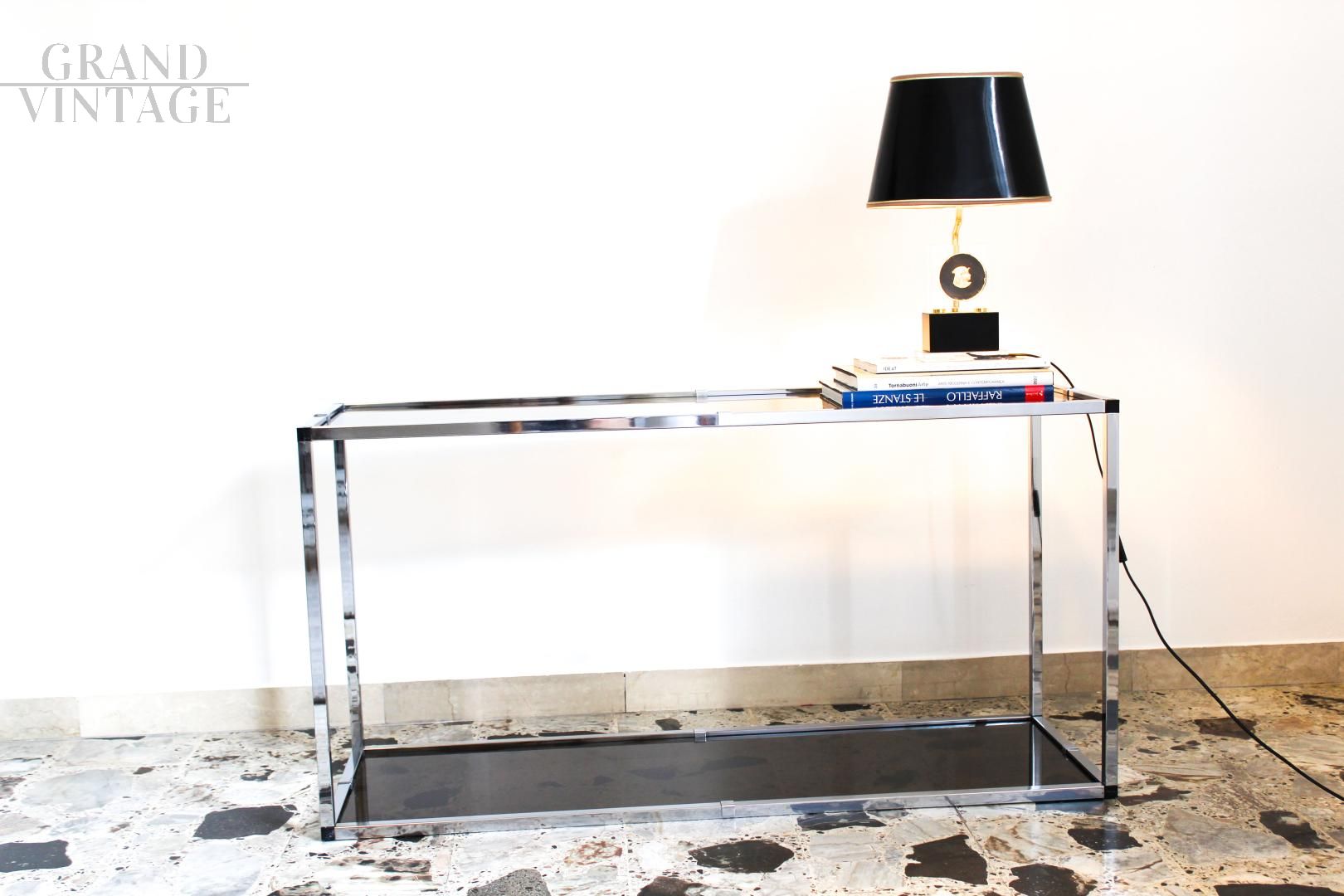 Console vintage in metallo cromato e vetro fumé, Italia anni '70