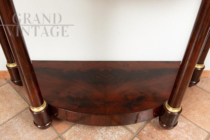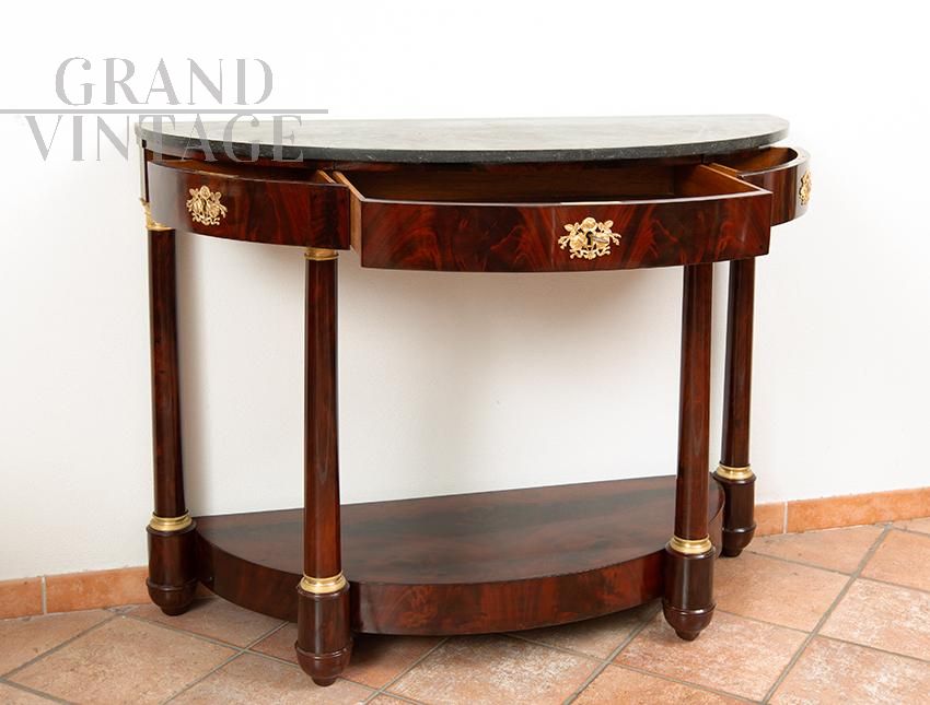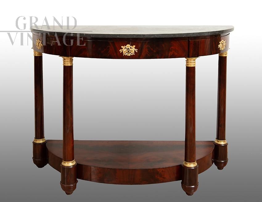 Consolle antica a mezzaluna Demi Lune Impero Francese in piuma di mogano con piano in marmo nero del Belgio. Il fronte è caratterizzato da tre colonne piumate con base e capitello in bronzo dorato finemente cesellato. La fascia sottopiano è caratterizzata da tre cassetti tra cui uno centrale più grande e due laterali esaltati da elementi in bronzo dorato a motivo floreale. La consolle è stata restaurata da maestri artigiani con metodo tradizionale gommalacca e alcool fatto a mano.