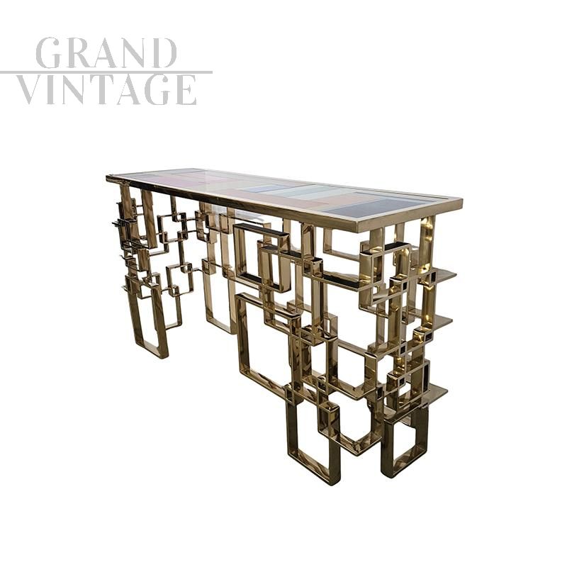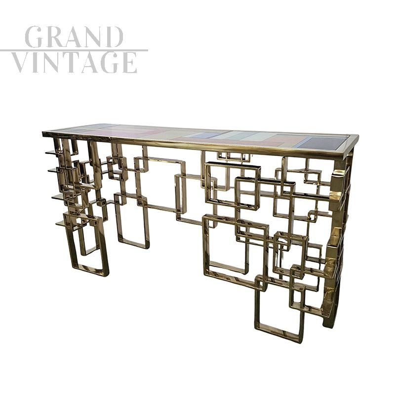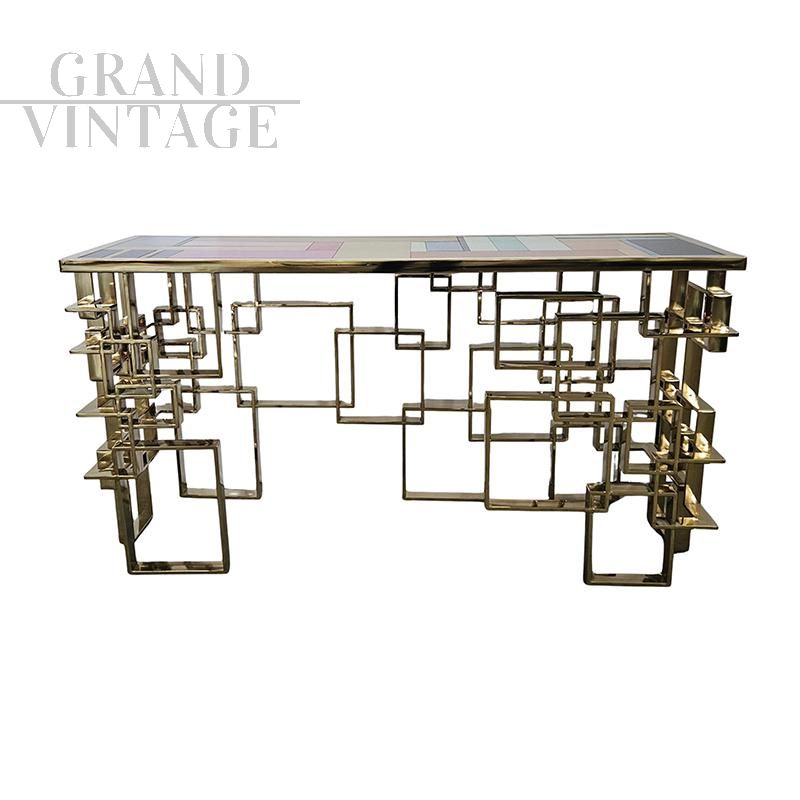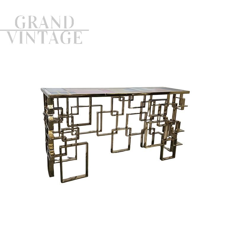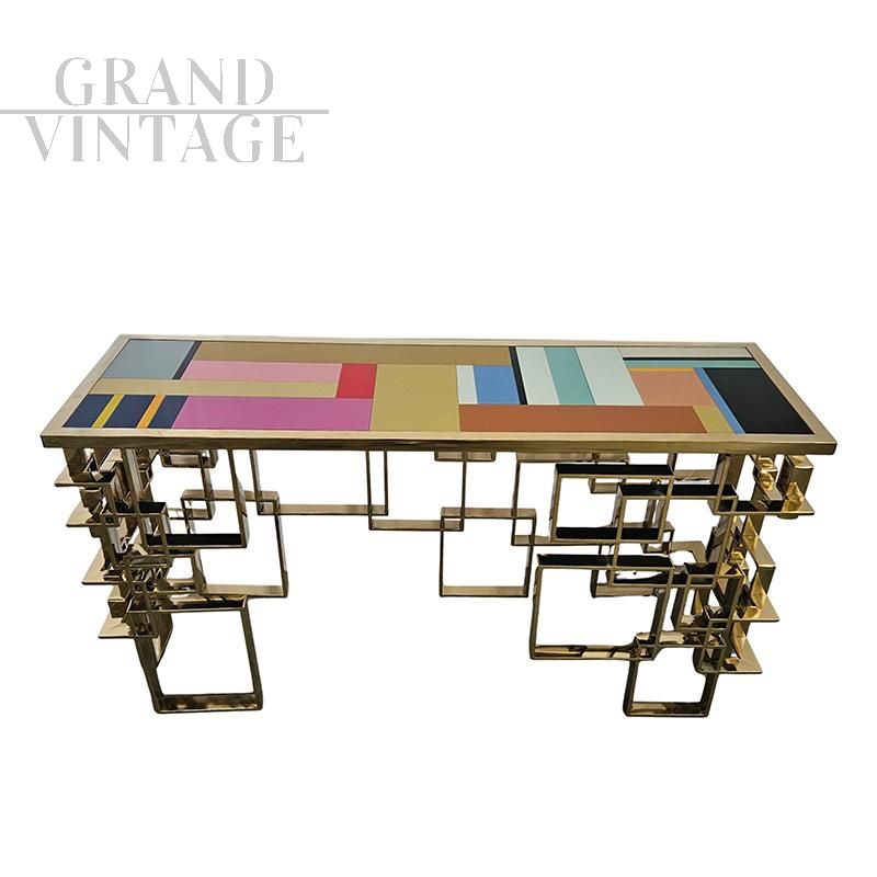 Consolle bifacciale, interamente realizzata a mano, con base lavorata ad elementi geometrici in tubolare di sezione rettangolare e finitura superficiale cromo-oro, top rivestito con elementi in vetro di Murano di diversi colori.