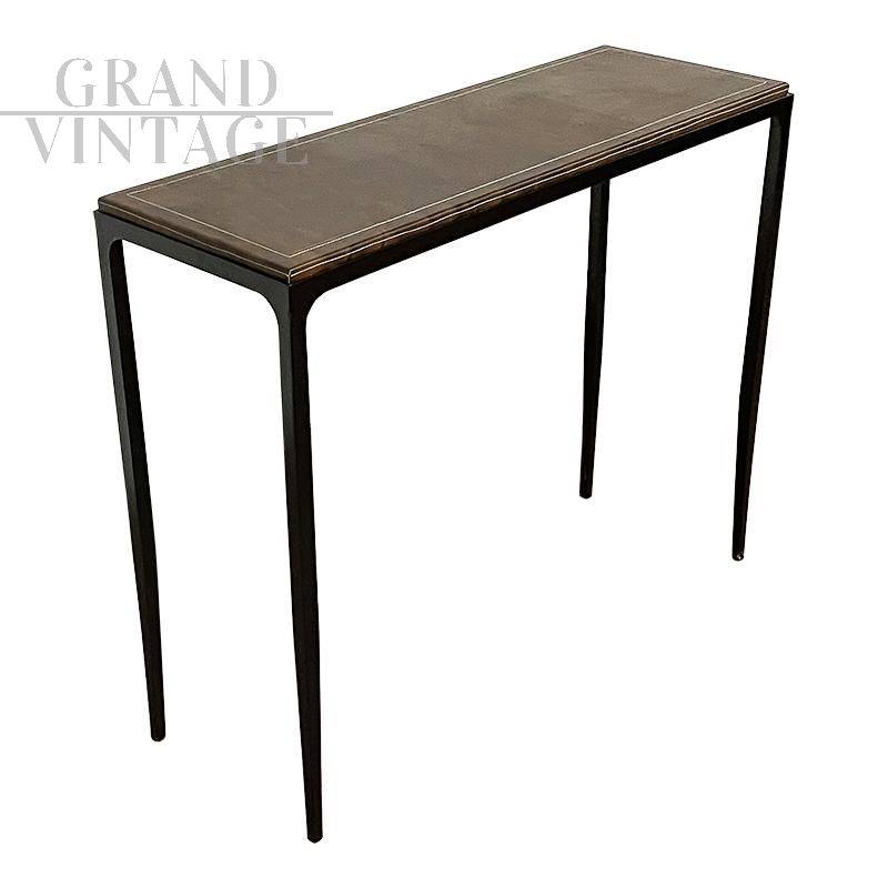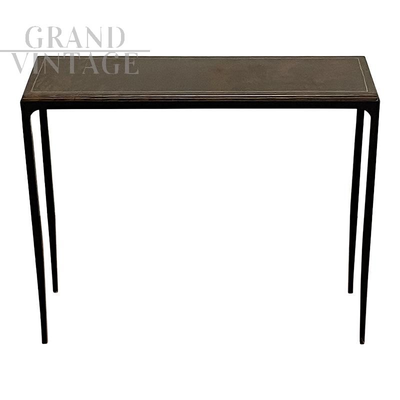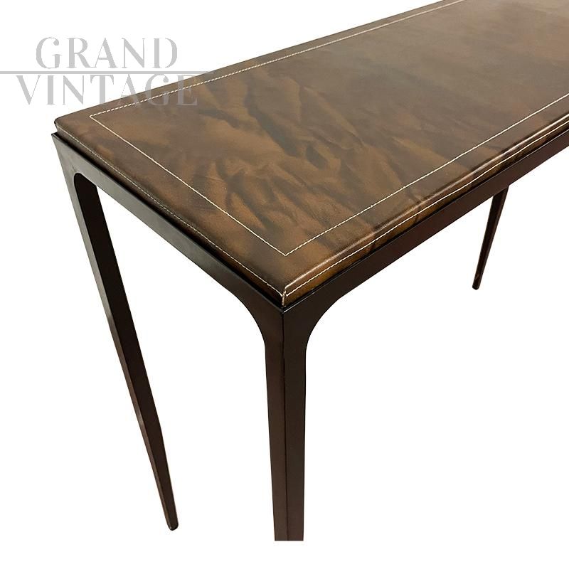 Consolle in stile industriale in ferro con piano in cuoio marrone.