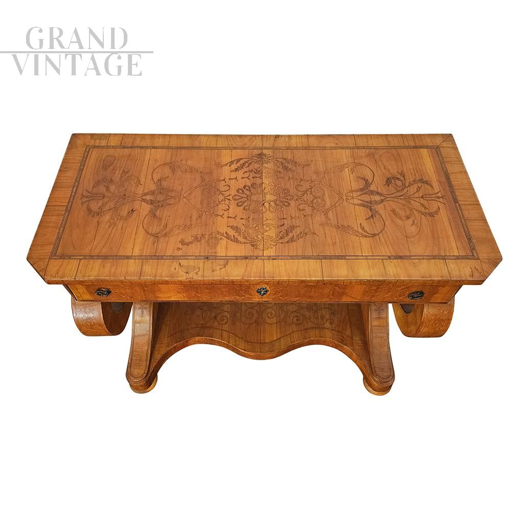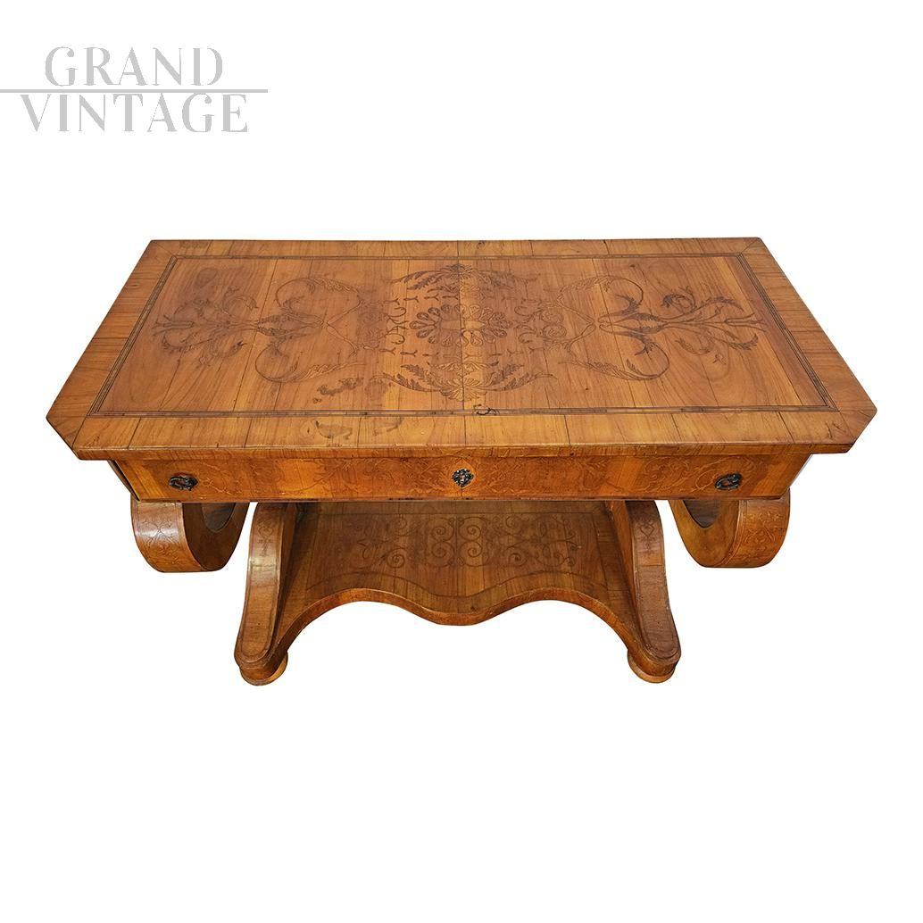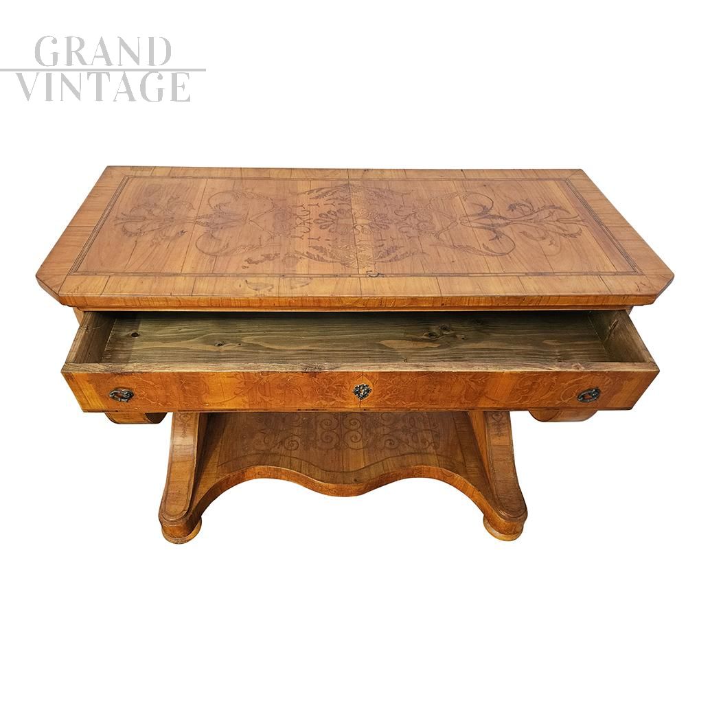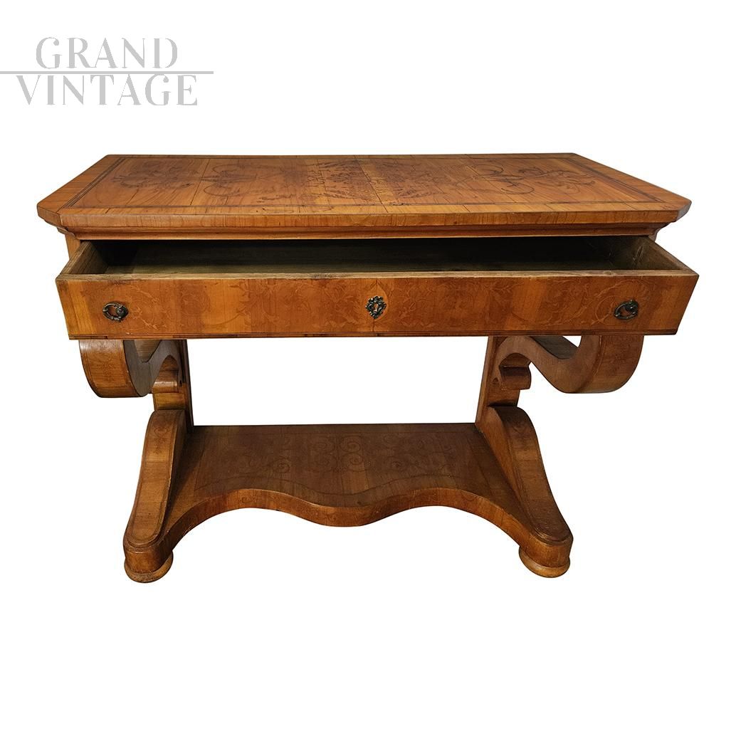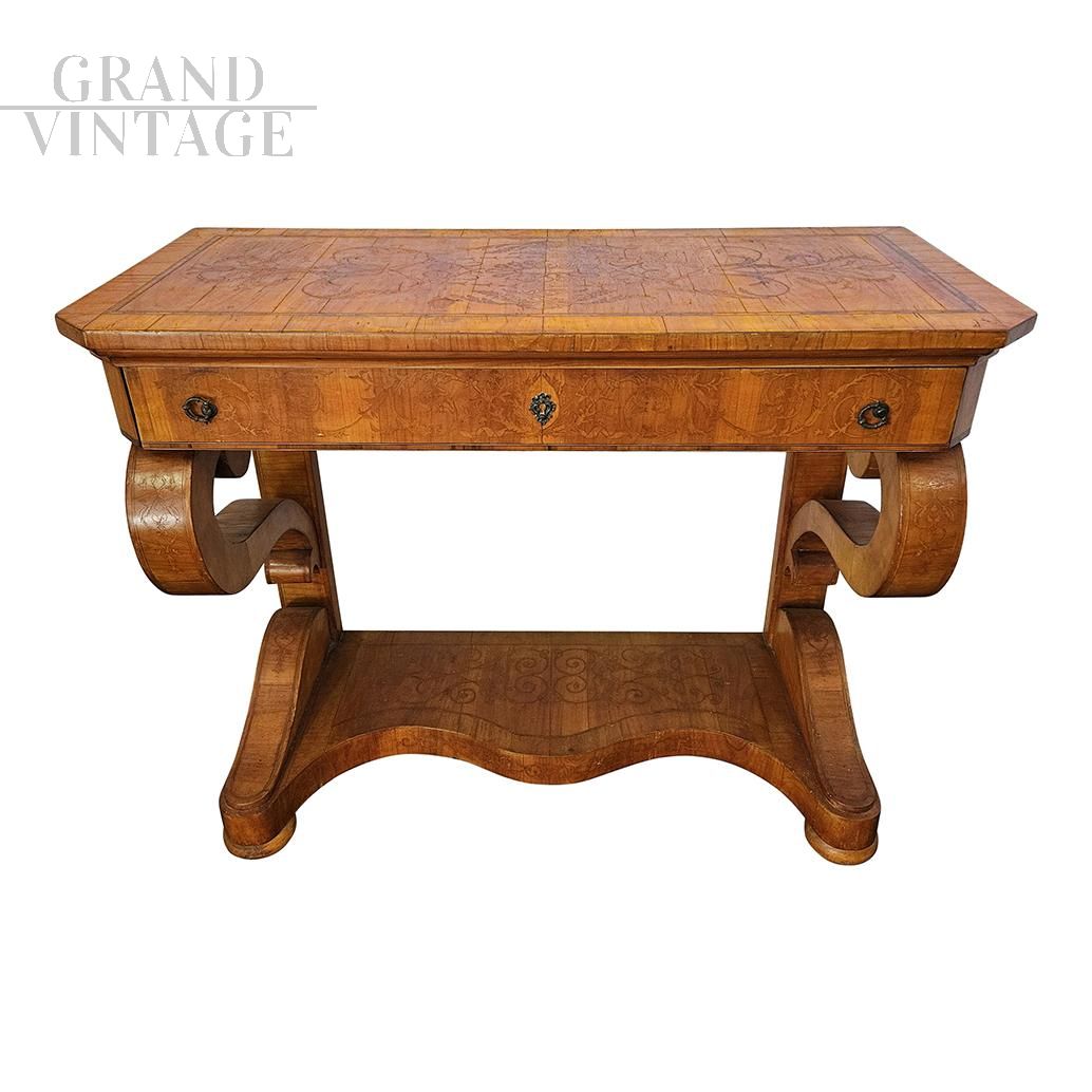 Elegante consolle retta da volute mosse poggianti su basamento mistilineo con intaglio. Fascia sagomata a gola di tulipano con cassetto sottopiano. Piano con cornice intagliata.