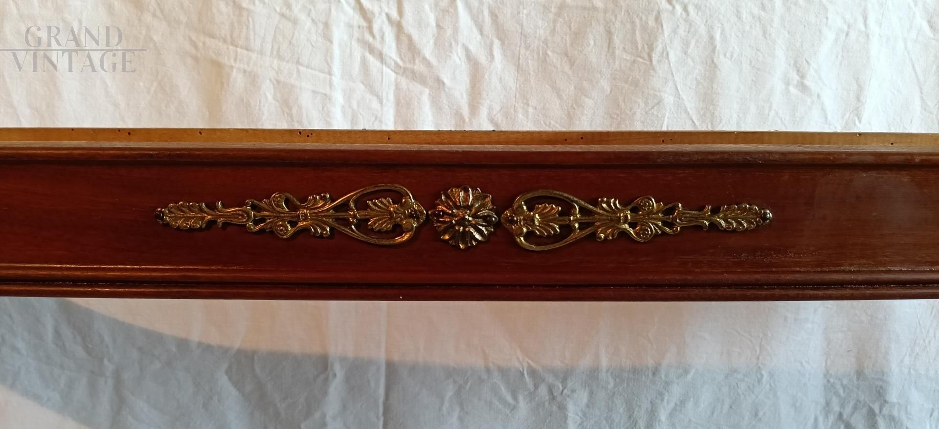 Consolle in stile antico dell'800, con piano in vero marmo Lumachella Antico Romano, struttura in legno di noce finemente lavorato con gambe a spillo, decori dorati in simil ottone, particolare la forma svasata sul bordo inferiore. La consolle è in ottimo stato, ha già un foro sul retro per il fissaggio a parete.