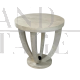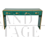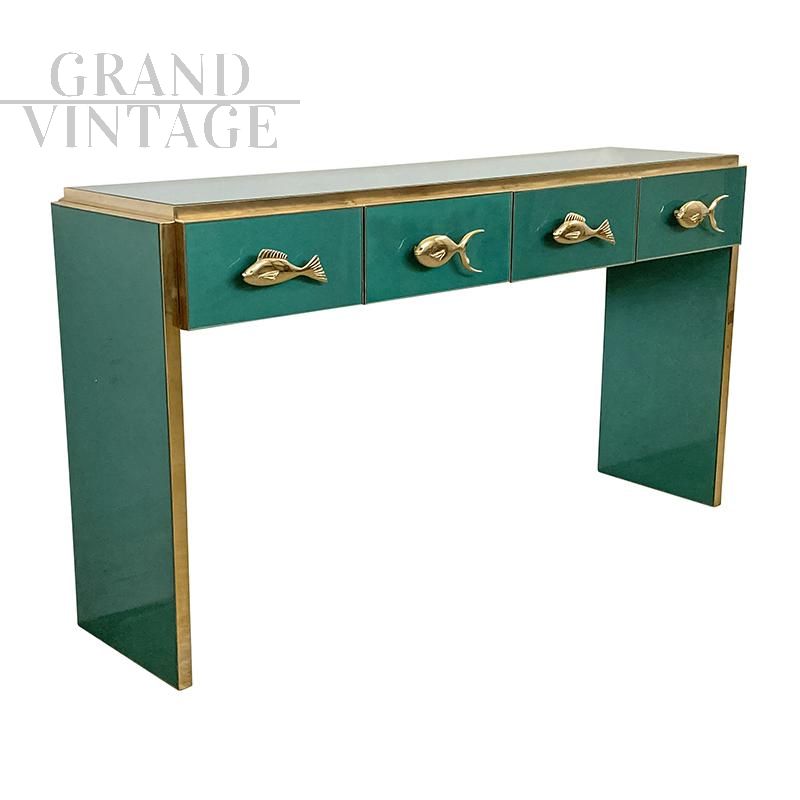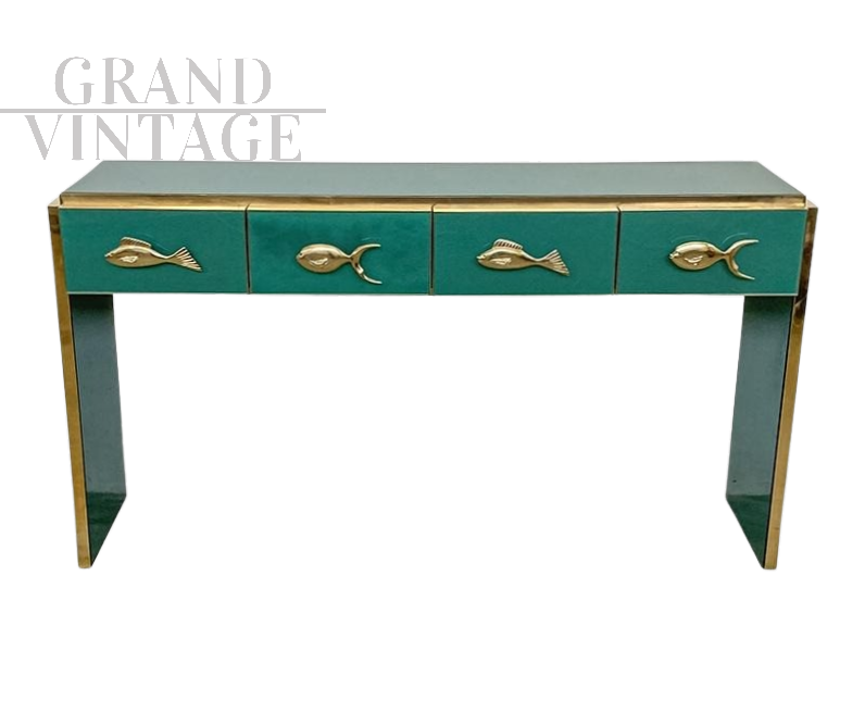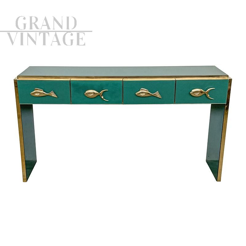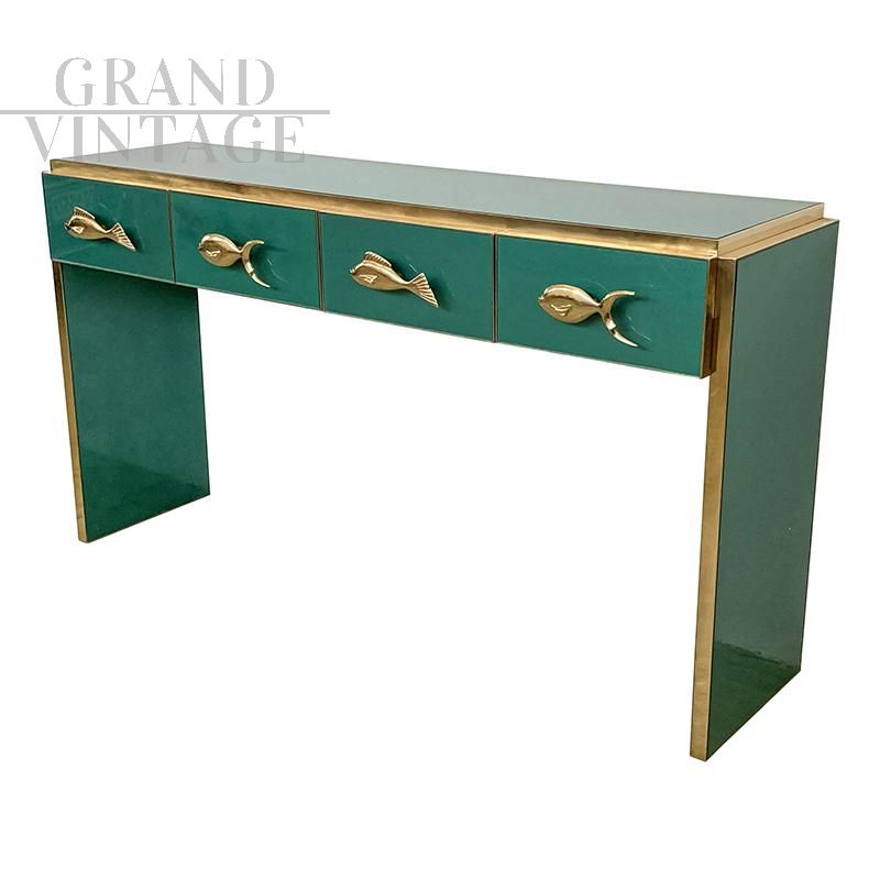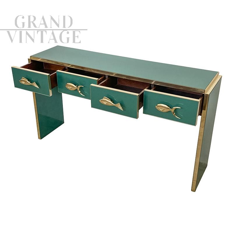 Consolle in legno rivestita in vetro verde dotata di 4 cassetti con maniglie dorate a forma di pesce, profili e piedini in ottone.