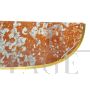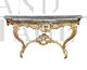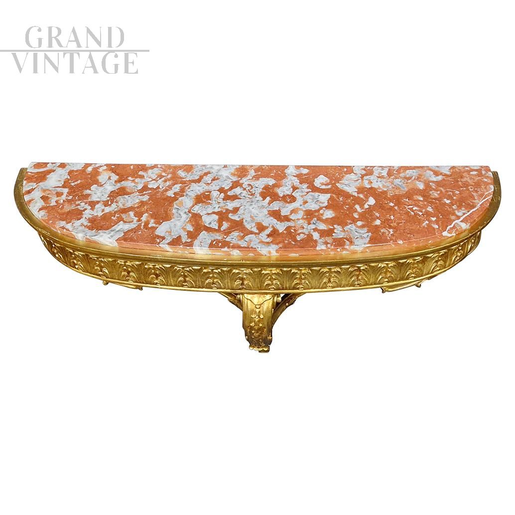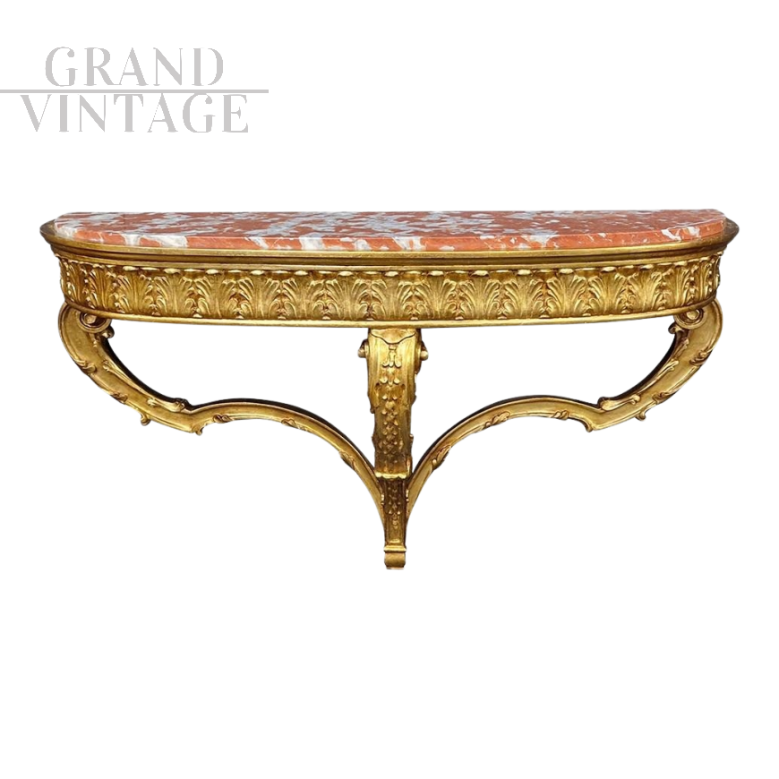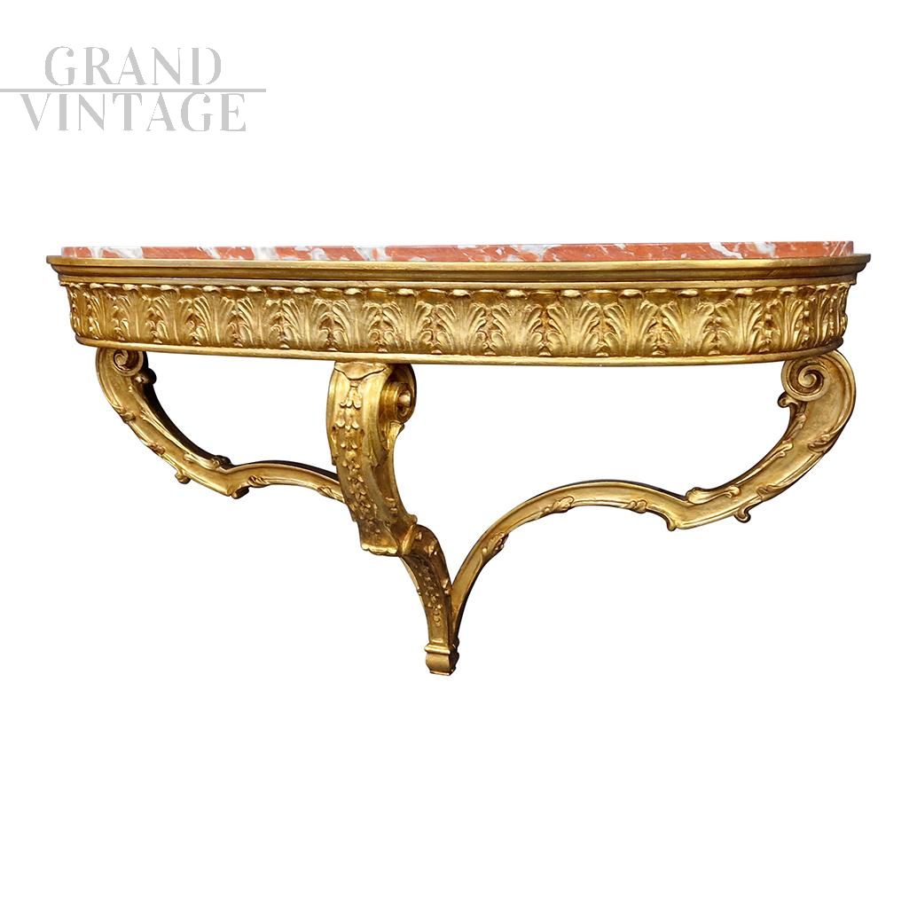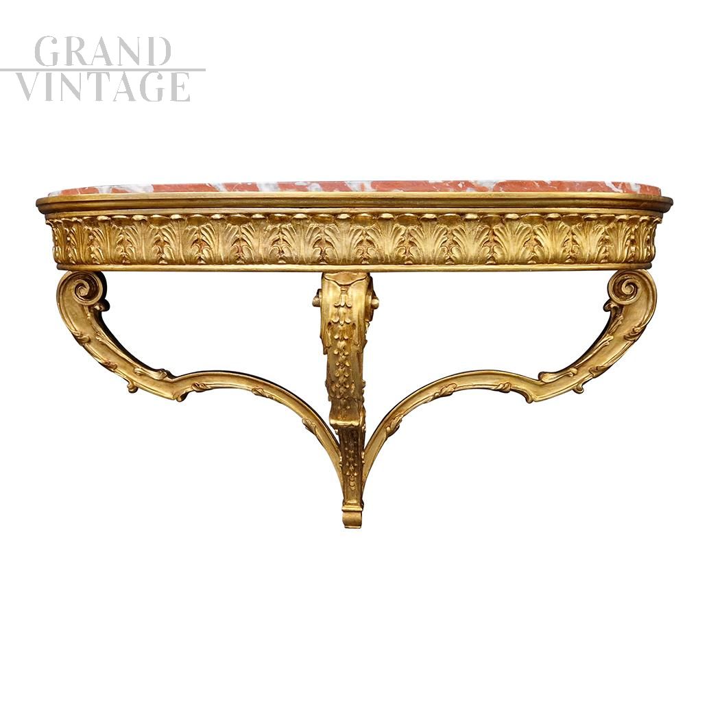 Consolle in legno intagliato e traforato laccato oro con ricchi motivi vegetali e di volute, piano sagomato in marmo rosso.