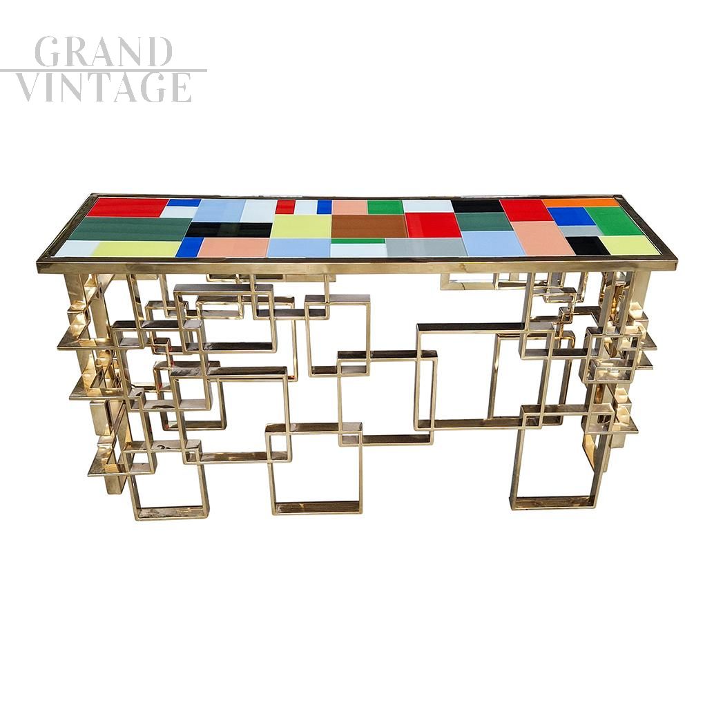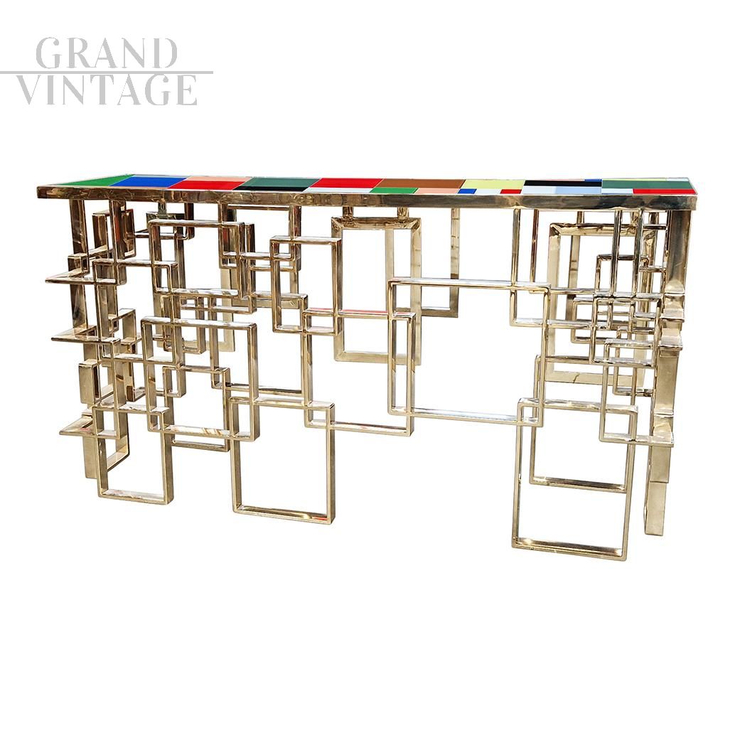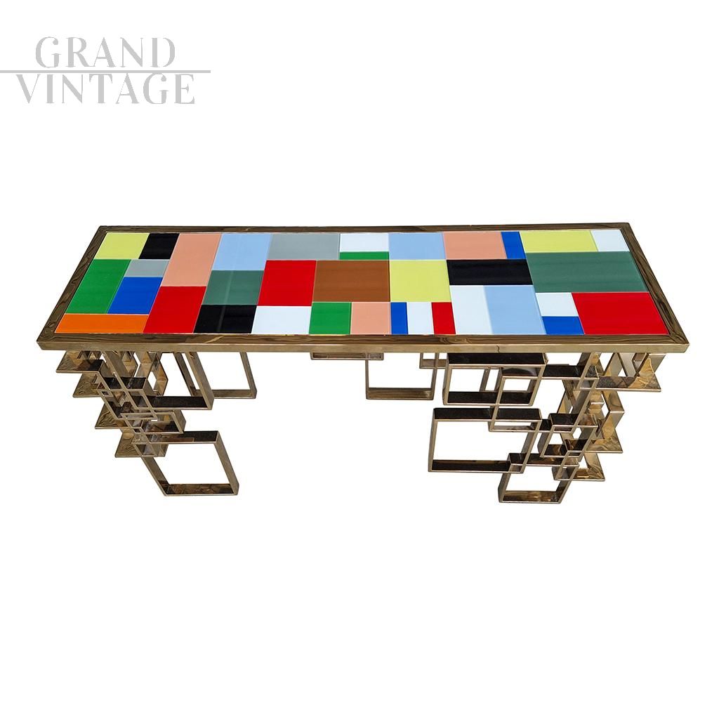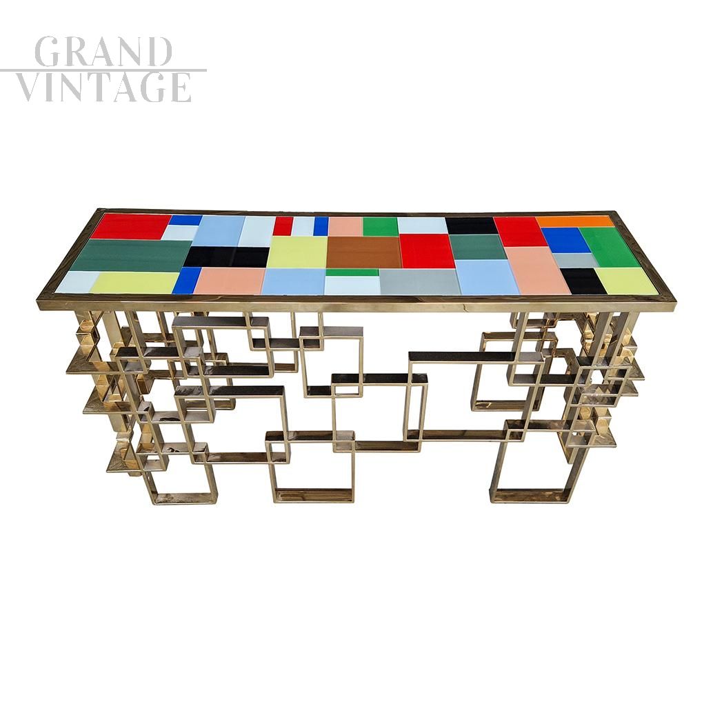 Consolle scultura design bifacciale, interamente realizzata a mano, con base lavorata ad elementi geometrici in tubolare di sezione rettangolare con finitura superficiale cromo-oro e top rivestito con elementi in vetro di Murano di diversi colori.