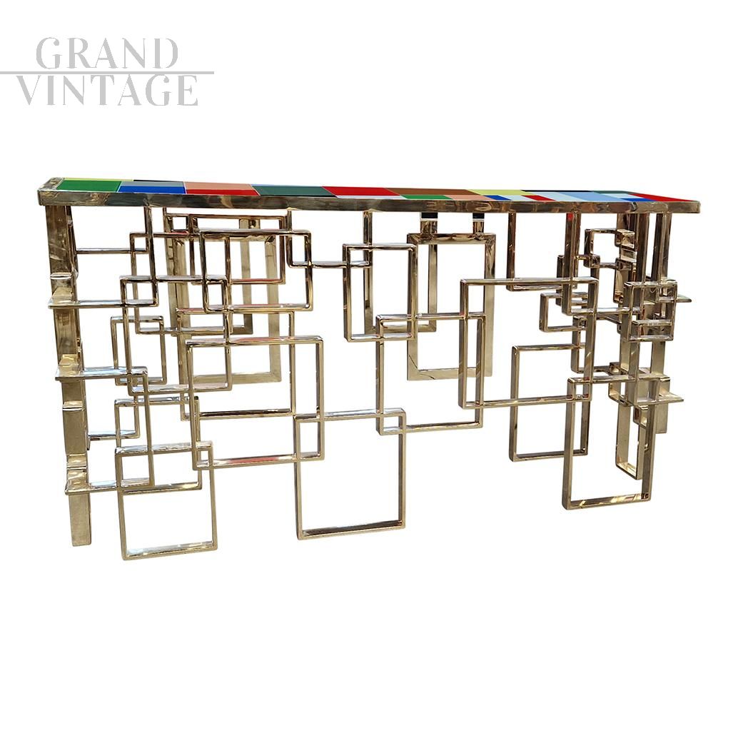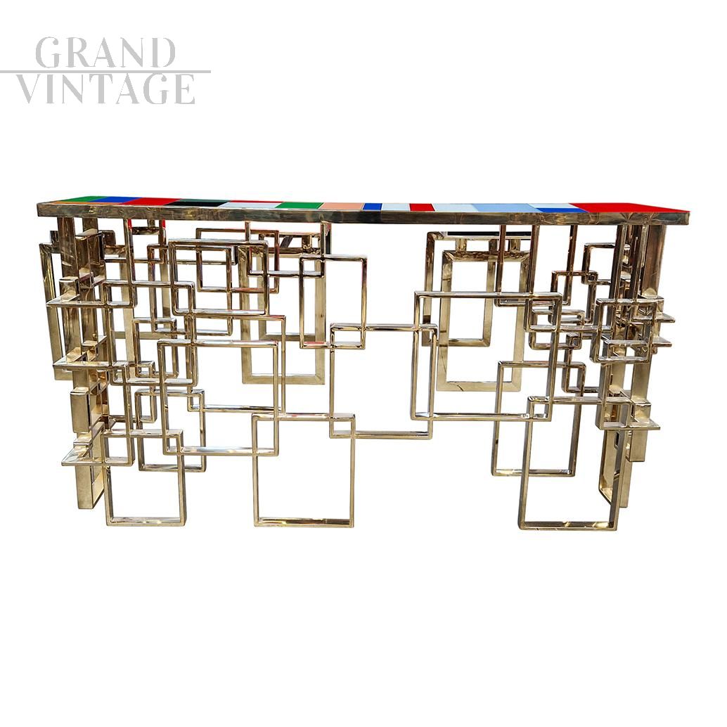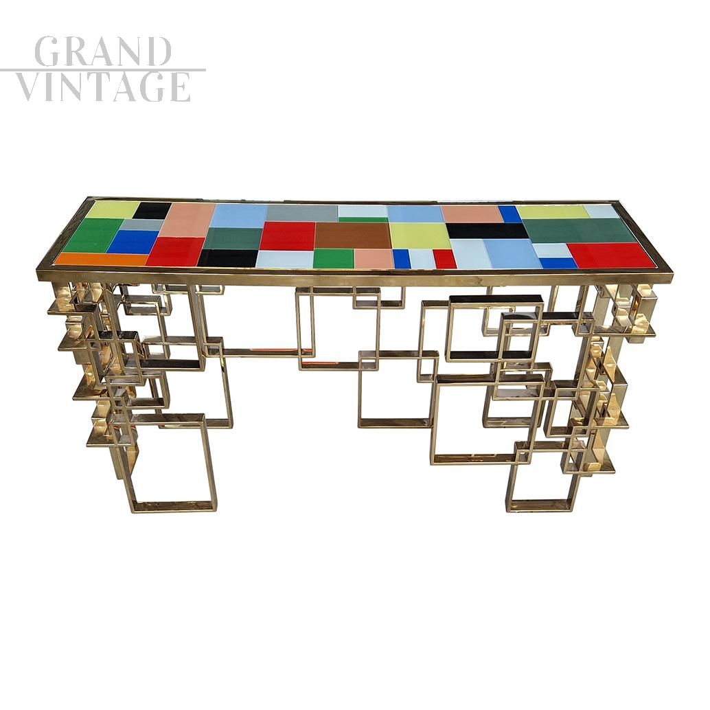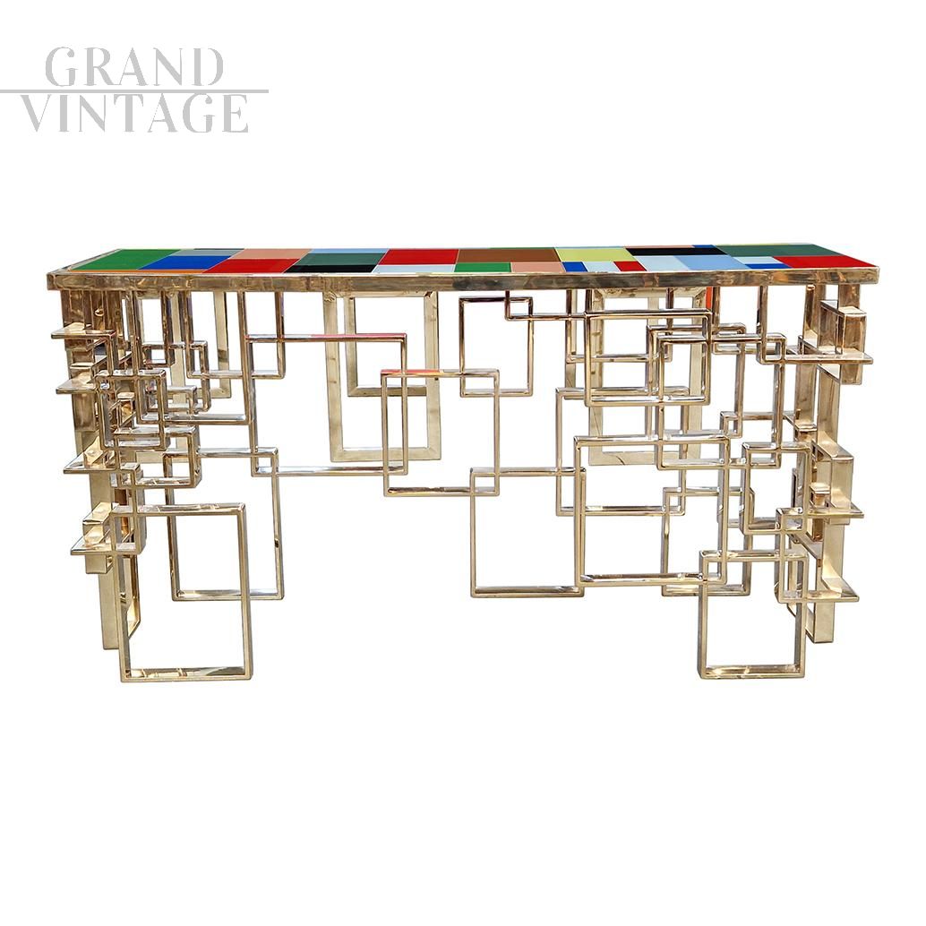 Consolle scultura design bifacciale, interamente realizzata a mano, con base lavorata ad elementi geometrici in tubolare di sezione rettangolare con finitura superficiale cromo-oro e top rivestito con elementi in vetro di Murano di diversi colori.