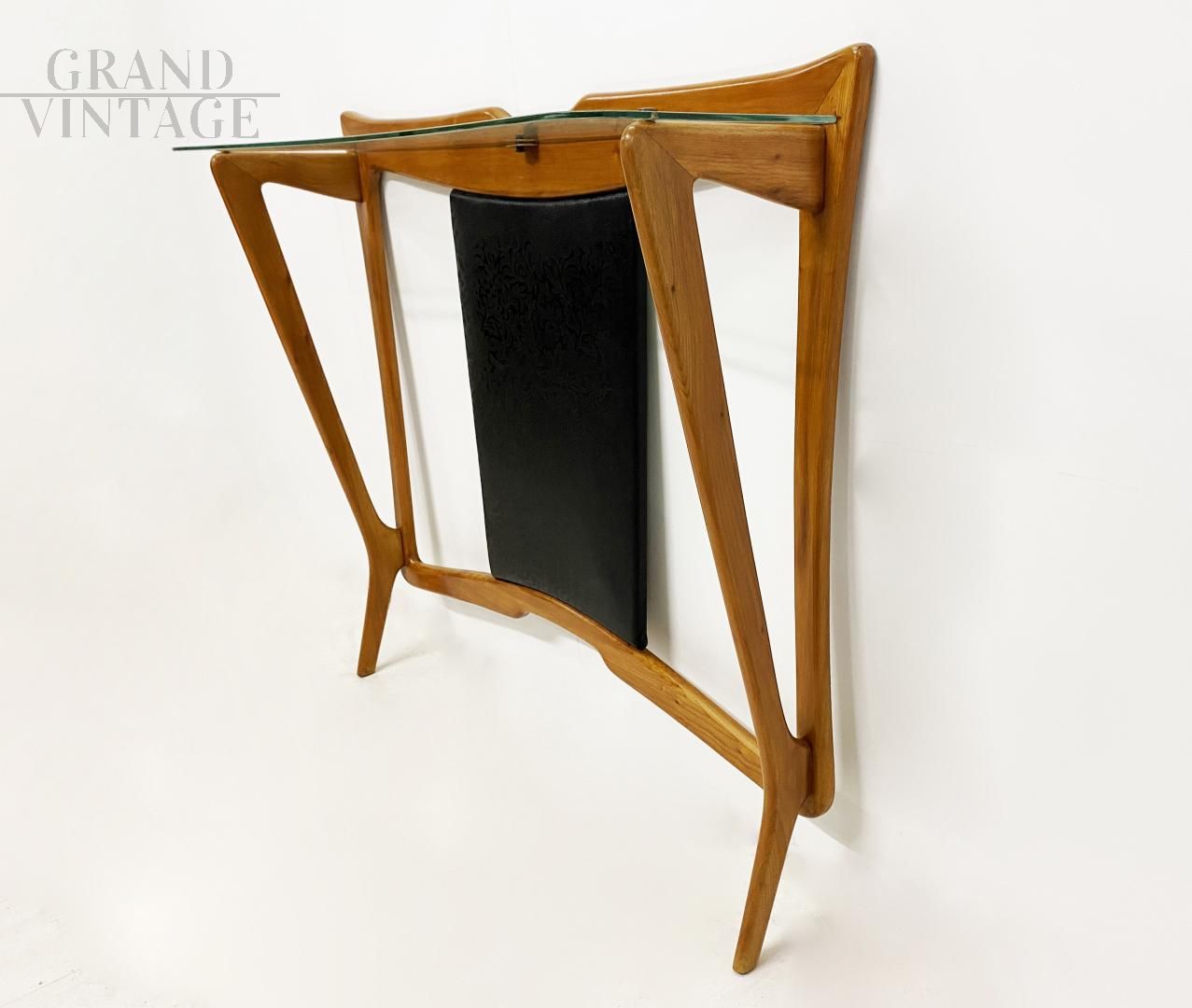Particolare consolle modernariato da muro in stile Ico Parisi, originale anni '50, interamente realizzata in legno di ciliegio con piano in cristallo e dettaglio centrale in pelle laccata nera. Ottima soluzione salvaspazio per un ingresso stretto. Modernariato italiano anni '50.