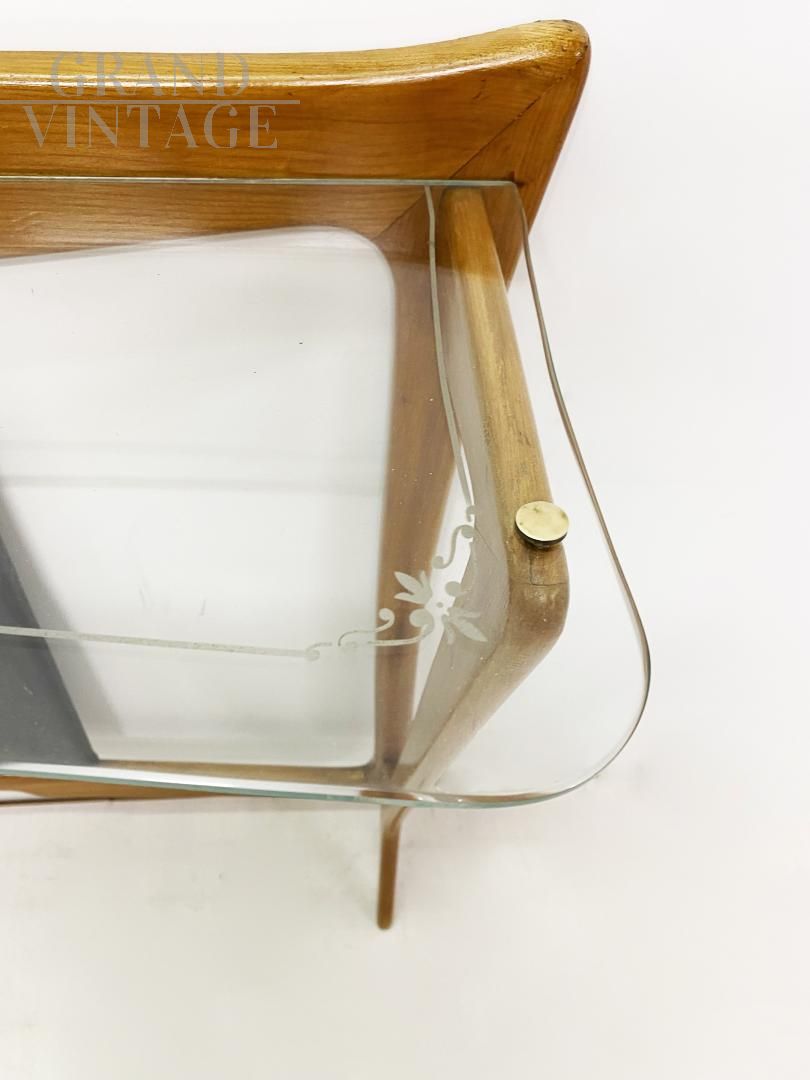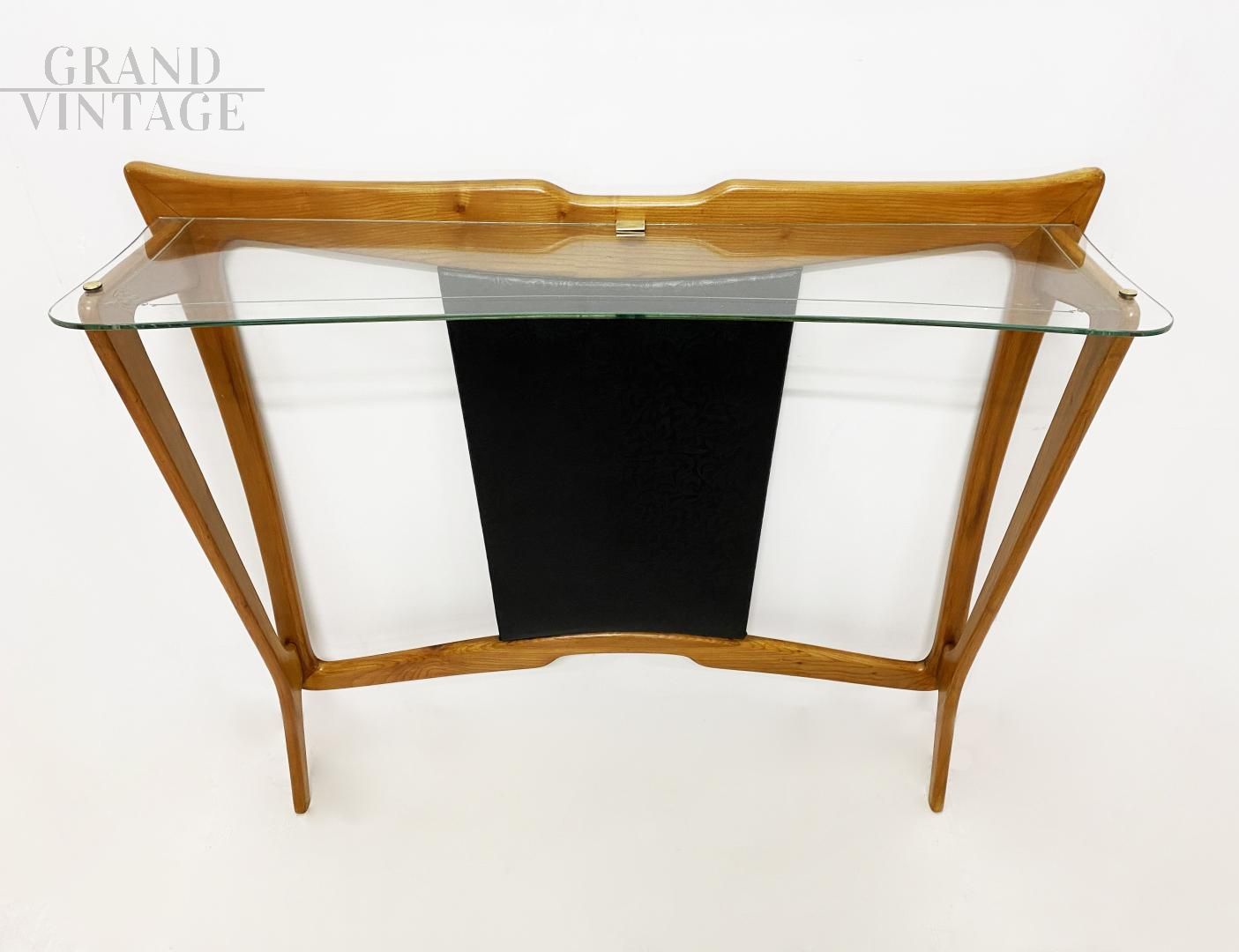 Consolle vintage stile Ico Parisi in legno vetro e pelle, anni '50