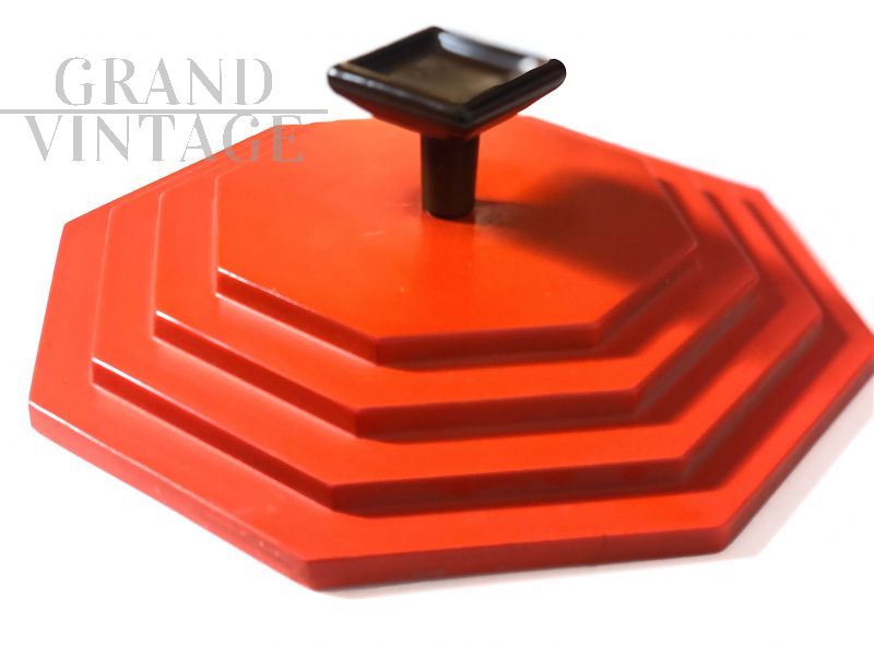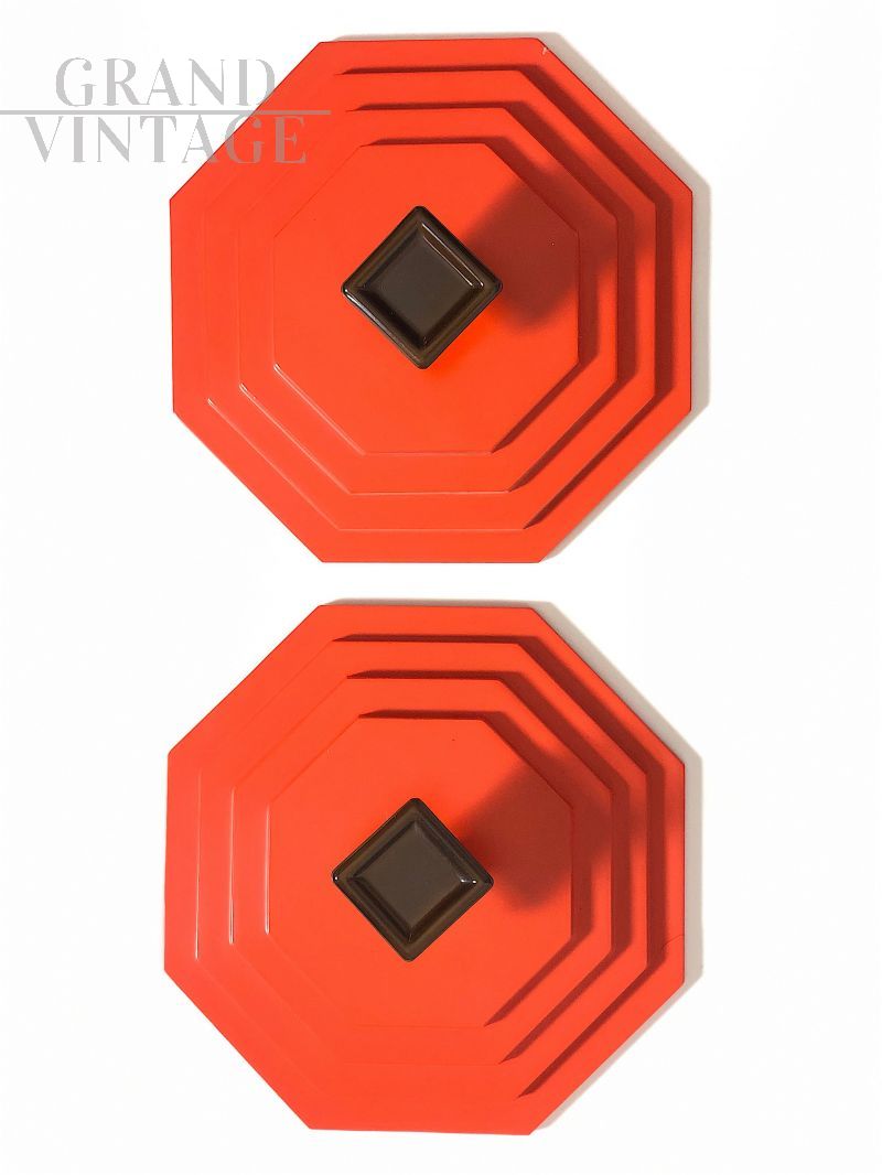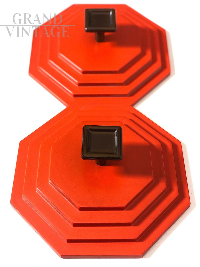 Splendido set di appendiabiti vintage colo arancione degli anni 70, dal design geometrico e futuristico ispirato allo style Spage Age. Di forma ottagonale a più livelli con un effetto tridimensionale, accentuato dal contrasto tra i colori e il pomello squadrato. Questi appendiabiti rappresentano un'icona del design pop anni '70, realizzati in plastica ABS rigida, perfetti per aggiungere un tocco retrò e originale. In condizioni perfette.