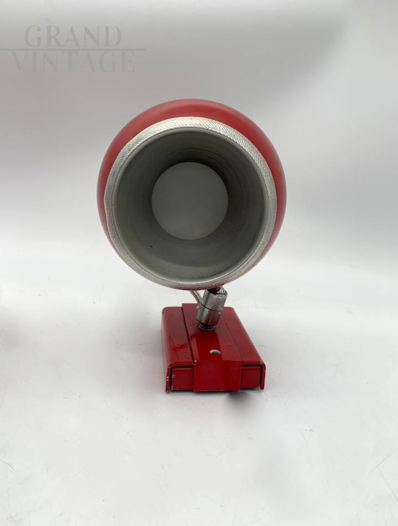 Fantastica coppia di applique vintage a faretto attribuite a Reggiani con struttura in ferro e lamiera laccata rossa con dettagli in ottone, Italia anni '70, in magnifico stile Space Age.