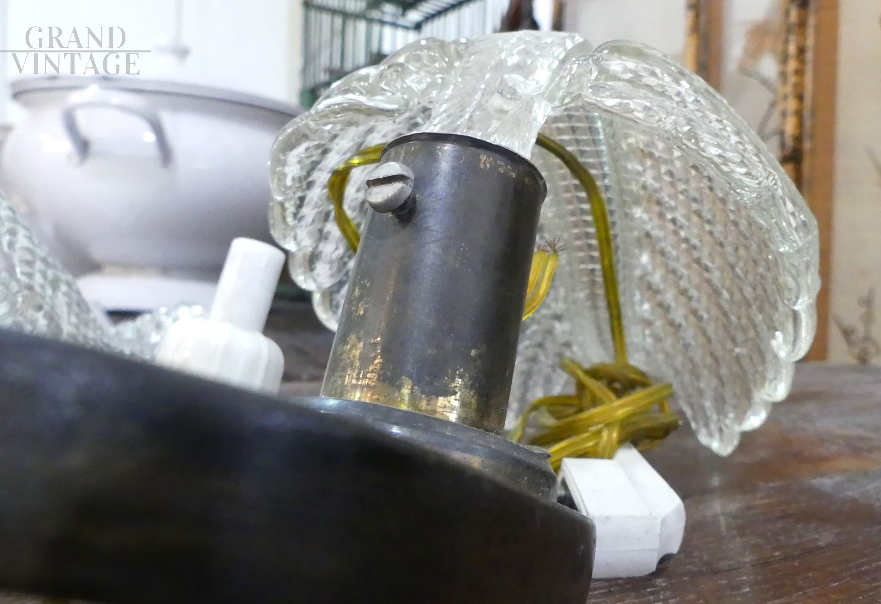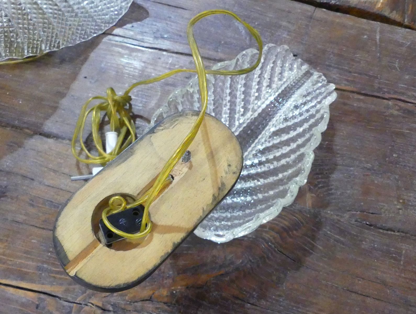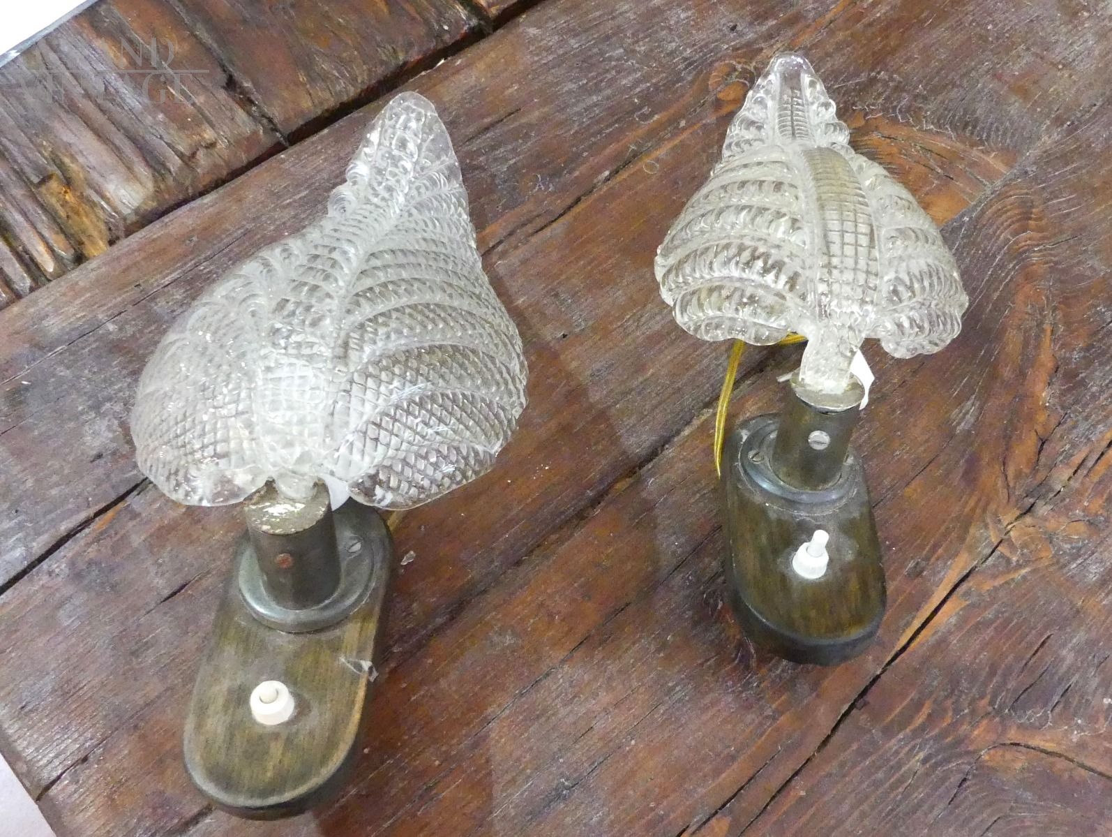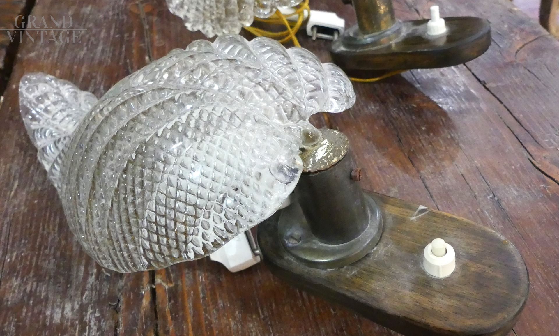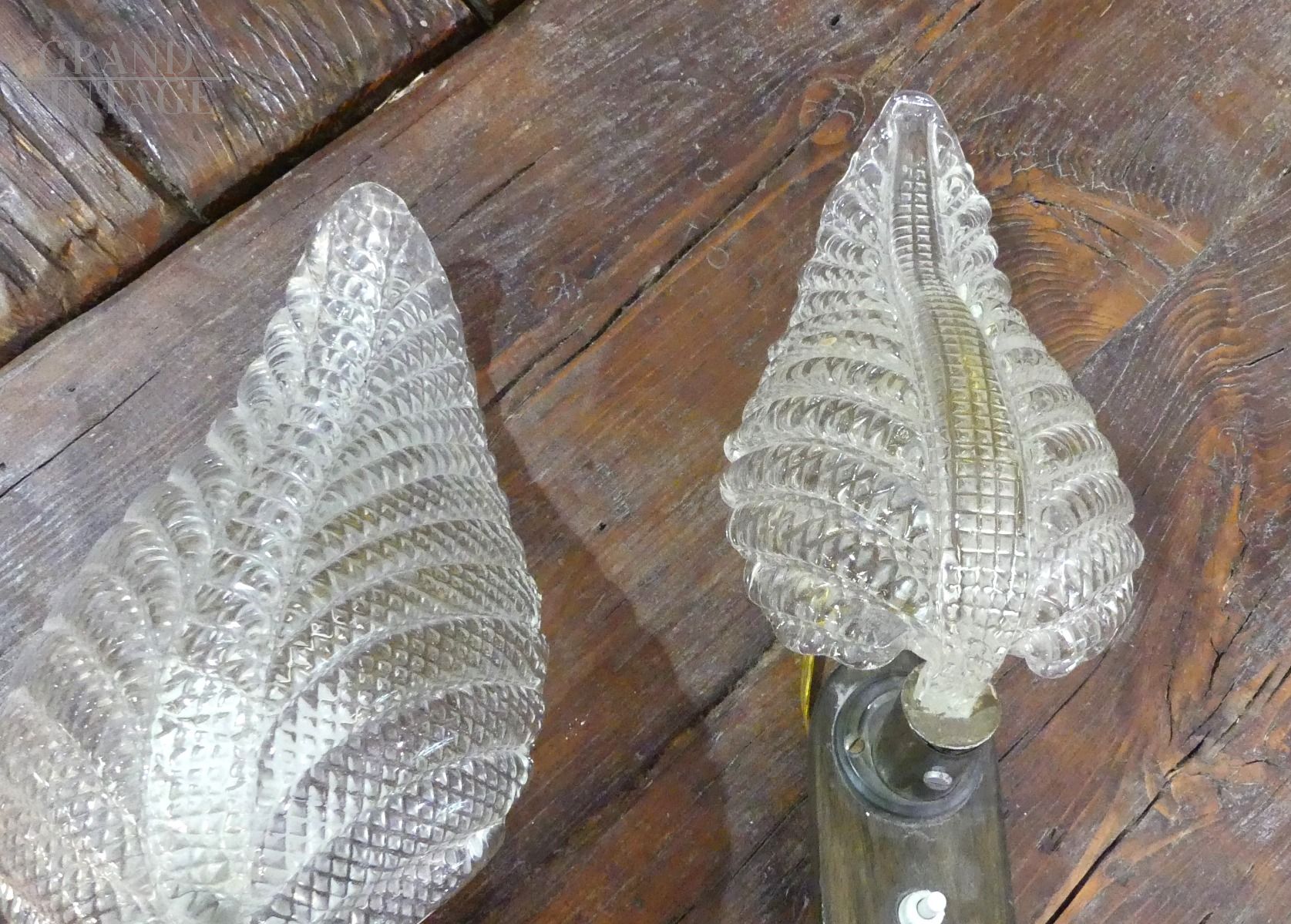 Bellissima e rara coppia di applique a foglia in vetro di Murano anni '30 attribuibili a Barovier. I vetri sono lavorati totalmente a mano, senza stampo, e sono di due forme diverse come si usava all'epoca, una applique femminile e una maschile. La struttura da fissare al muro è in legno dipinto in colore ottonato e ha un tastino per accensione e spegnimento, funzionante. Tra il vetro e la struttura in legno ci sono dettagli in ottone, con i naturali segni del tempo. Le lampade sono quasi certamente della ditta Barovier, non presentano il bollino perhè questo fu introdotto solo negli anni '60.