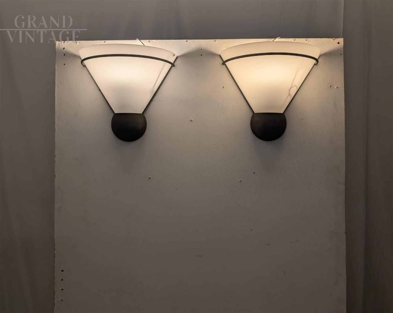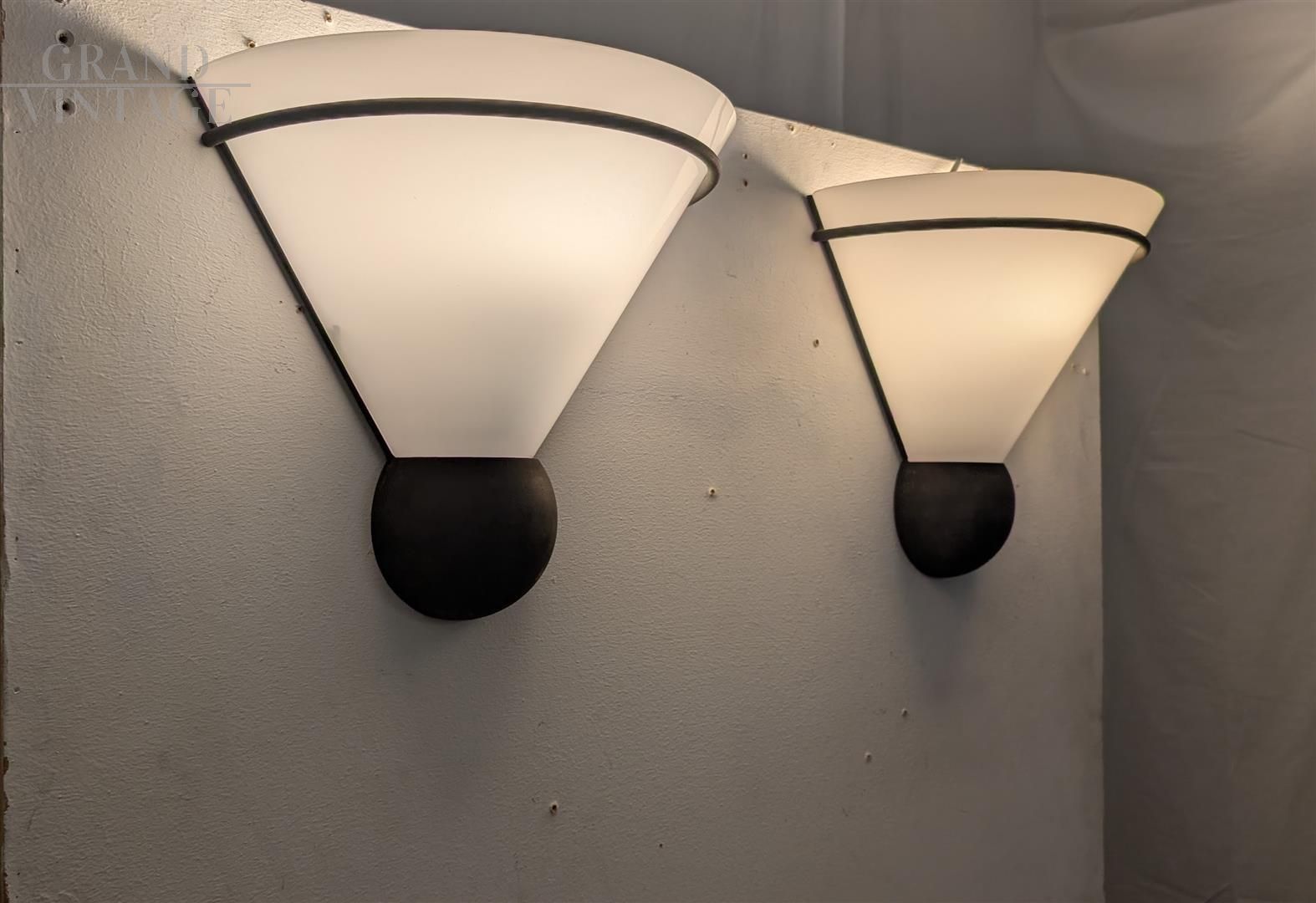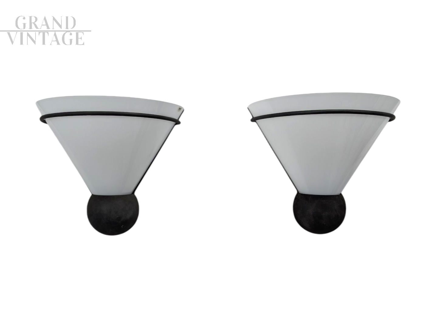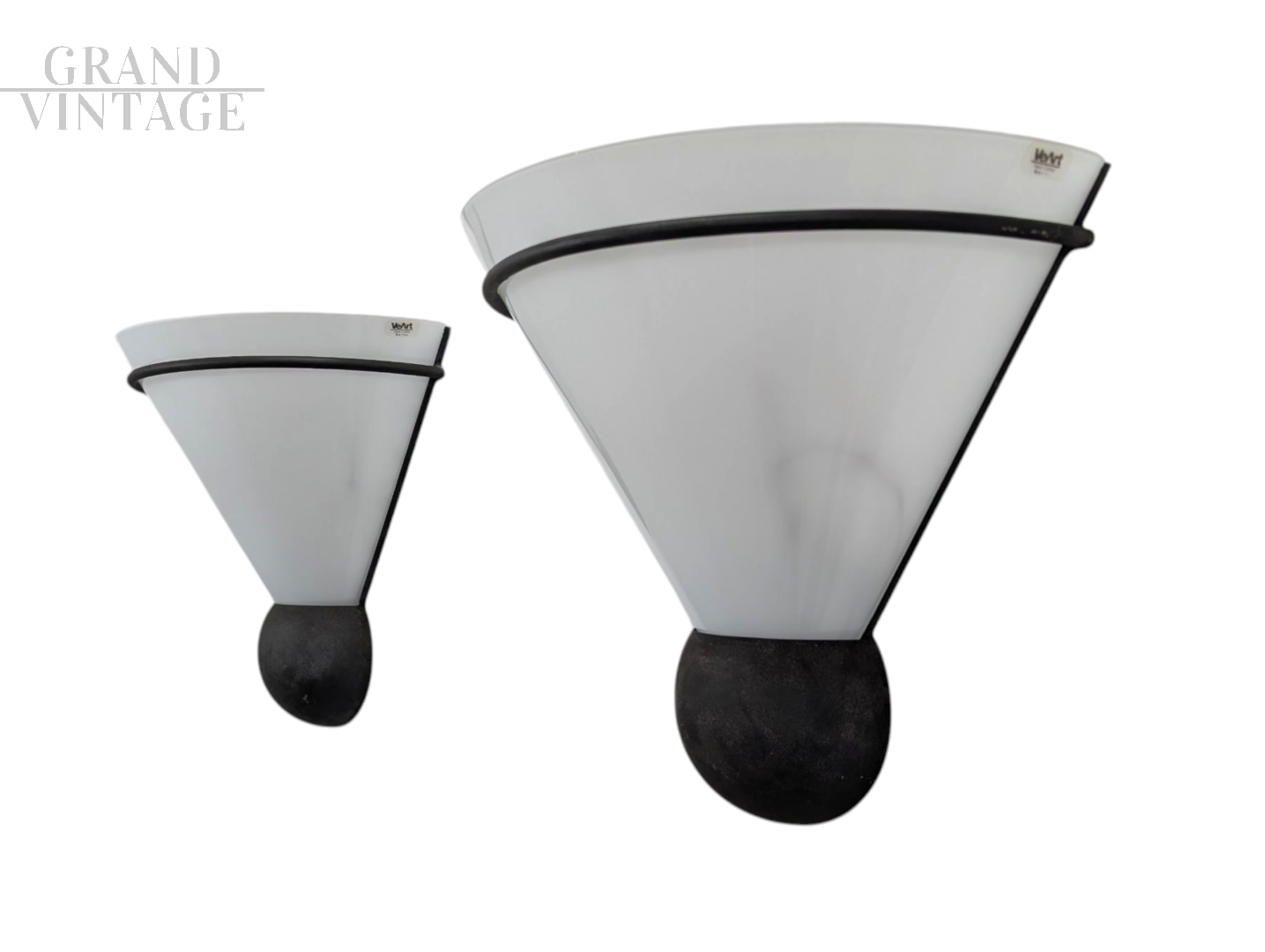 Elegante coppia di applique lampade da parete a cono in vetro di Murano opalino bianco e metallo nero, firmate VeArt, iconico marchio italiano noto per la produzione artigianale di vetro di Murano. Risalenti agli anni ’80, queste lampade si distinguono per il loro design geometrico e minimalista, perfetto per ambienti moderni, contemporanei o in stile vintage. E' presente l'etichetta originale del produttore. In buone condizioni vintage, con lievi segni del tempo sulla struttura metallica, coerenti con l’età e l’uso.