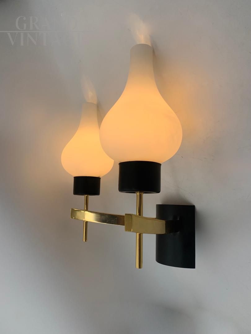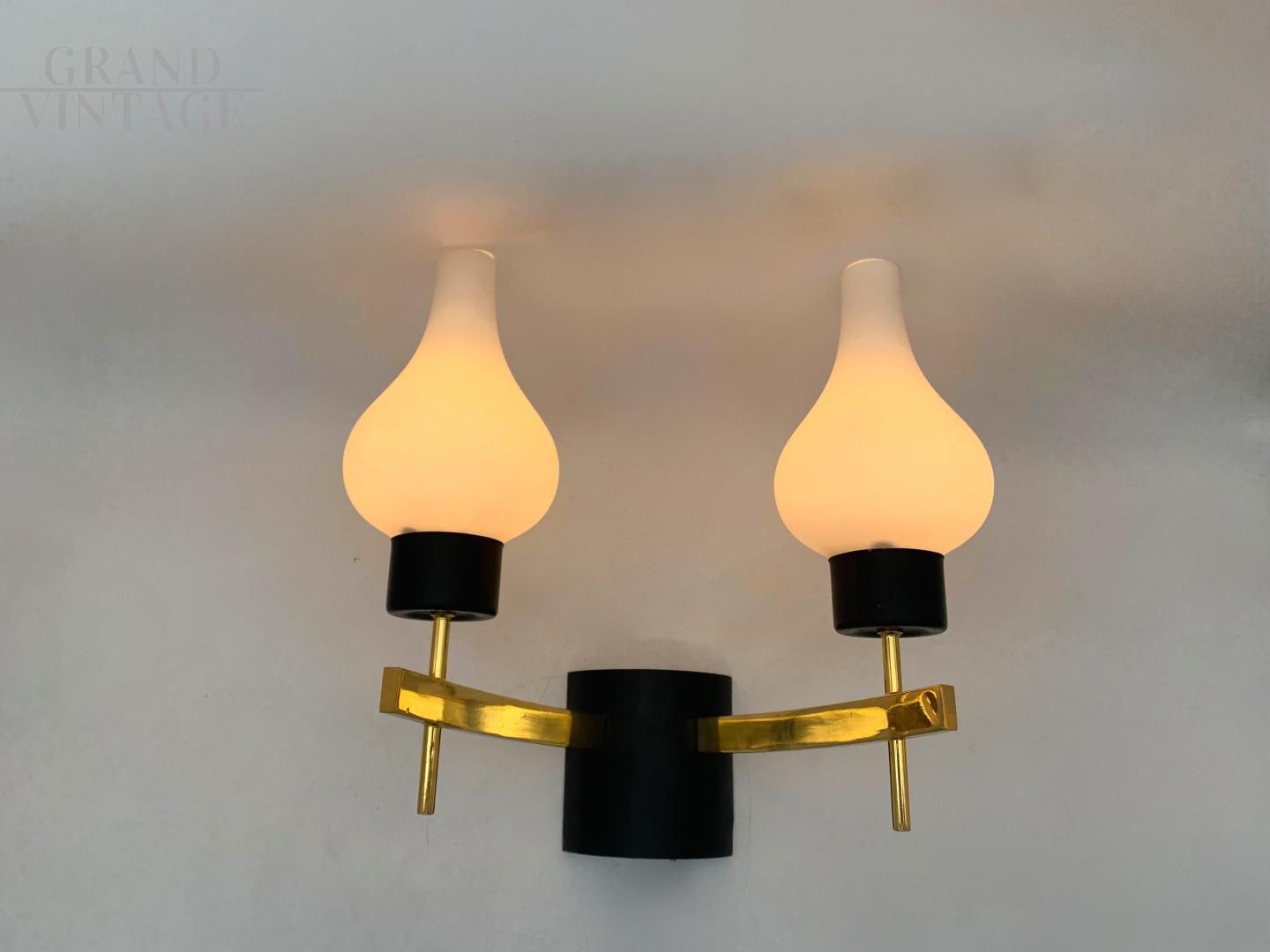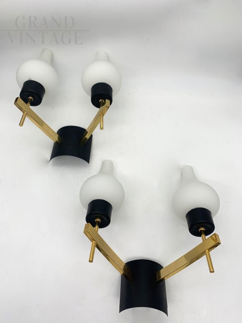 Coppia di appliques lampade da parete attribuite a Stilnovo molto particolari, ciascuna con due punti luce in vetro bianco latte su struttura in ottone e ferro laccato nero. Le applique sono in ottime condizioni, con pochi naturali segni del tempo e con vetri non crepati, e ciascuna ha impianto elettrico rifatto a nuovo con 2 attacchi per lampadine di tipo E14. Le parti in vetro possono essere rimosse dalla struttura per un trasporto più sicuro. Su richiestale lampade si possono preparare per l'impianto elettrico Americano.