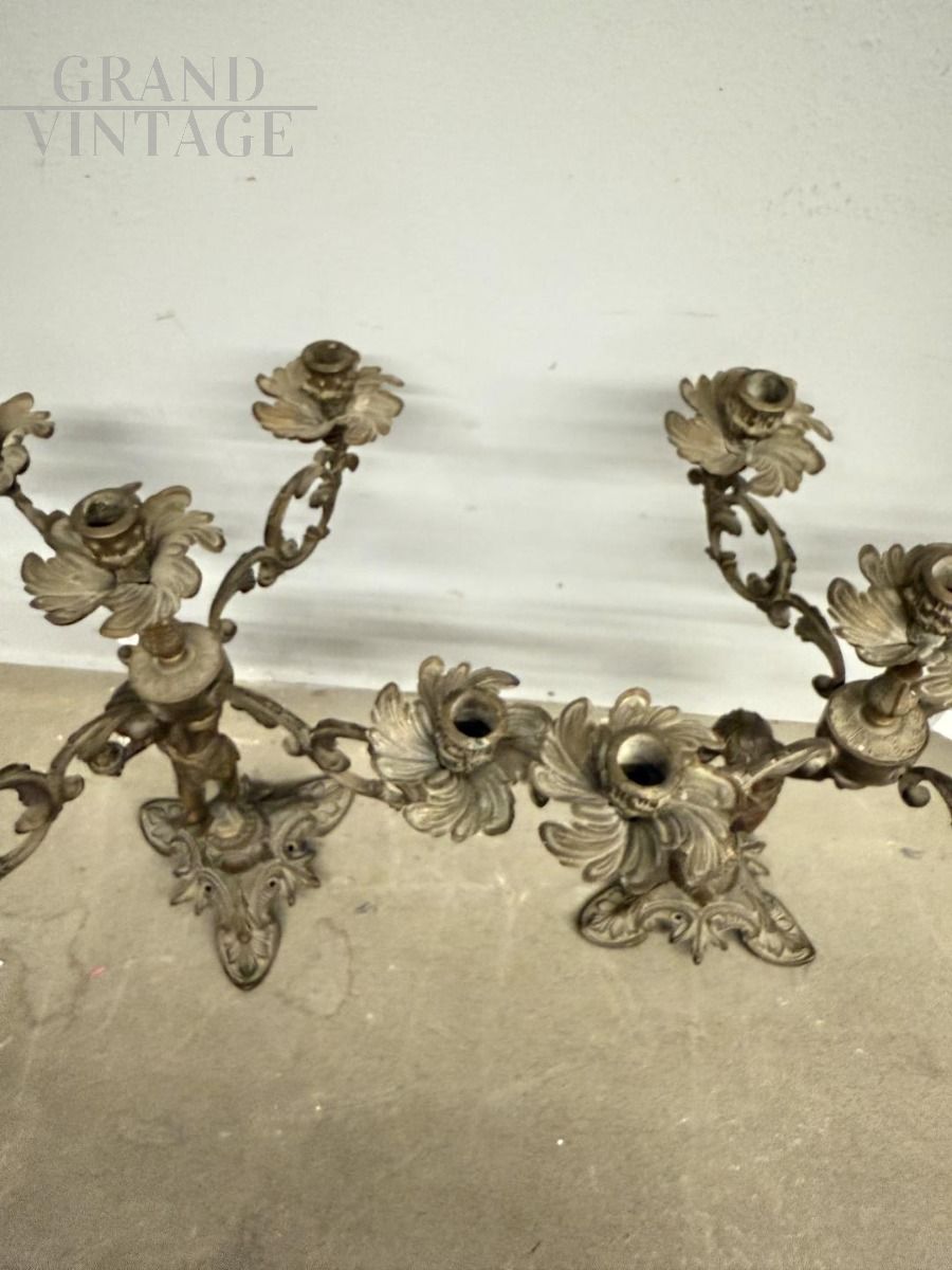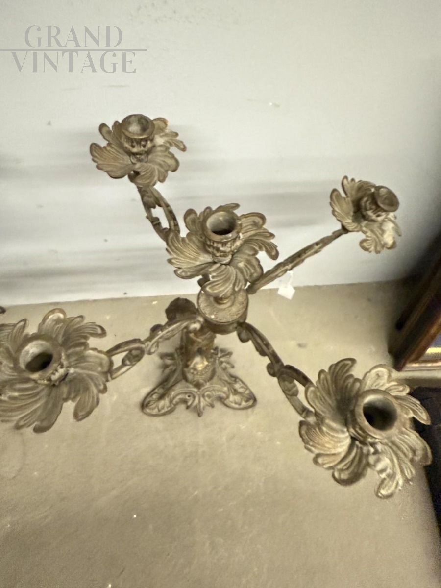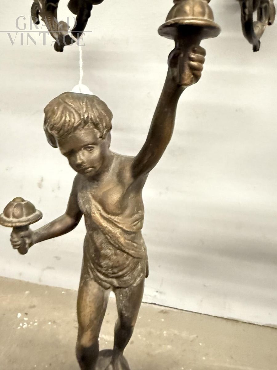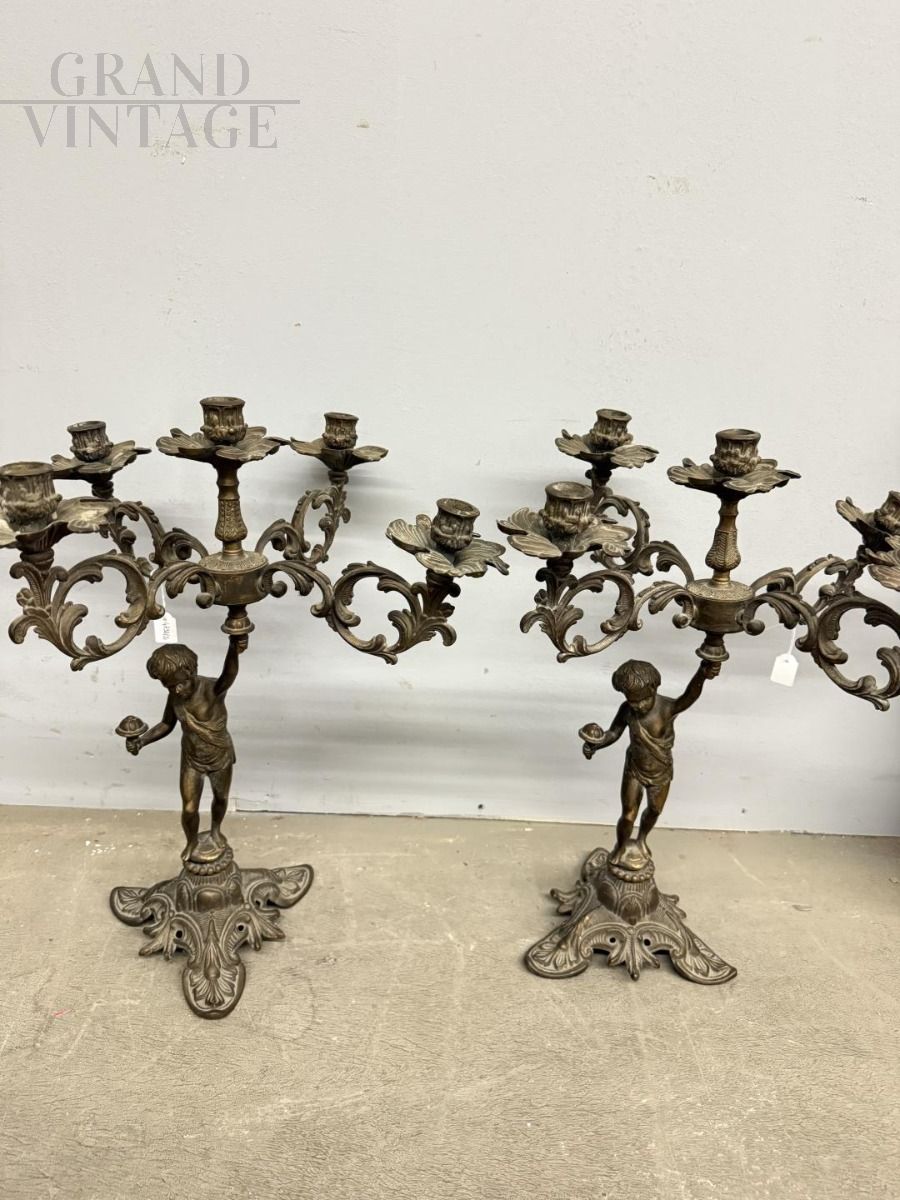 Coppia di candelabri in bronzo del '900 a cinque fiamme con putti