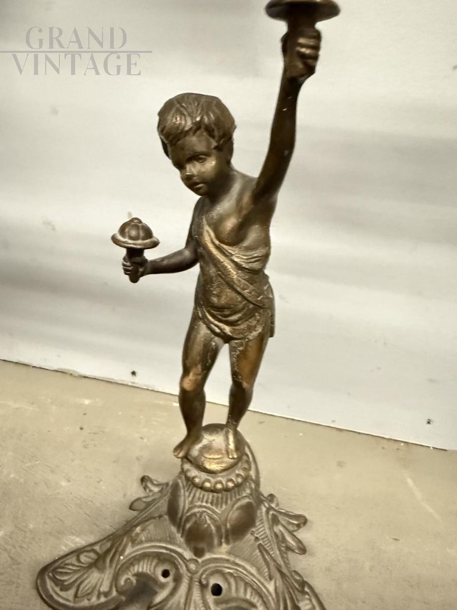 Coppia di candelabri liberty de primi del '900 in bronzo finemente cesellato con figure di fanciulli e 5 fiamme per candele, in ottimo stato, misure: 52 x 42 cm.