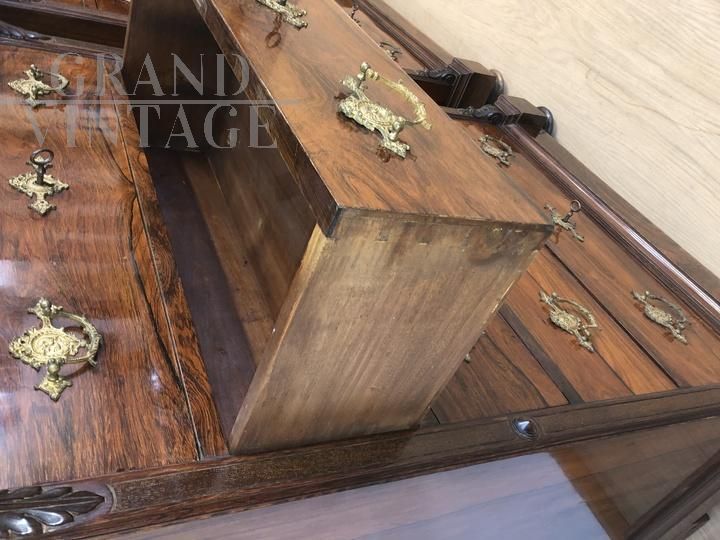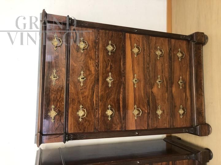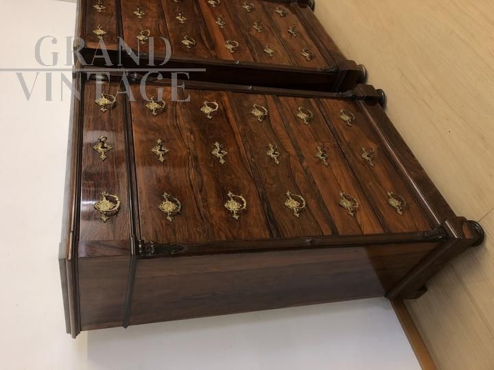 Elegante coppia di cassettiere settimanali antiche lastronate in legno di palissandro, realizzate alla fine dell'800, presentano una buona qualità di materiale e una ricca ferramenta, sul coperchio è presente il piano in marmo. In buone condizioni generali, necessita di qualche piccolo lavoro di restauro e di rifacimento di alcune maniglie mancanti.