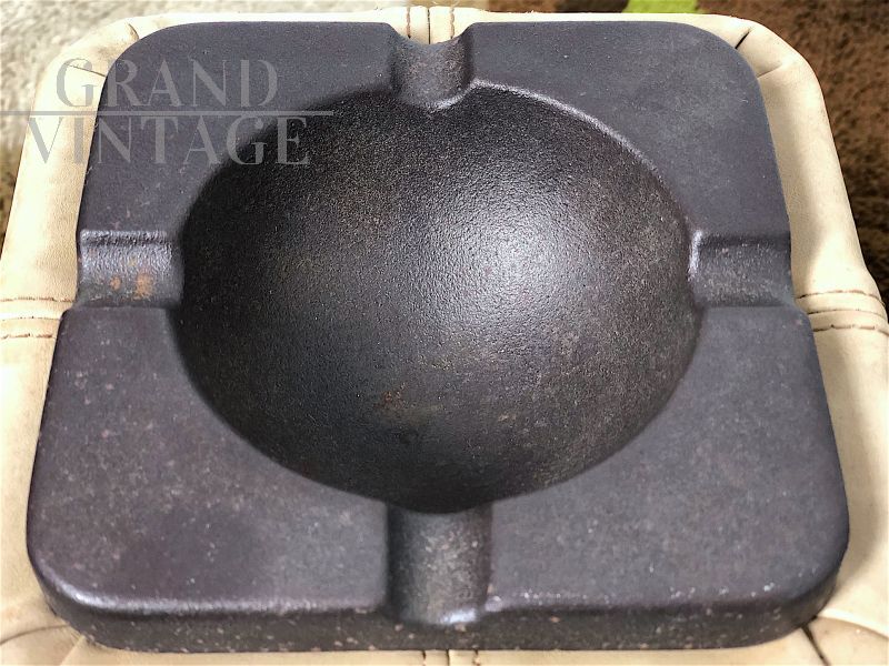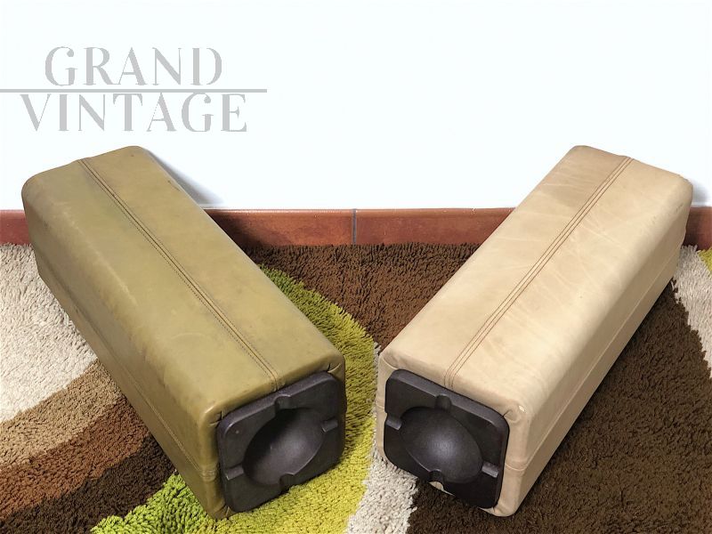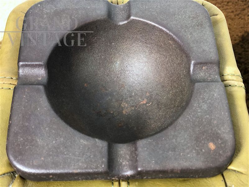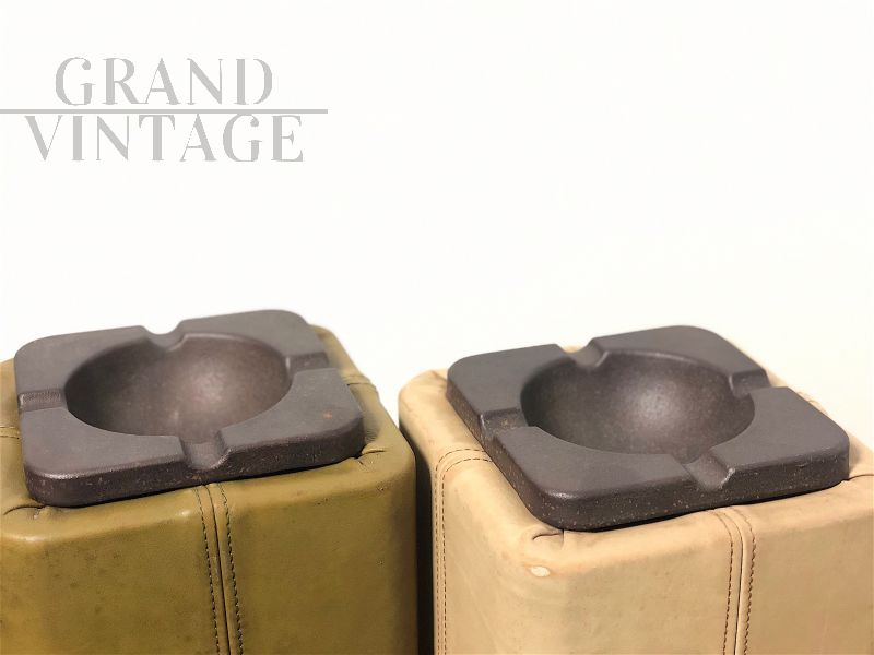 Elegante coppia di posacenere a colonna anni '70 dal design unico, caratterizzati da un rivestimento in pelle e posacenere in ghisa. Oggetti dal forte carattere decorativo, la loro forma e l'utilizzo della ghisa rimandano a uno stile brutalista. Entrambi si presentano in buone condizioni, con normali segni del tempo che ne testimoniano l'autenticità: negli anni '70 si sperimentava con materiali e design geometrici per creare oggetti funzionali ma anche decorativi. In ottime condizioni.